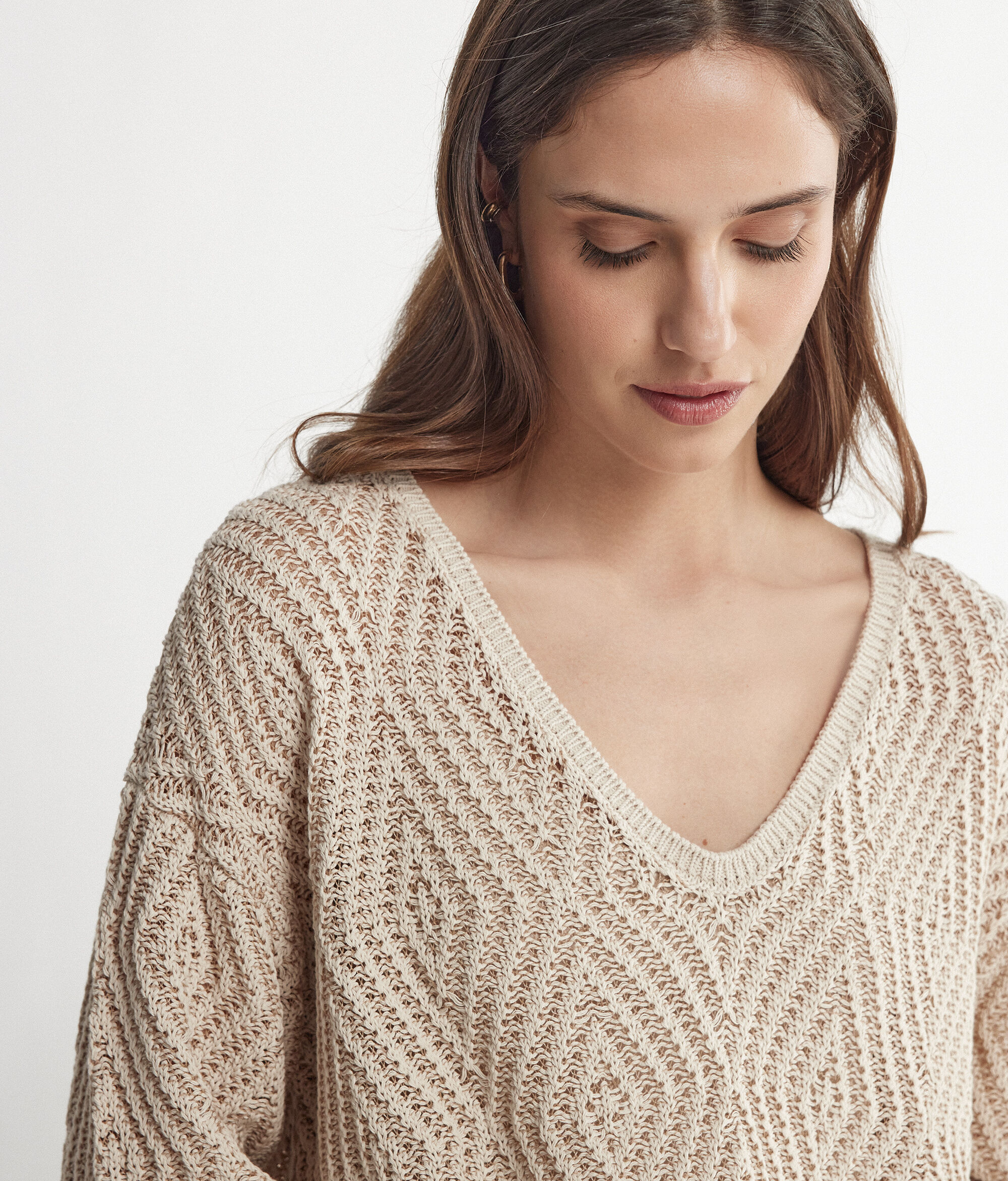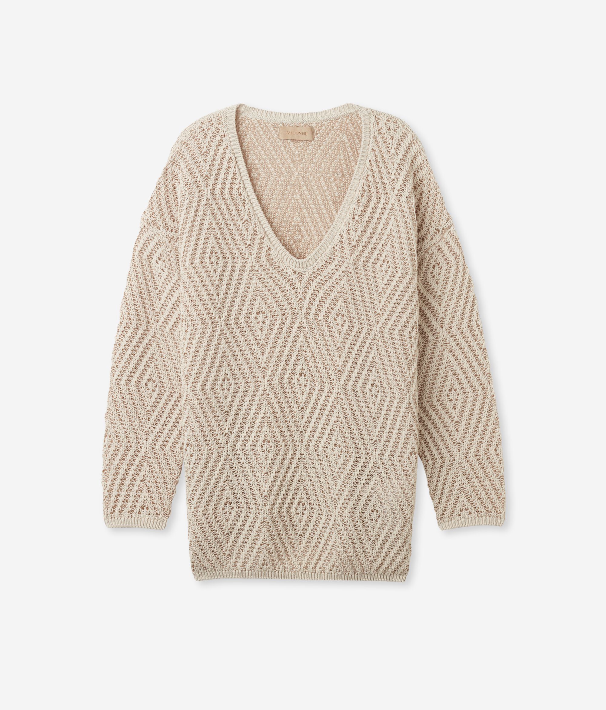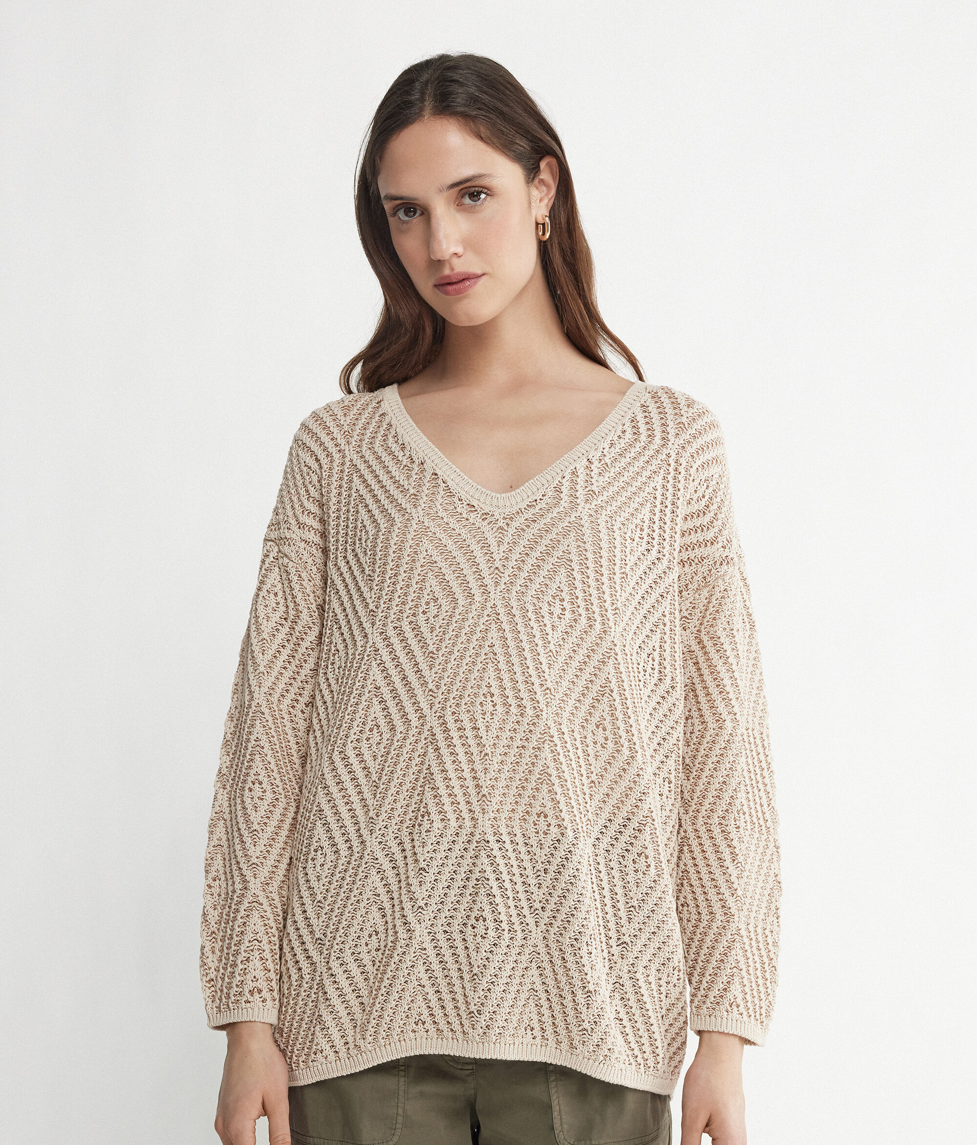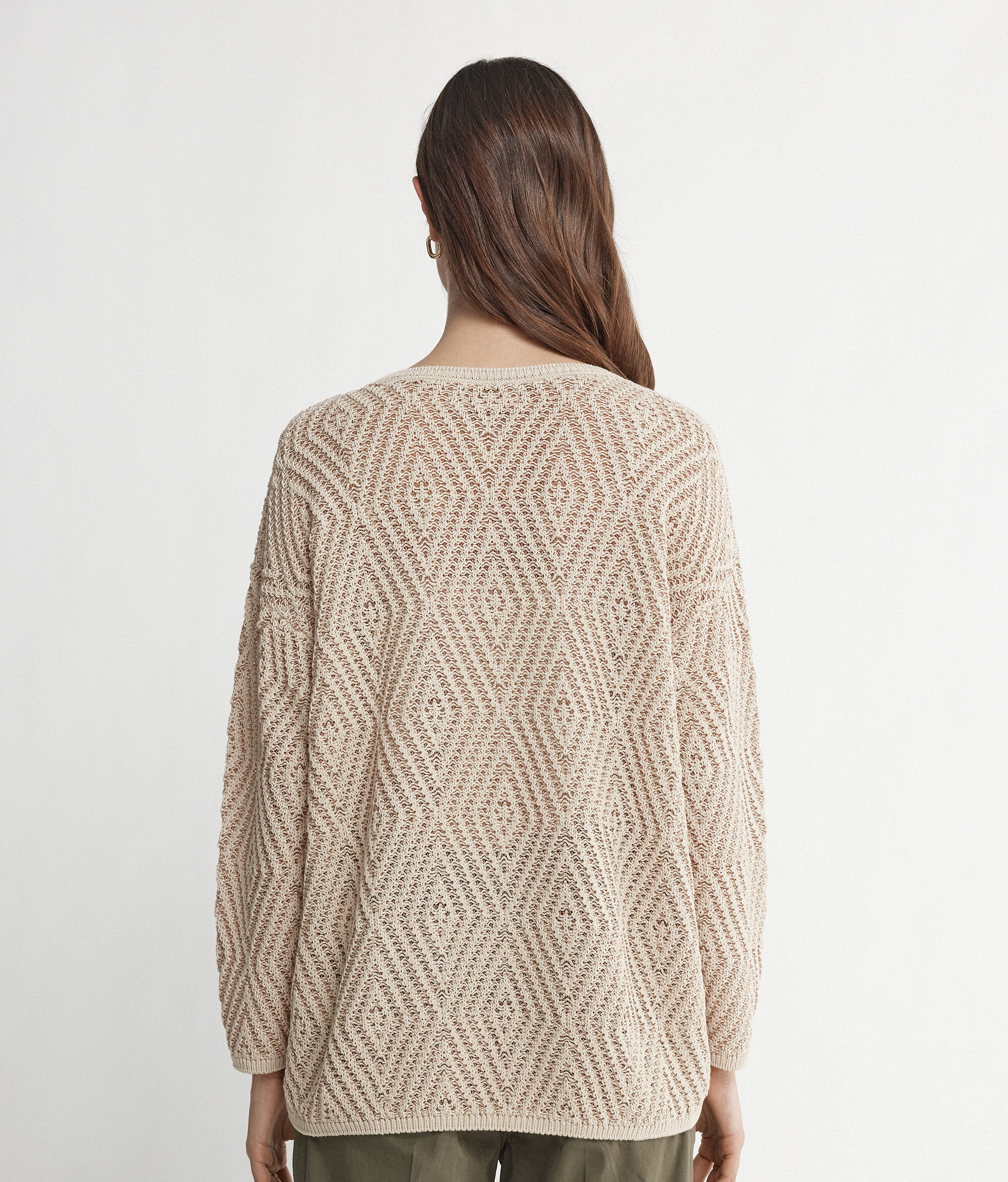 The brand's love of detail is expressed to the max in this kimono sweater. The diamond pattern in the cotton and the ribbed trim give the garment a marked sense of femininity and timelessness.