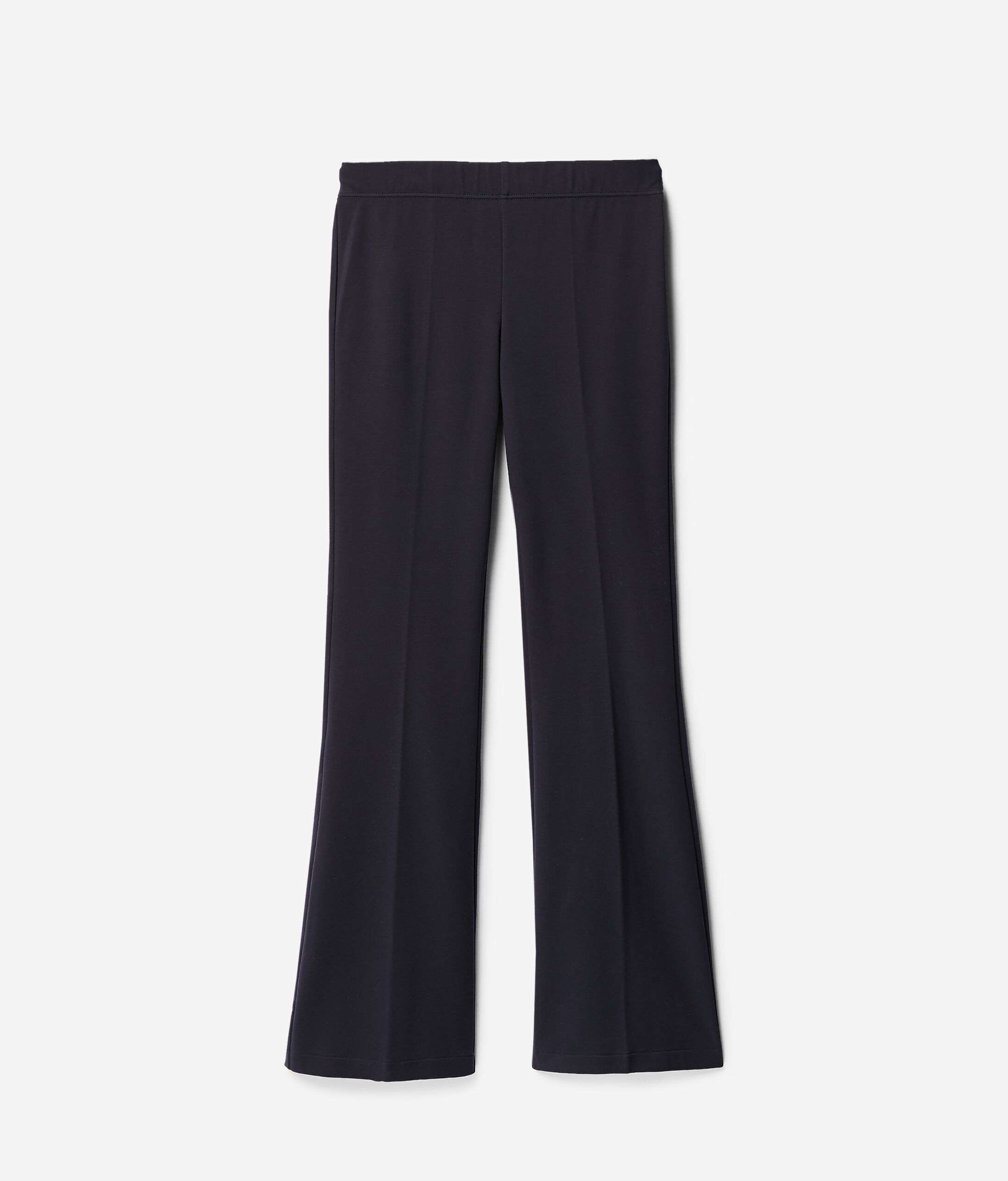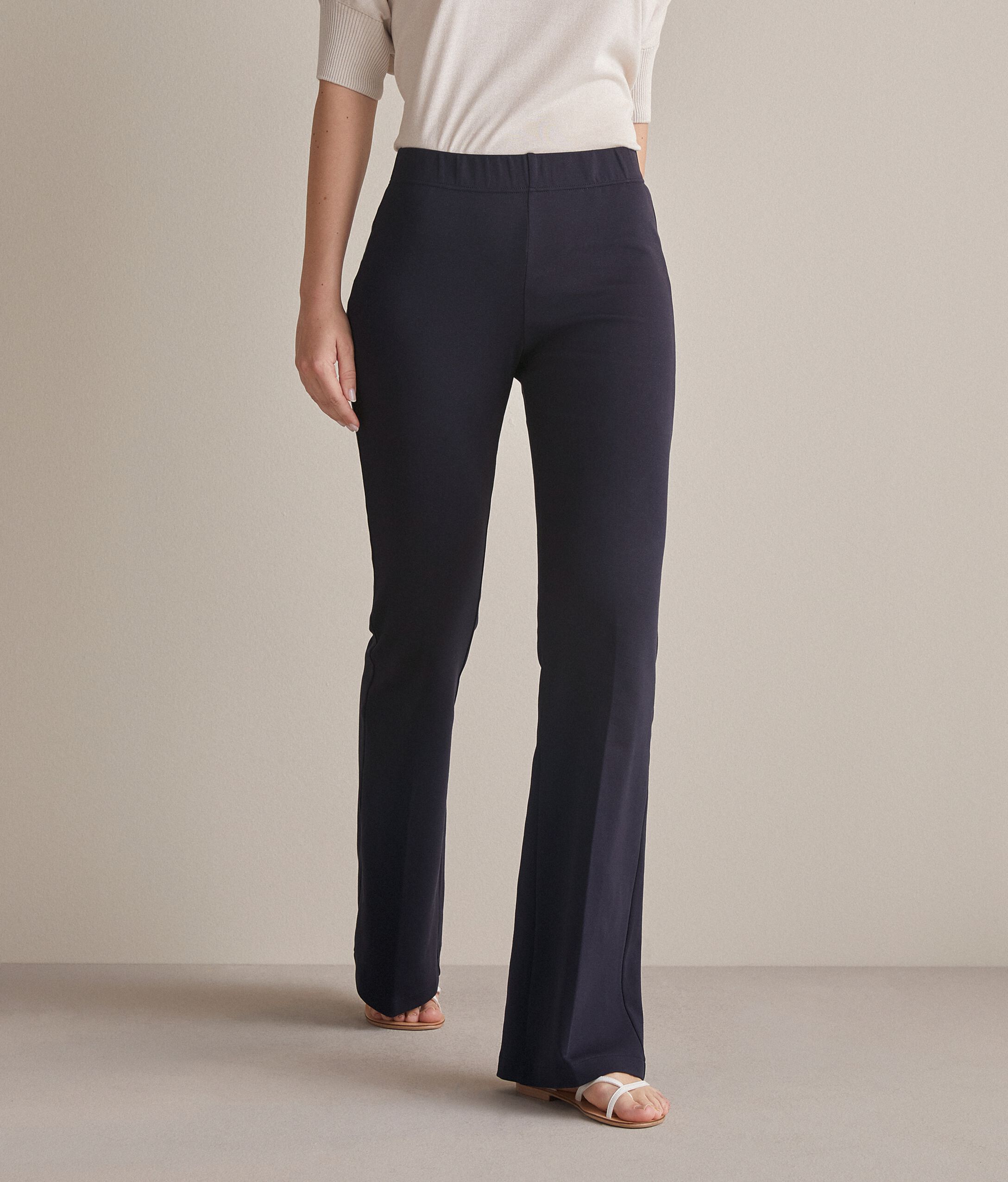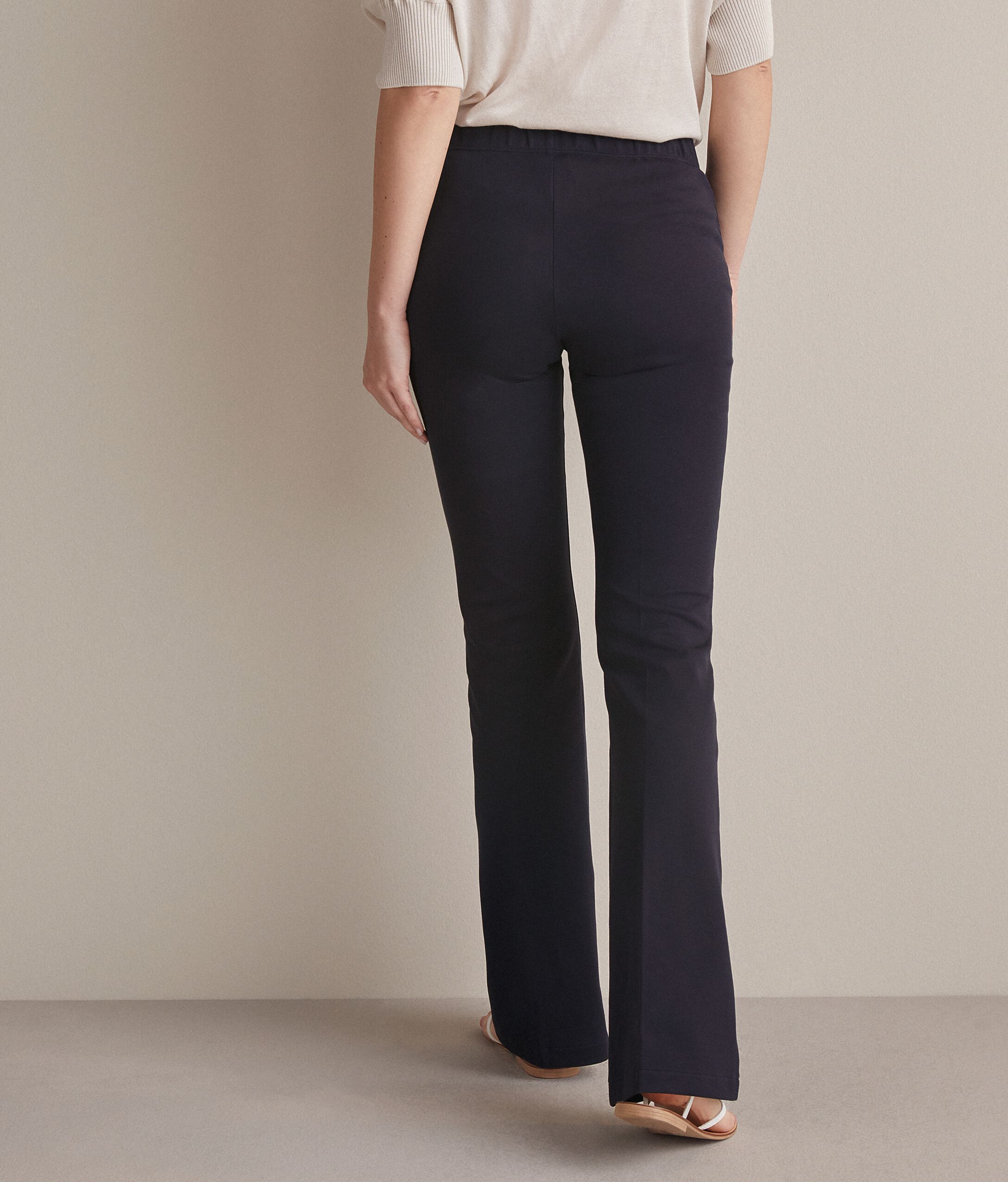 The natural freshness of the slightly elasticated cotton is paired with a modern style. These flared trousers are perfect for women who love to turn heads with a captivating, dynamic look. The waist is enhanced by an elasticated belt that gives a comfortable embrace. Model is 179 cm tall and wears a size M Chest: 88cm / Waist: 67cm / Hips: 94cm