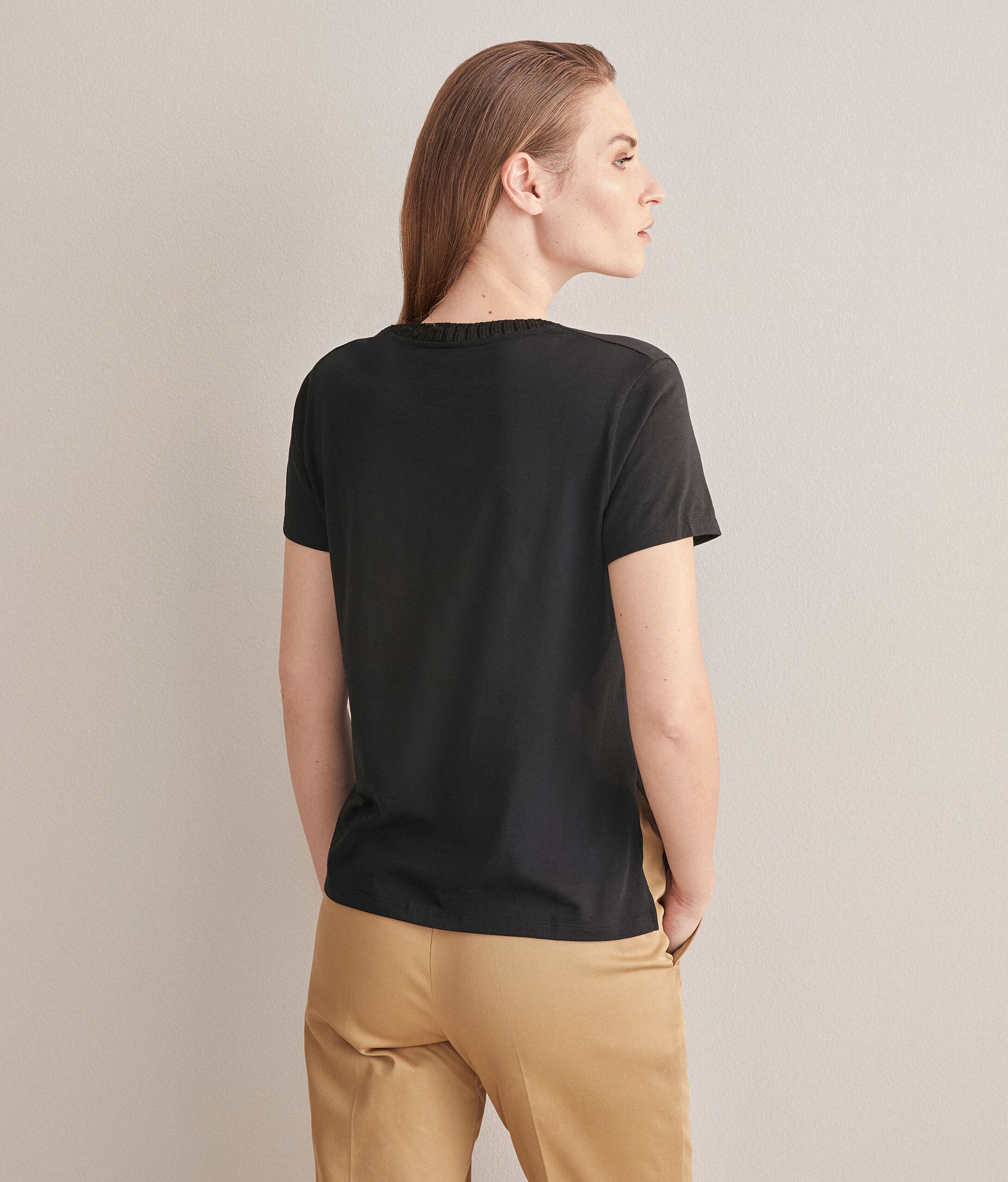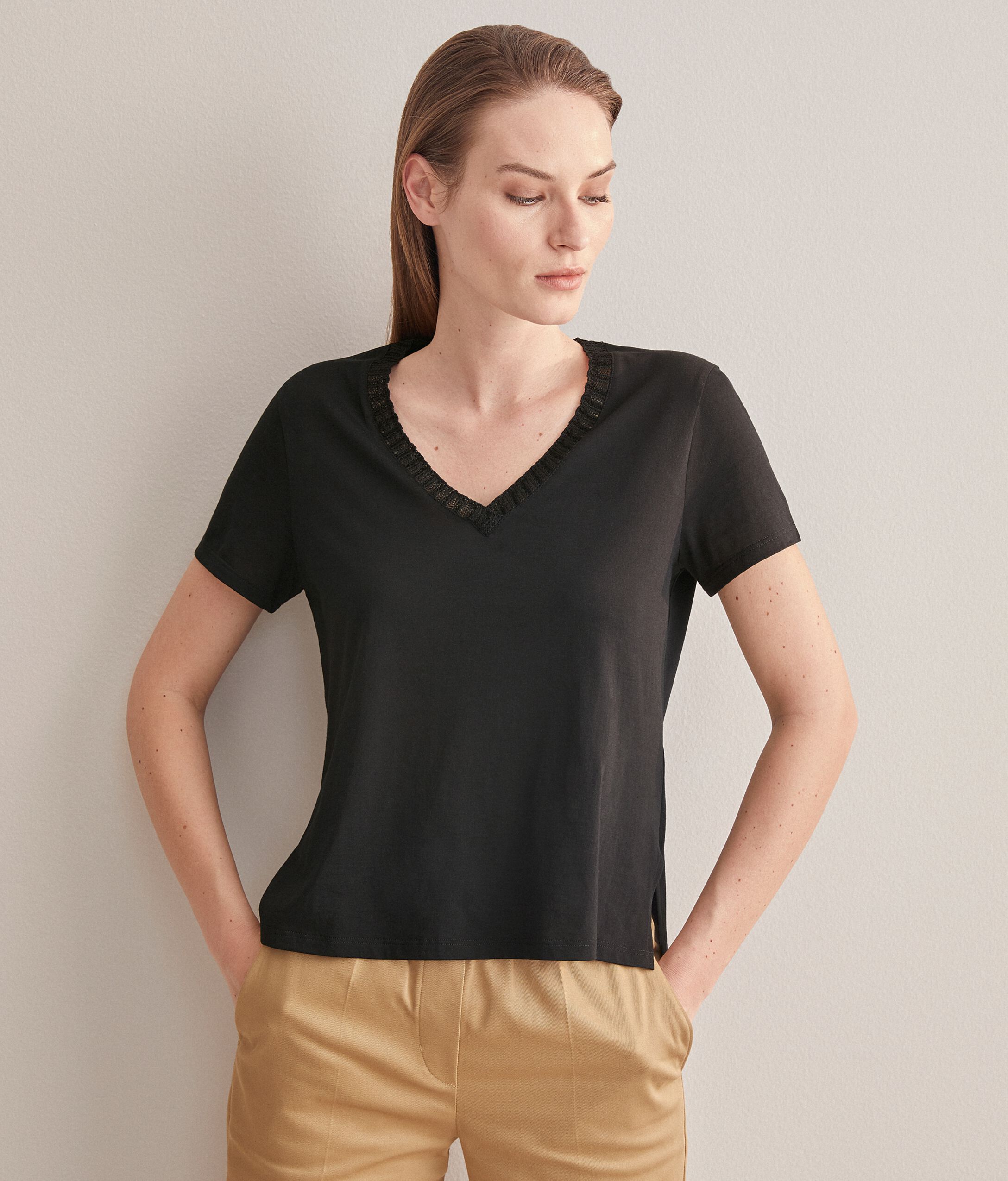 Silk and Cotton T-Shirt with Crochet V-Neck