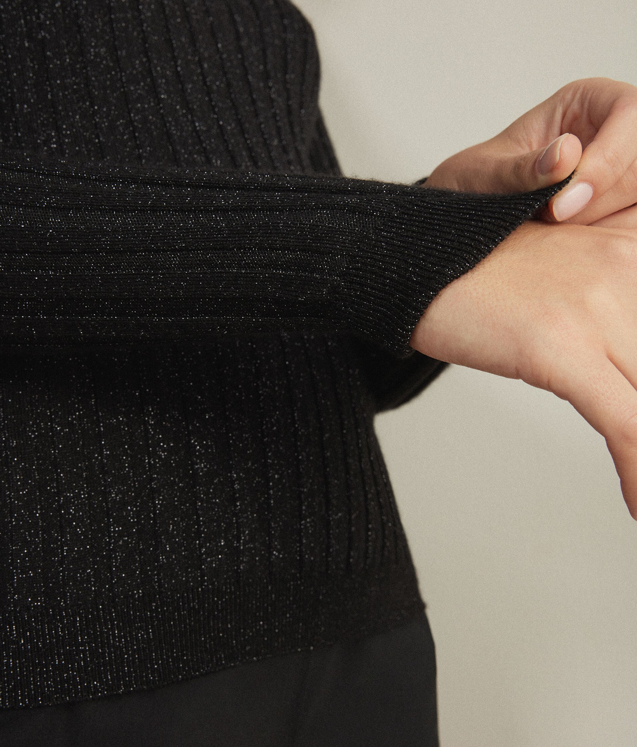 Gerippter Rollkragenpullover aus Kaschmir Ultrafine und Lamé-Garn mit langen Ärmeln.