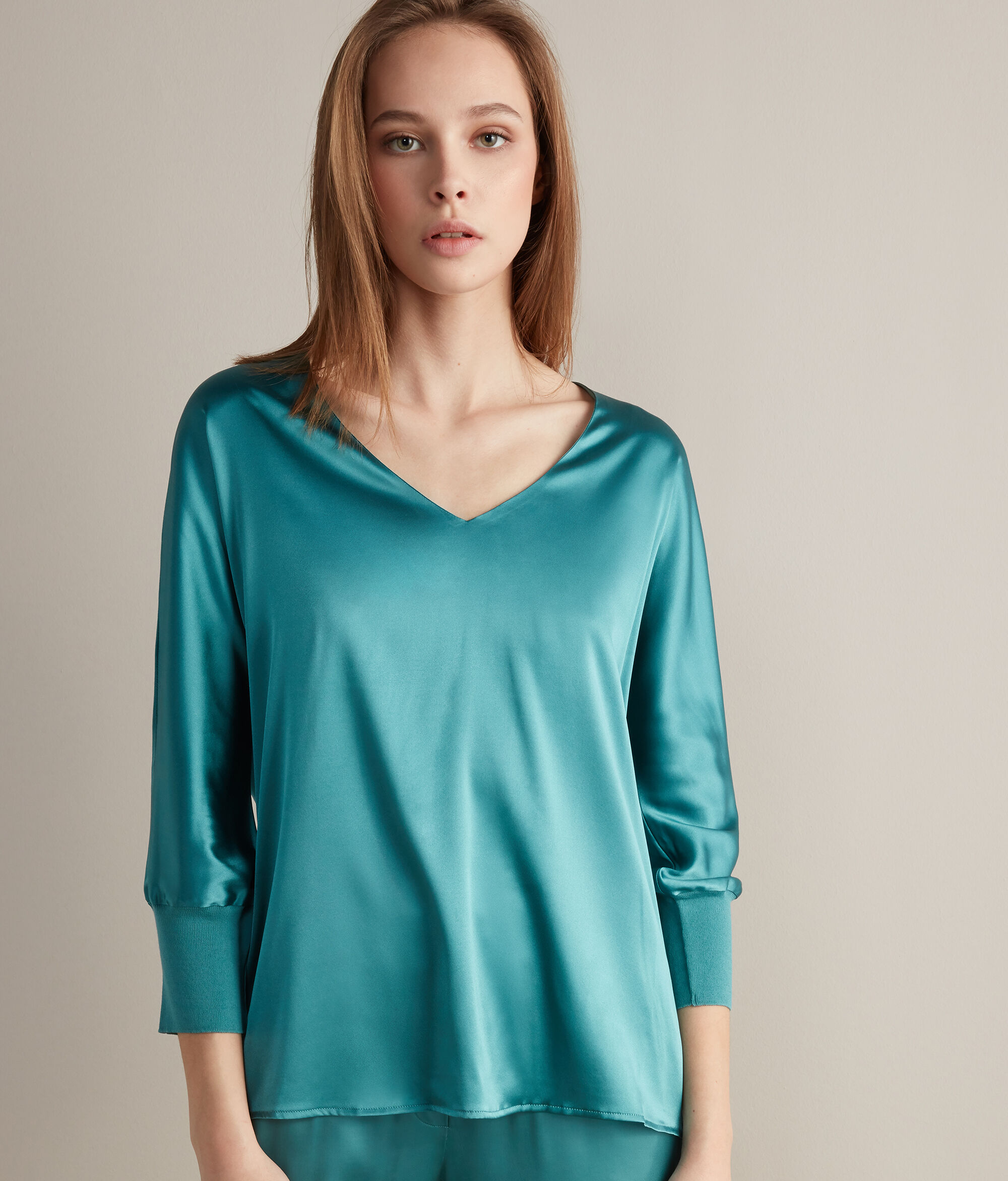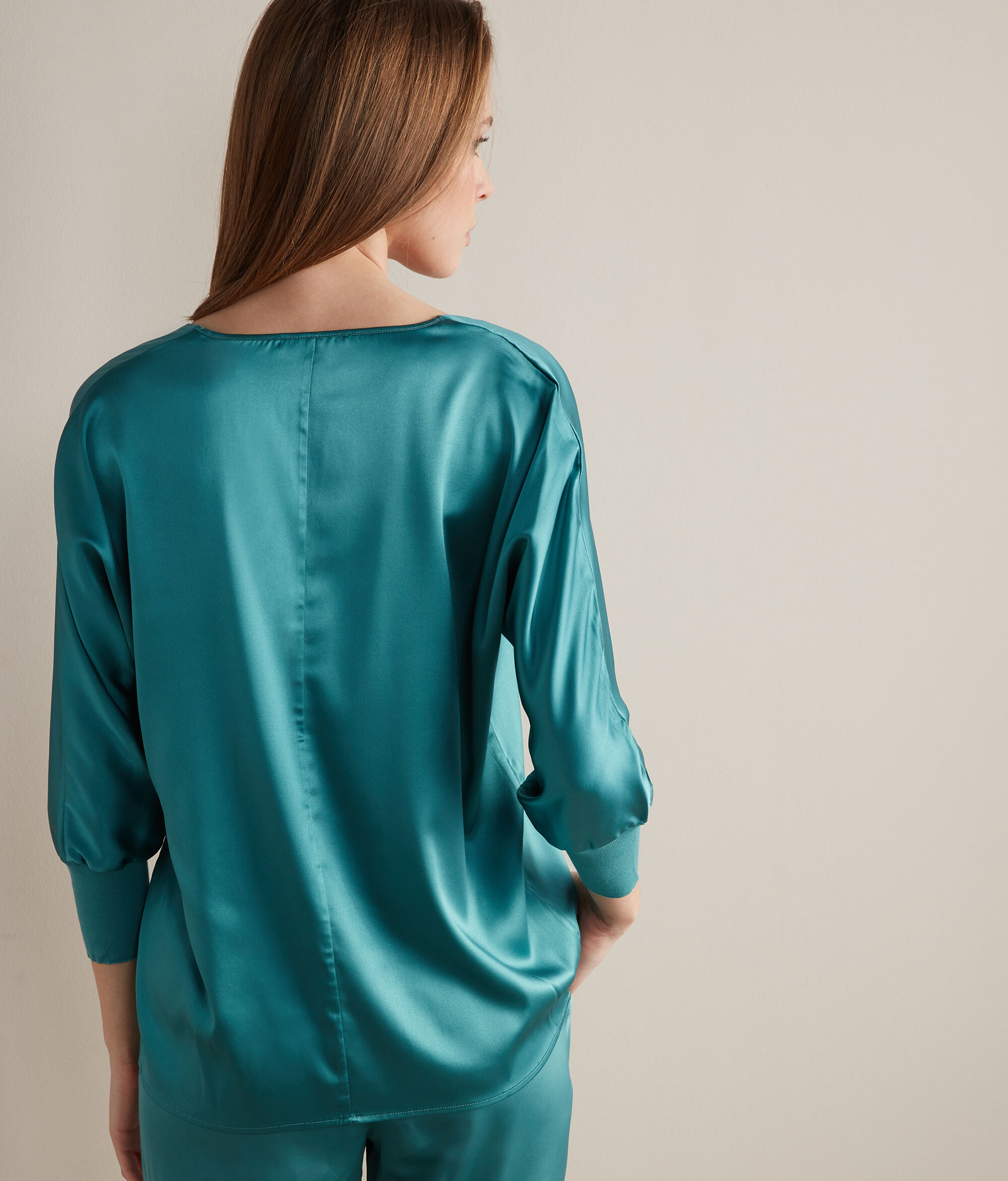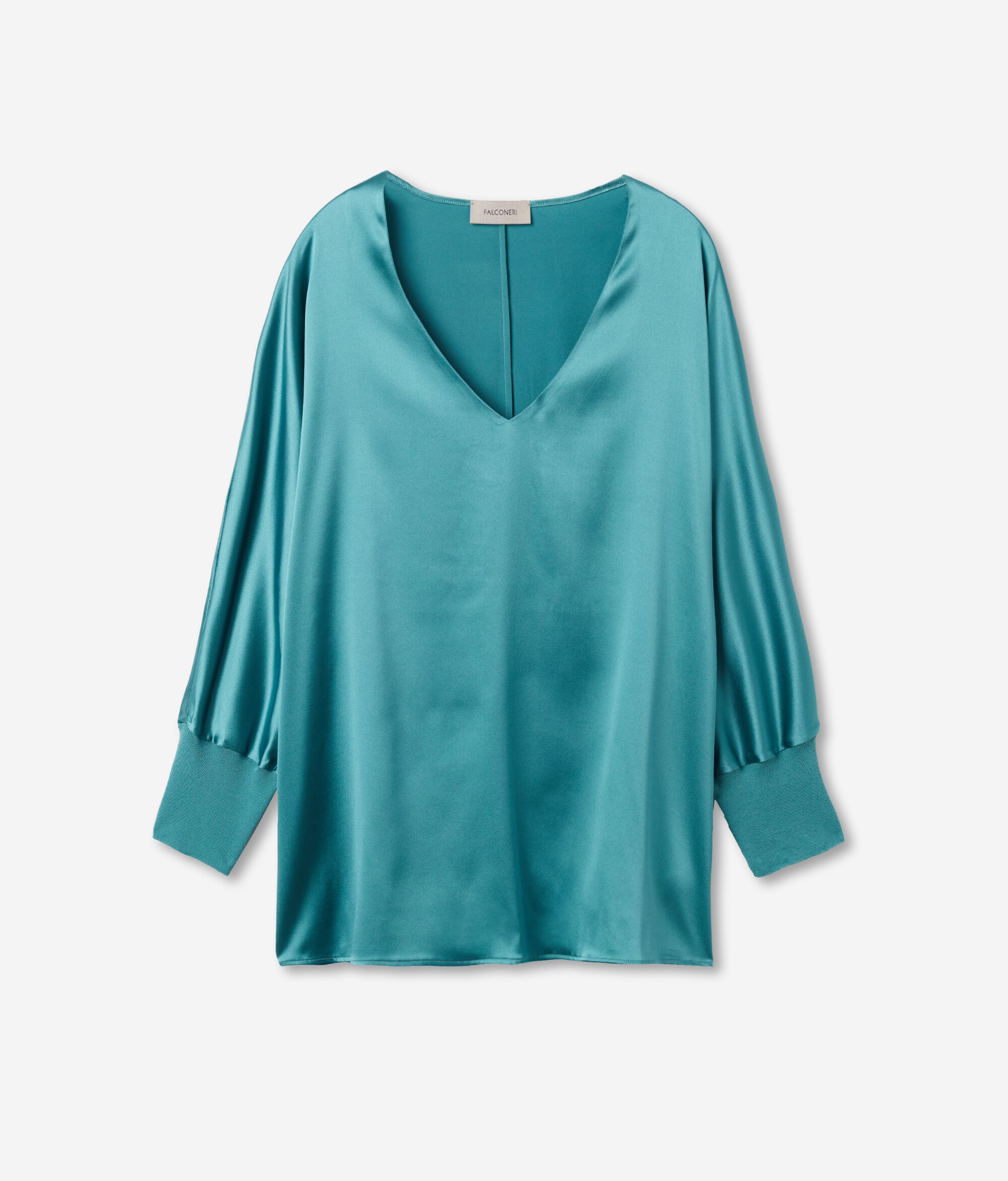 Těm, které hledají sofistikovaný look ozvláštněný stylovými detaily, Falconeri nabízí tuto halenku cele vyrobenou z hedvábného atlasu, umně navrženou tak, aby podtrhla měkké linie tkaniny. Díky objemnějším a splývavým liniím se příjemně nosí a je ozvláštněna stylovými krejčovskými detaily v podobě manžet z bavlněného úpletu a výstřihu do V.