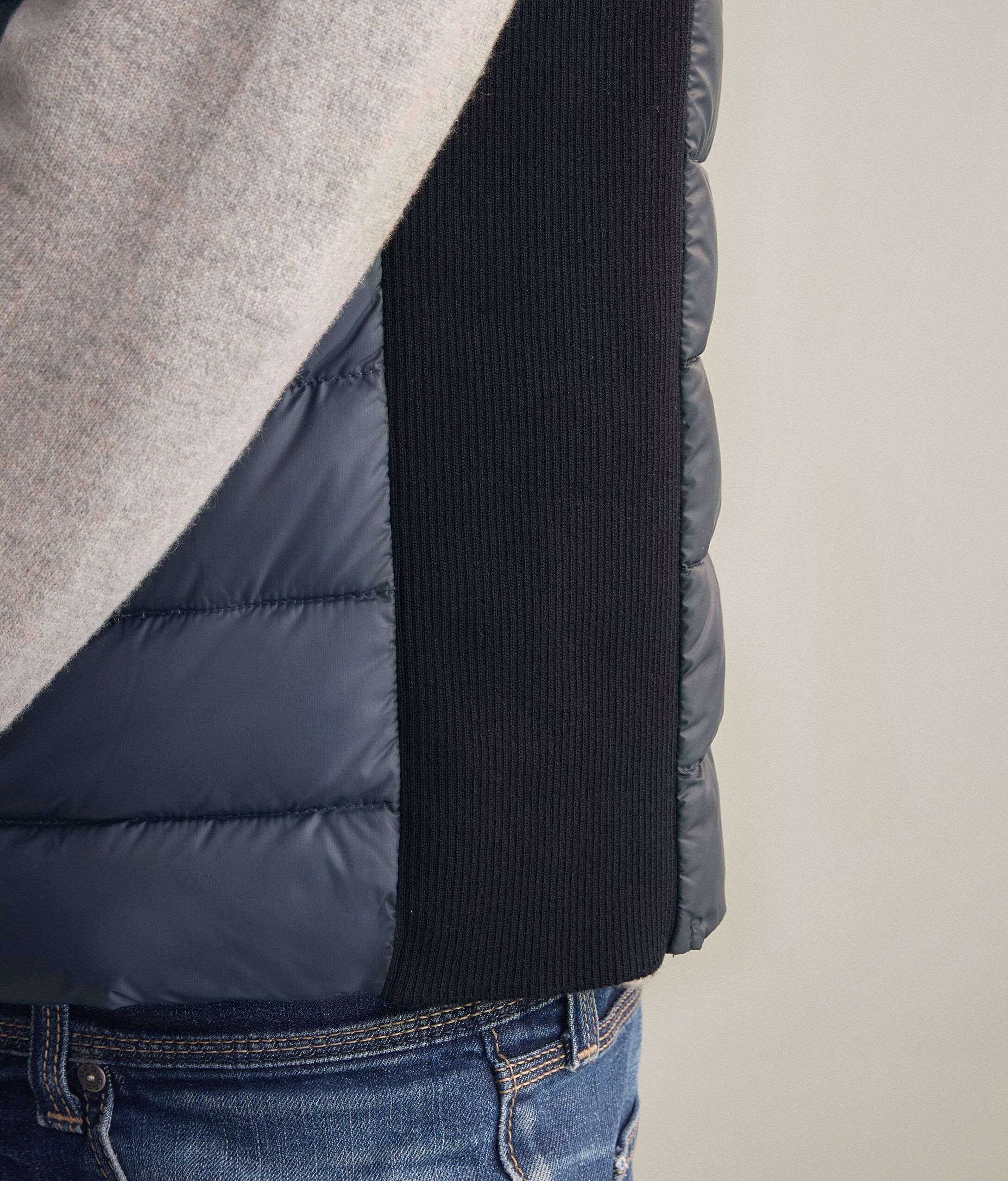 Weste mit Füllung aus Gänsedaunen, kleinem Kragen und seitlichen Rippstrickeinsätzen aus Merinowolle. Bitte beachten Sie, dass dieses Kleidungsstück kleiner ausfällt. Wir empfehlen Ihnen daher, es eine Größe größer zu bestellen. Das Model ist 184 cm groß und trägt die Größe LBrustumfang: 98 cm / Taillenumfang: 82 cm / Hüftumfang: 99 cm