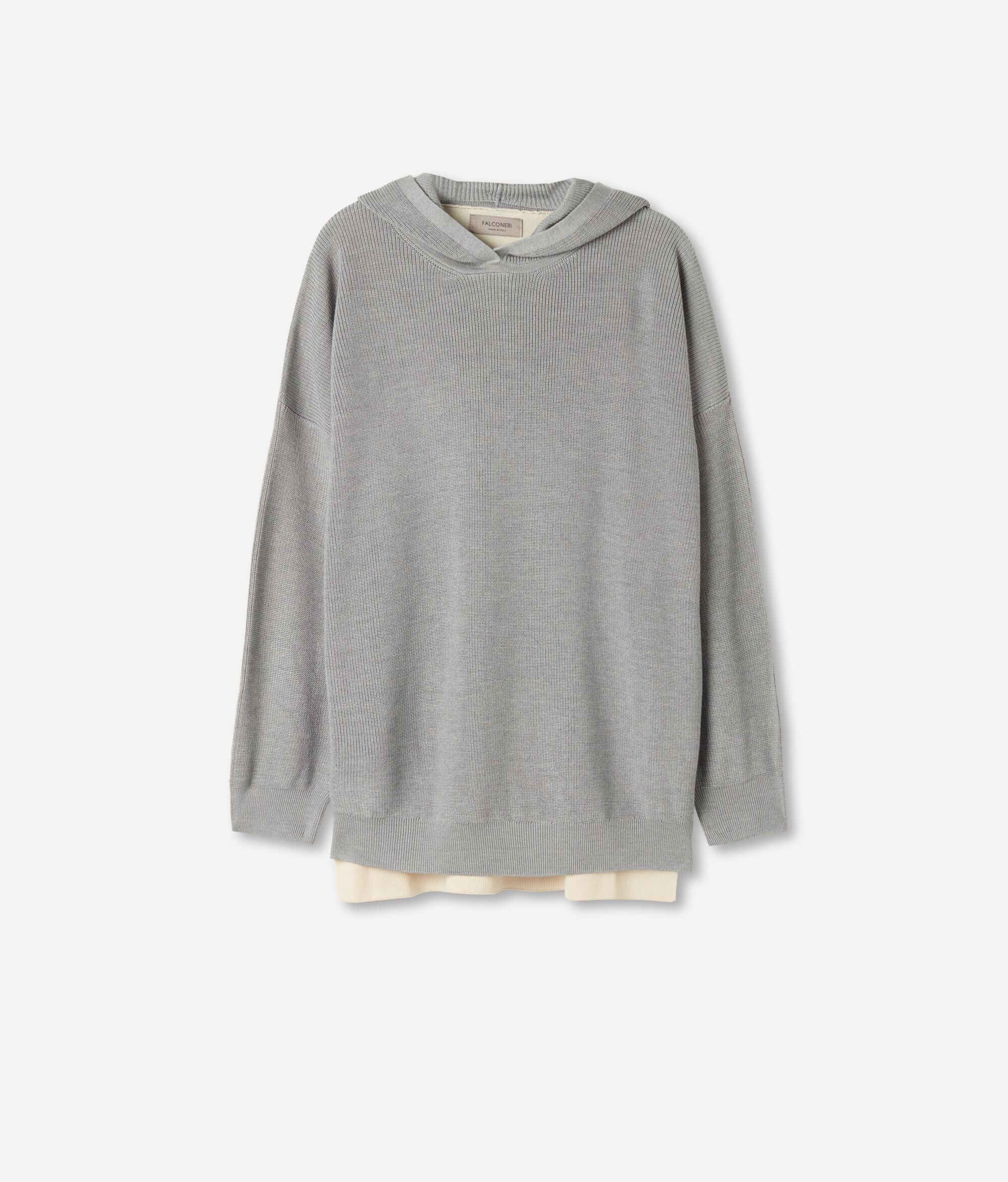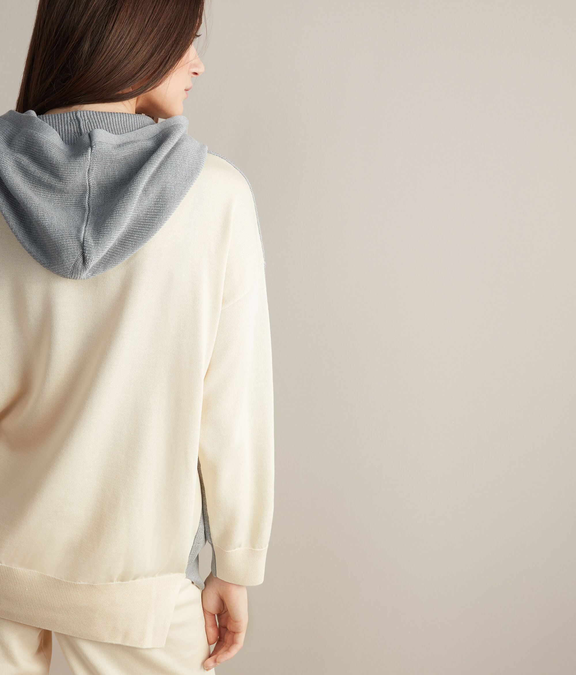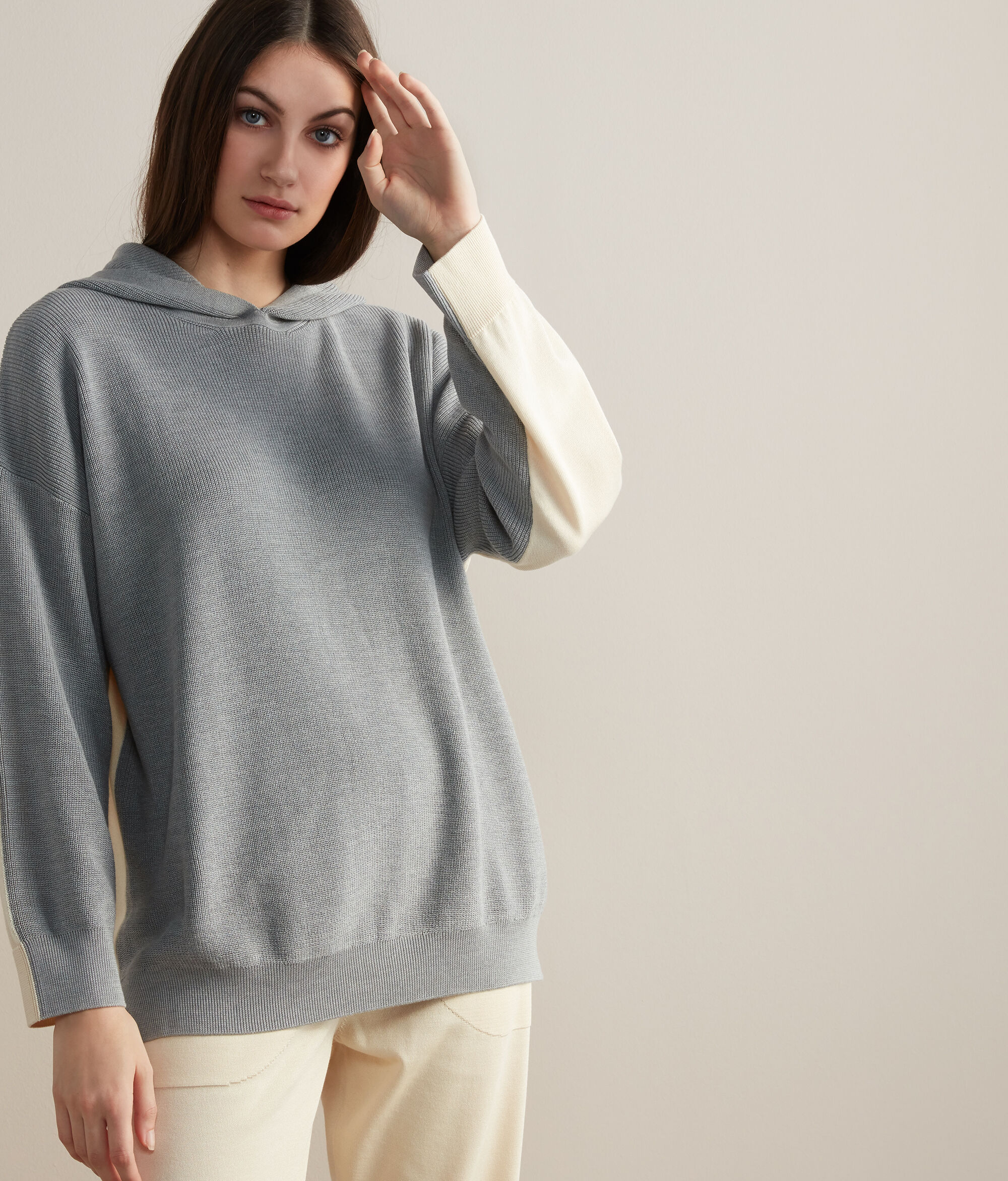 Hochwertige Seide und Baumwolle veredeln die großzügigen Formen dieses Maxi-Sweatshirts mit Rippenkapuze. Die großzügigen Volumina dieses Kleidungsstücks erzeugen einen Casual Look und werten die Freizeitkleidung auf.
