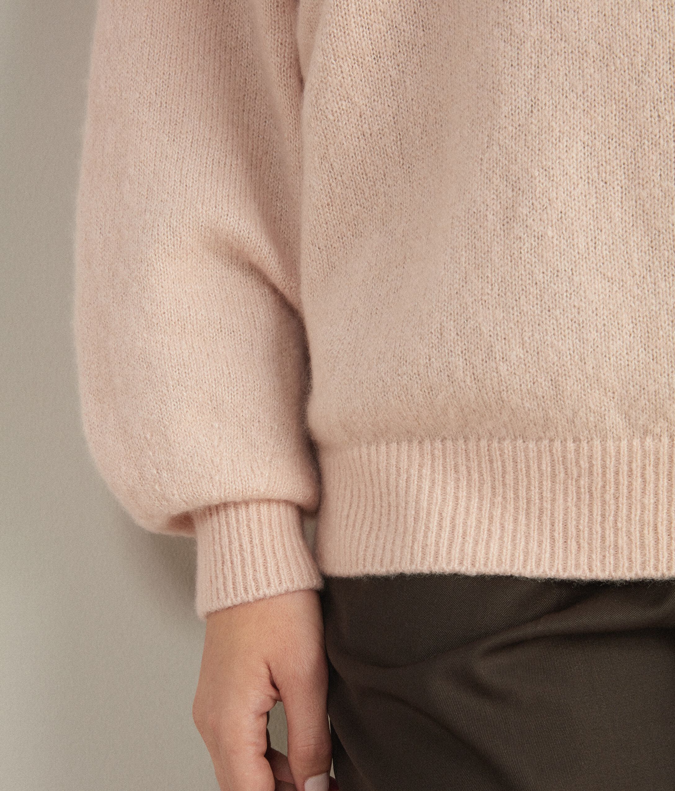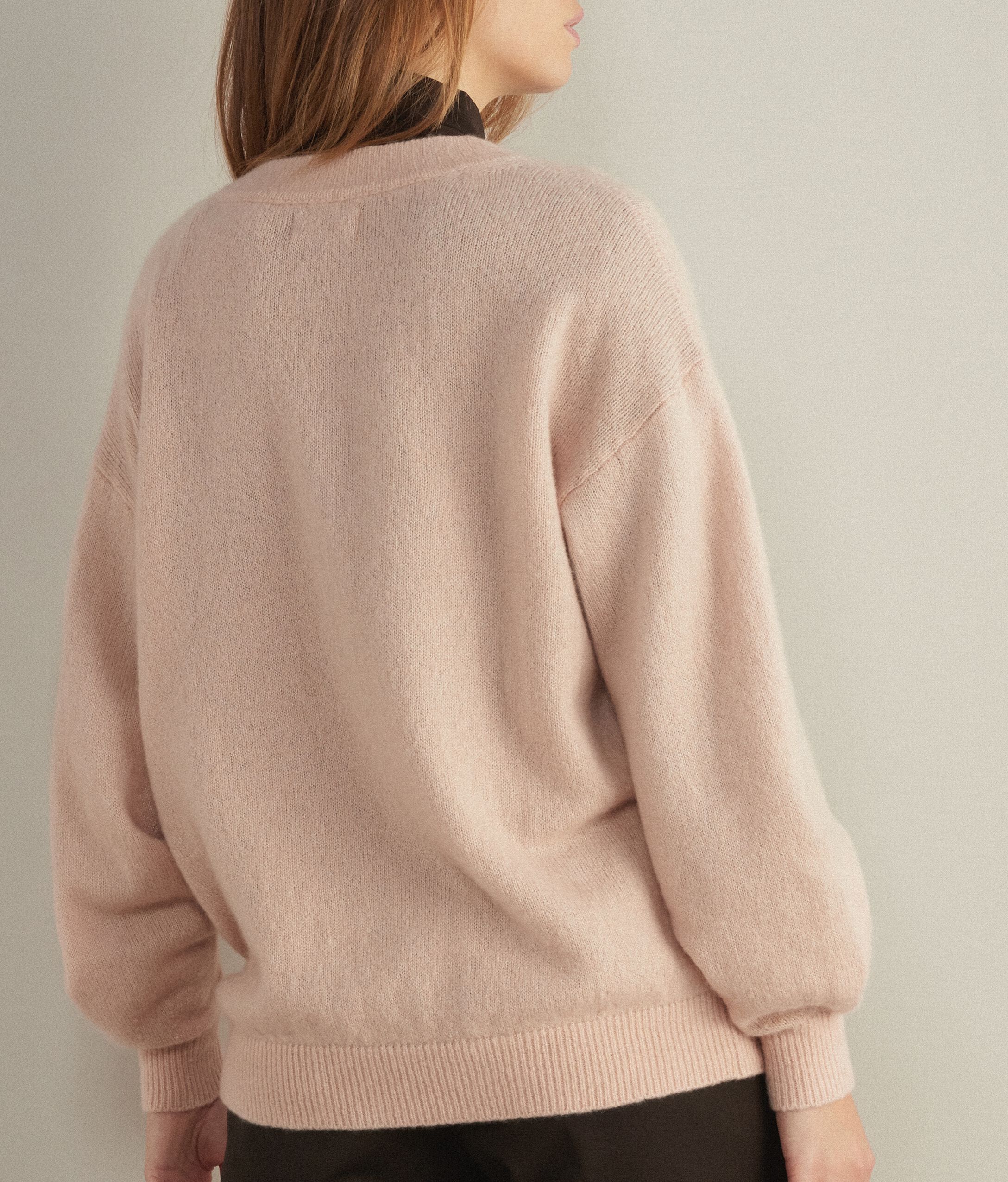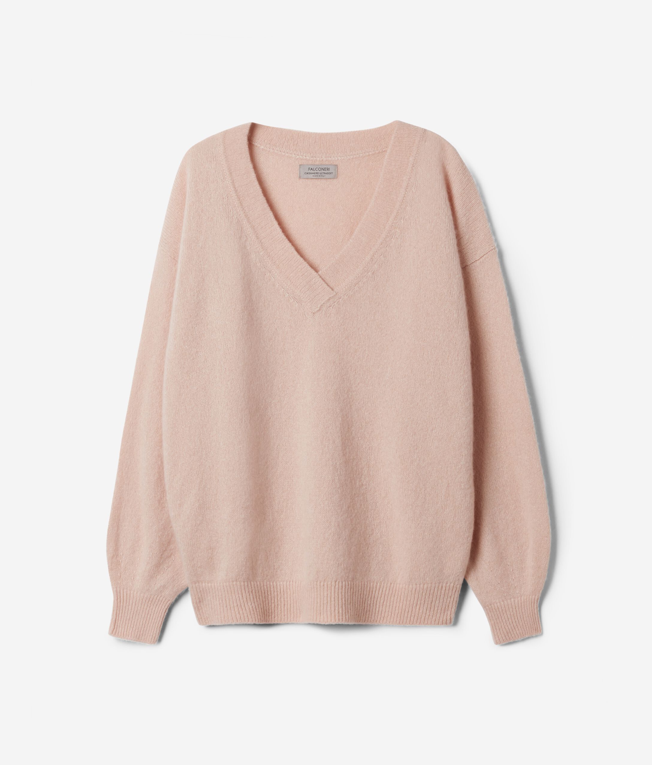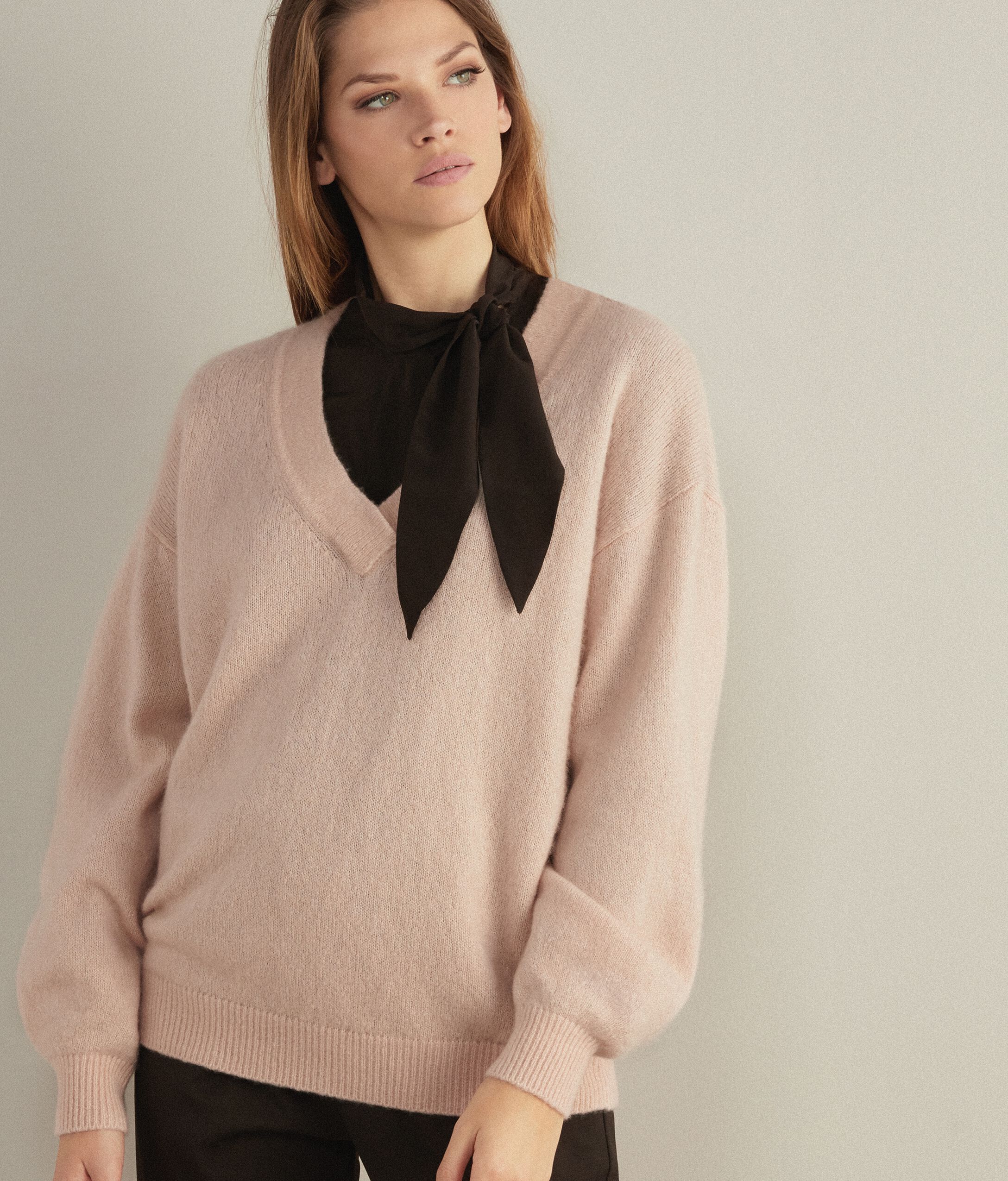 Pullover mit tiefem V-Ausschnitt aus edlem Kaschmir- und Seidengewebe. Leicht überschnittene Schulter und weite Ärmel. Rippbündchen an Ärmeln und Saum.
