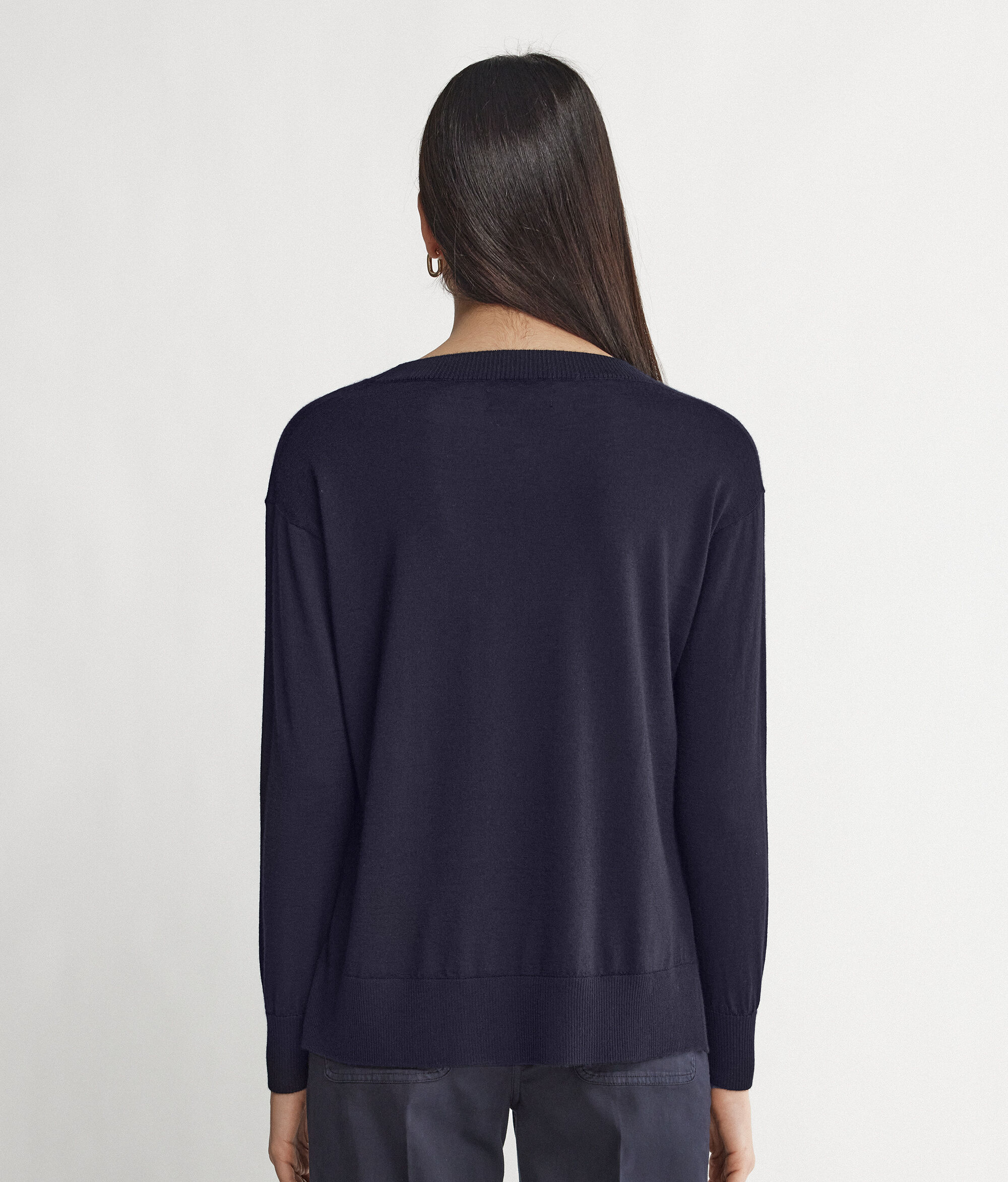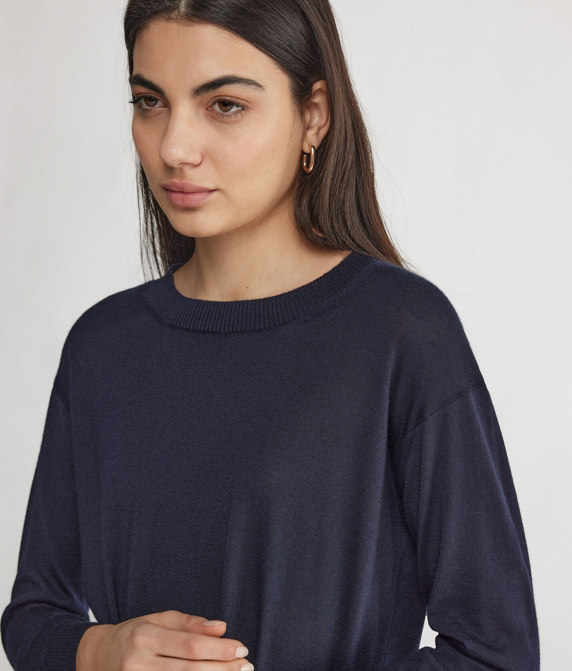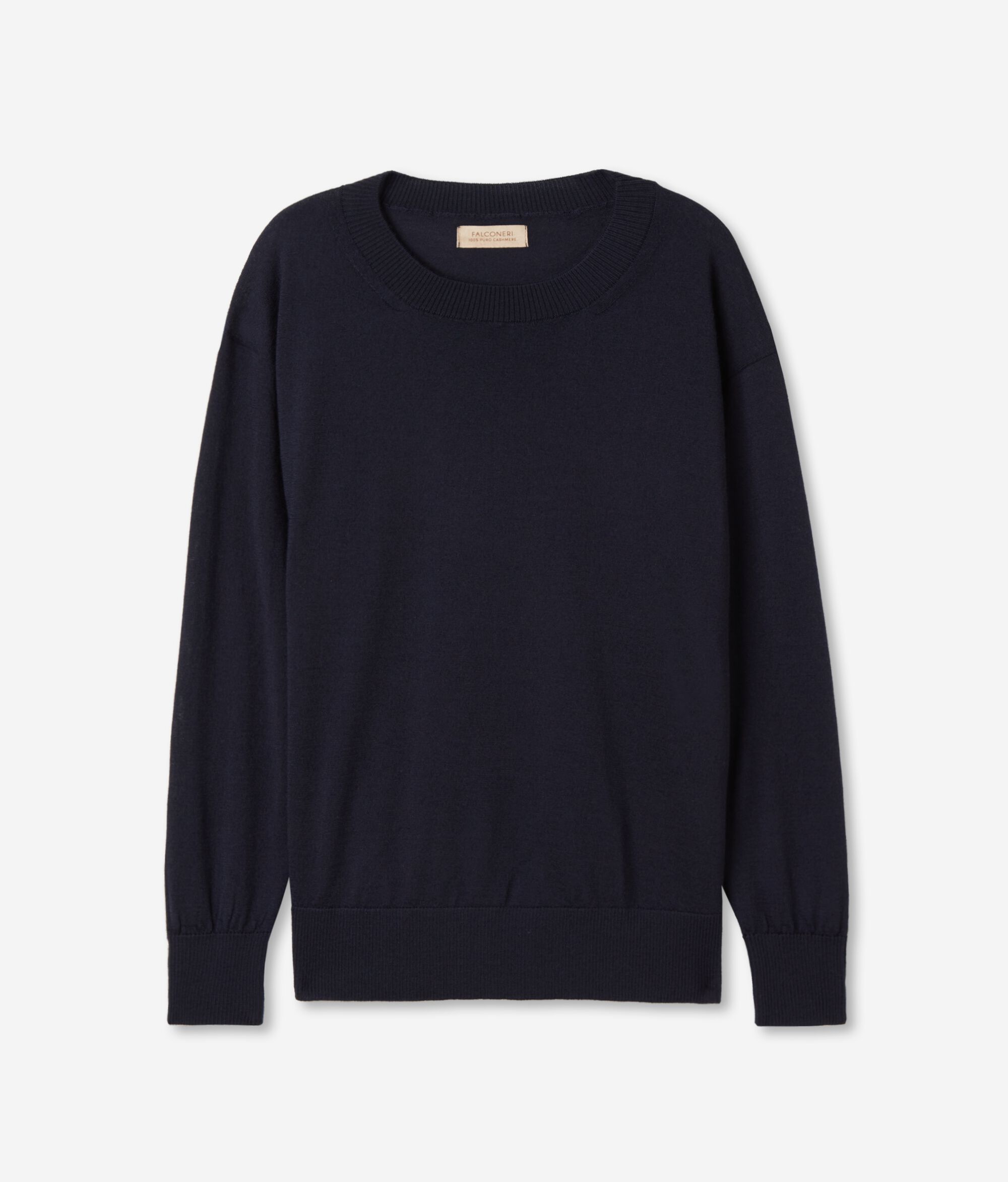 Der Pullover mit Rundhalsausschnitt aus Kaschmir Ultrafine ist ein langärmeliges Modell, das sich durch Rippstrick an Ausschnitt, Bündchen und Saum auszeichnet. Seine Besonderheit sind die Seitenschlitze. Die Schultern sind leicht überschnitten und die Passform ist weich fallend.