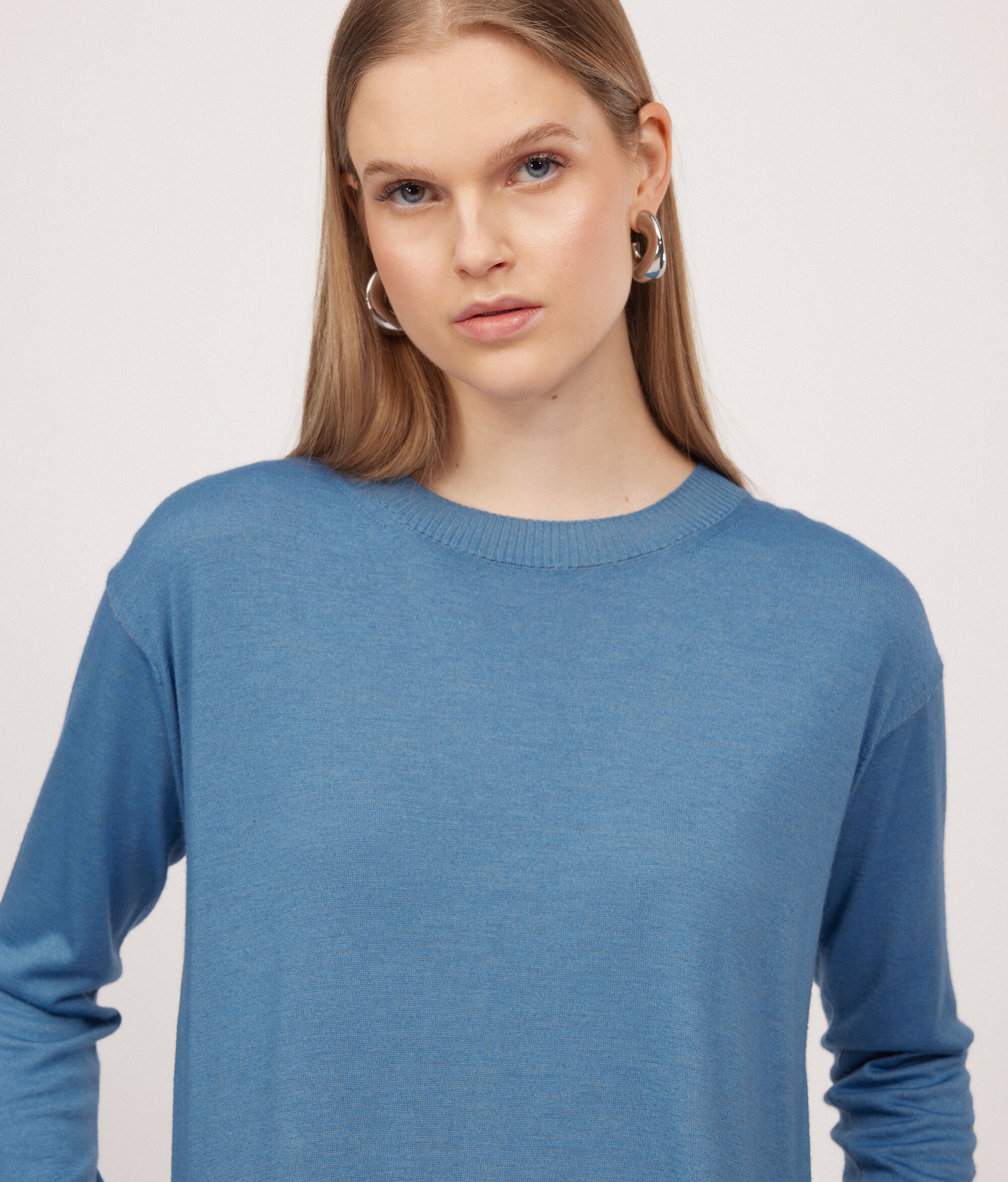 Der Pullover mit Rundhalsausschnitt aus Kaschmir Ultrafine ist ein langärmeliges Modell, das sich durch Rippstrick an Ausschnitt, Bündchen und Saum auszeichnet. Seine Besonderheit sind die Seitenschlitze. Die Schultern sind leicht überschnitten und die Passform ist weich fallend.
