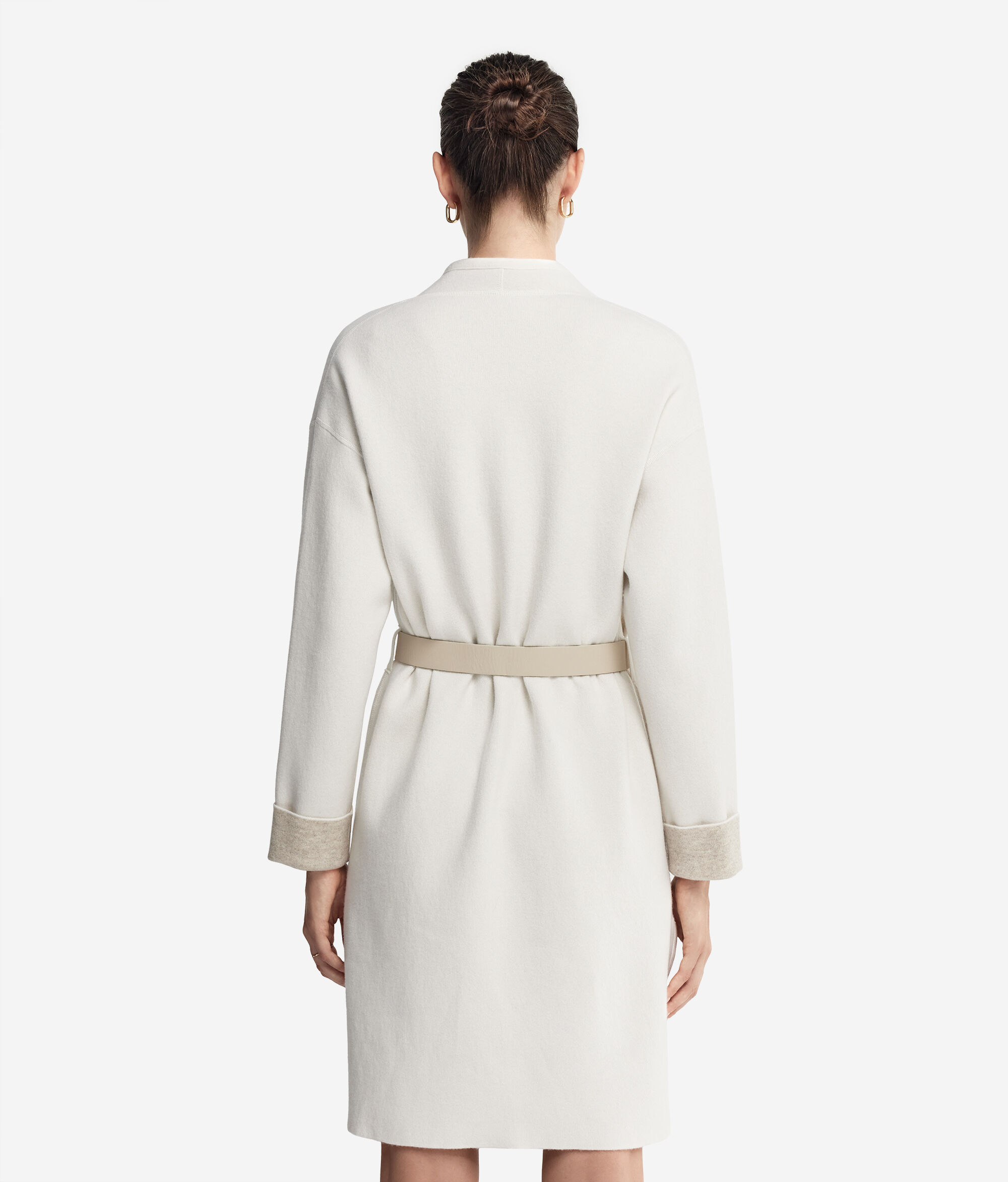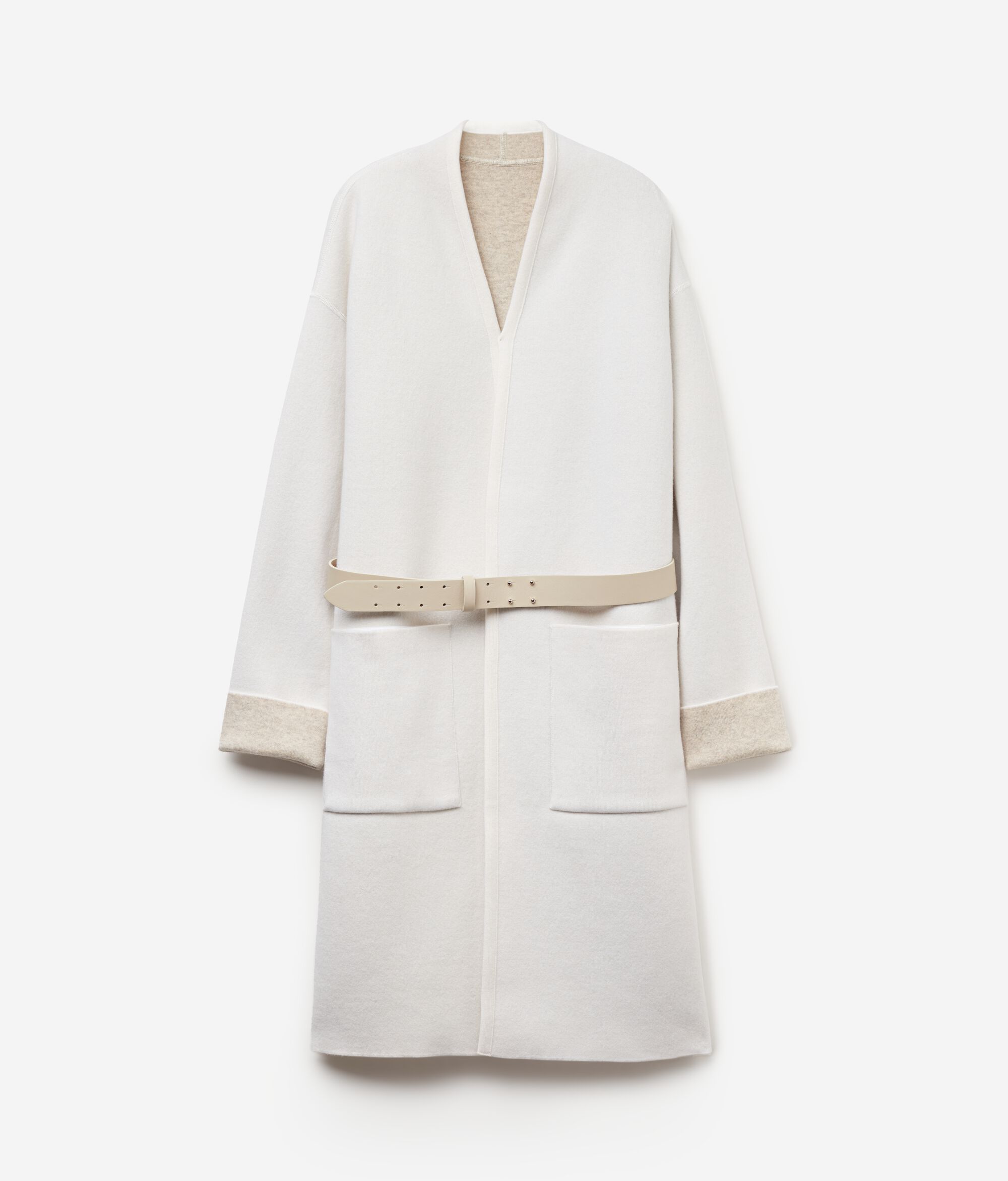 Intérprete de un gusto elegante y sofisticado, este abrigo reversible en puro cashmere se distingue por sus detalles de sastrería y por el cinturón de piel que resalta sus líneas delineando la cintura.