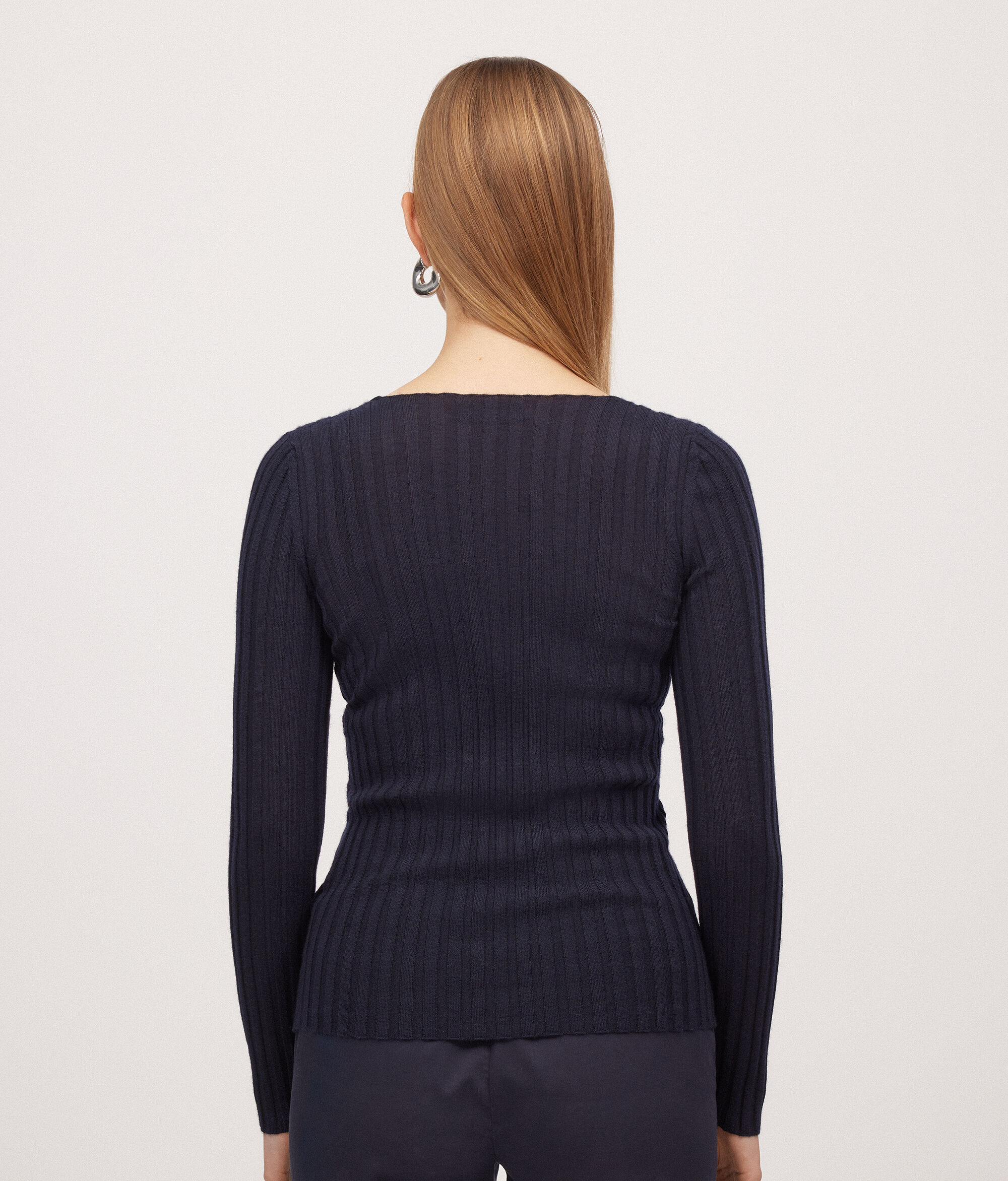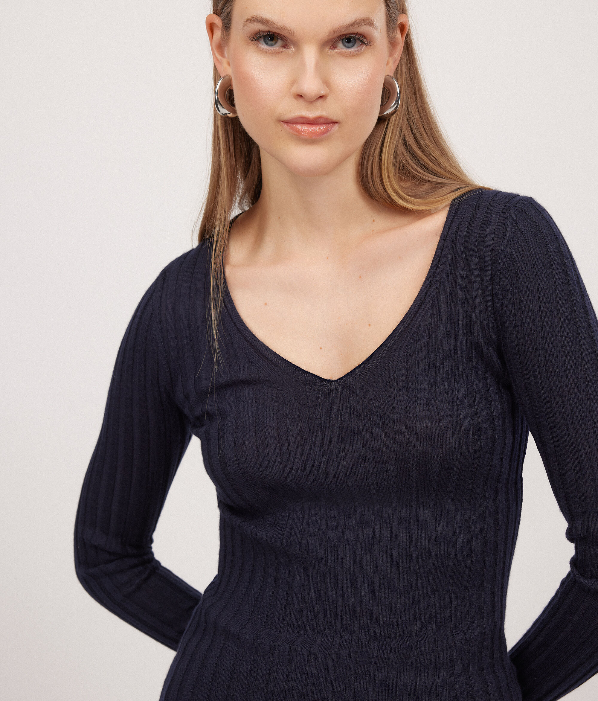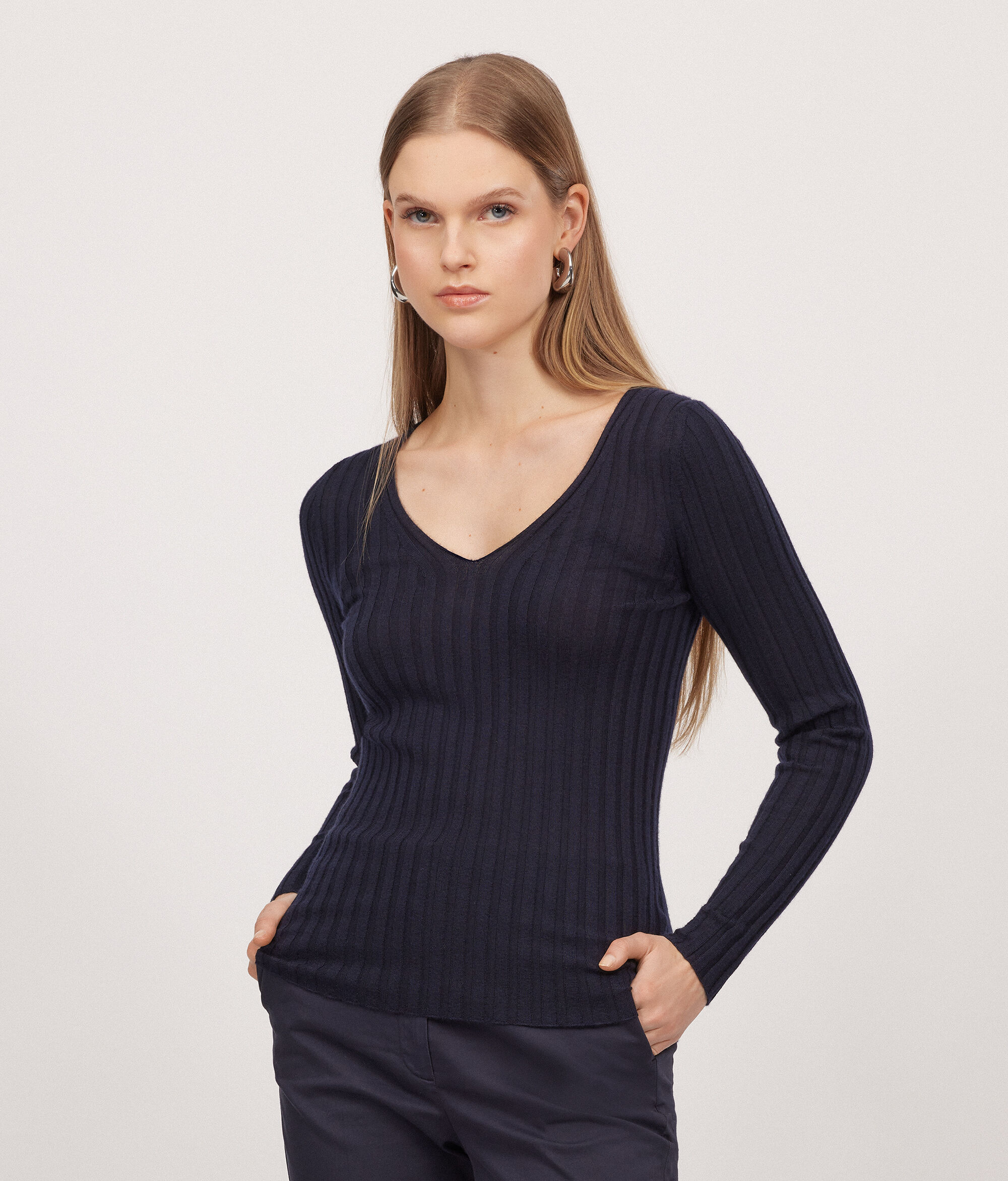 Ce pull côtelé en cachemire ultra-fin présente un col V et des manches longues. Cette pièce adopte des emmanchures classiques et une coupe slim.