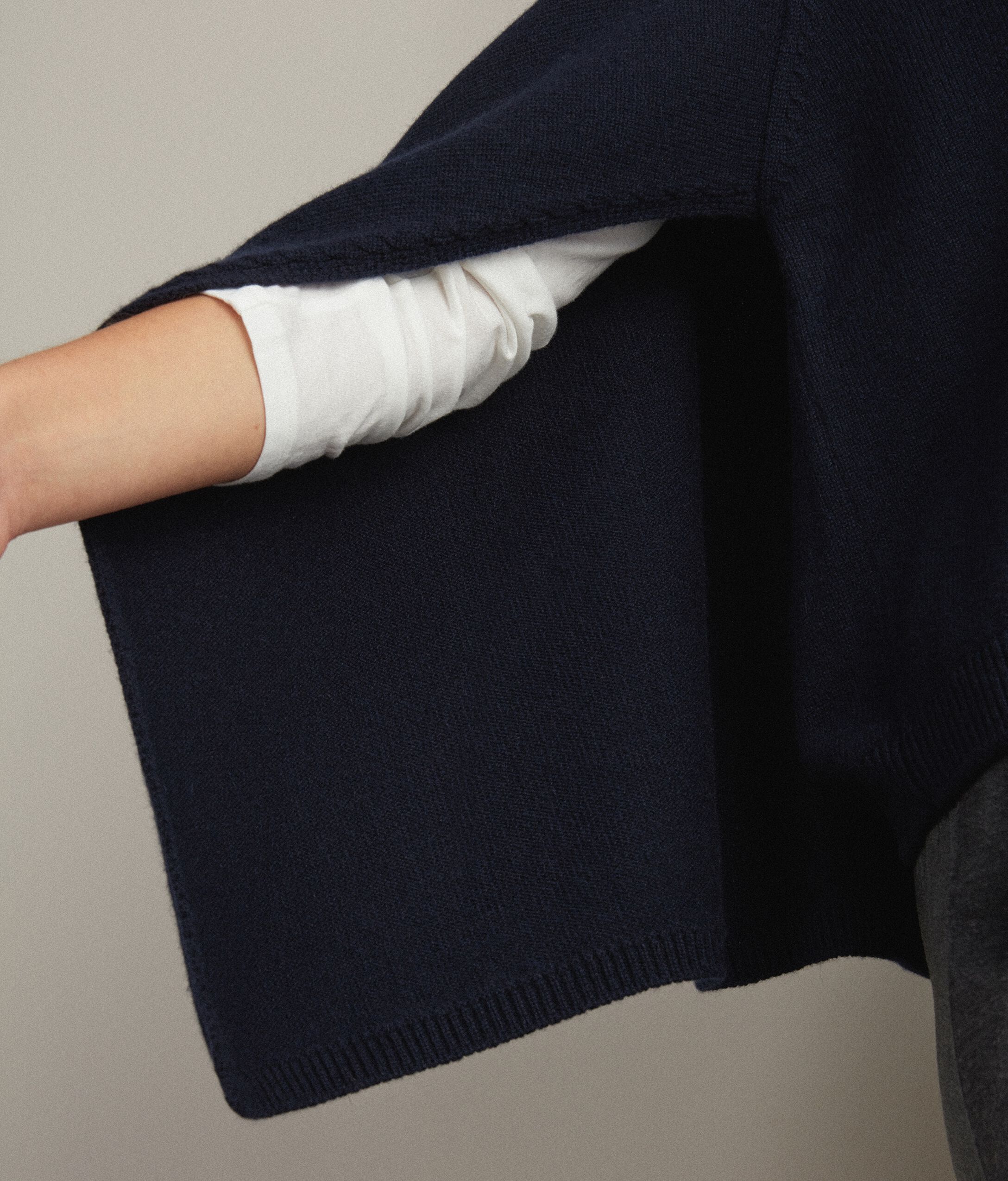 Round-neck cape jumper in cashmere ultrasoft with a distinctive, sleeveless cape. The cape functions as a cover for the arms, or it can be detached and worn around the neck as a scarf.