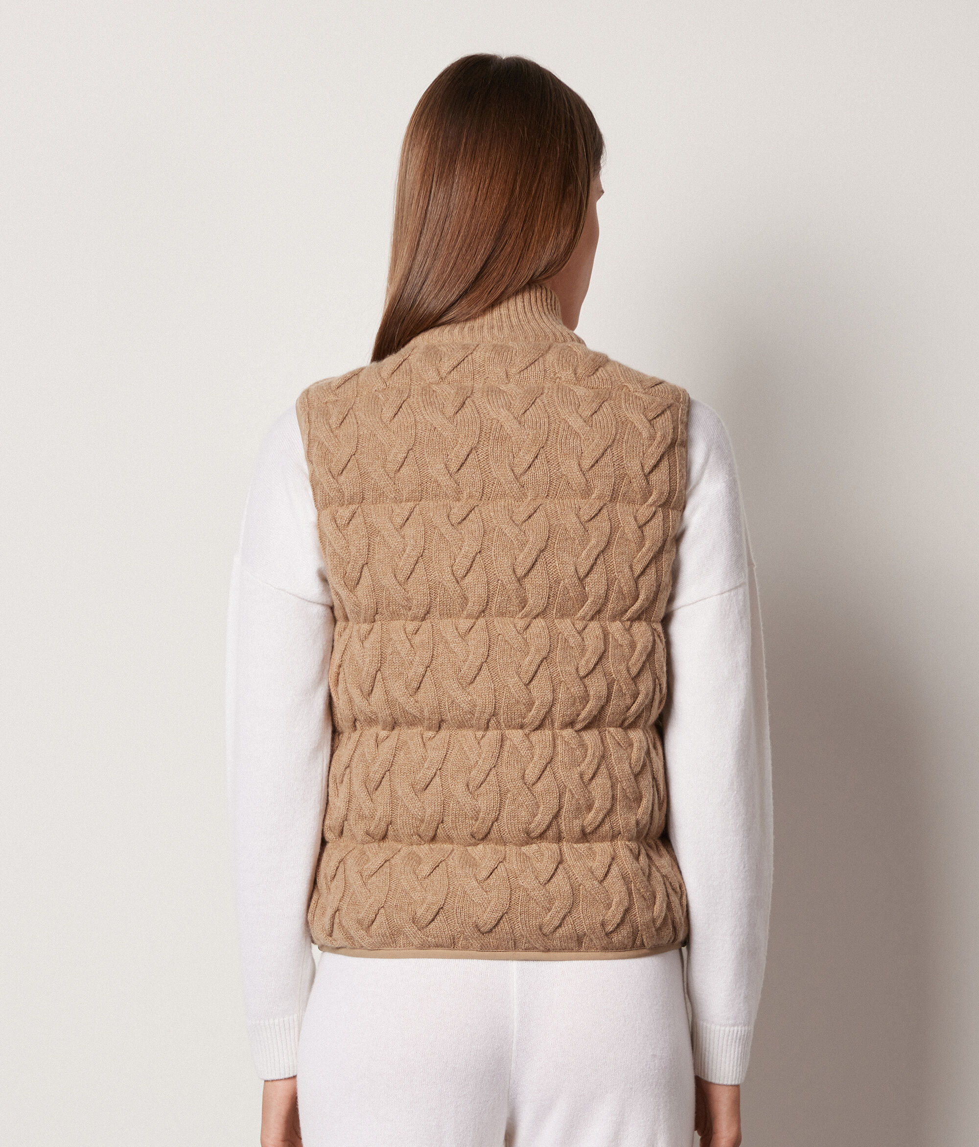 This cable-knit sleeveless gilet is the new proposal for the Falconeri Autumn/Winter Women's Collection. The high neck crafted in ultrasoft cashmere enriches the casual style of this garment, creating the perfect combination of practicality and elegance. Thanks to its double-face feature, the choice is always yours on which style to wear. The perfect option for in-between seasons to add an elegant touch to your outfits!