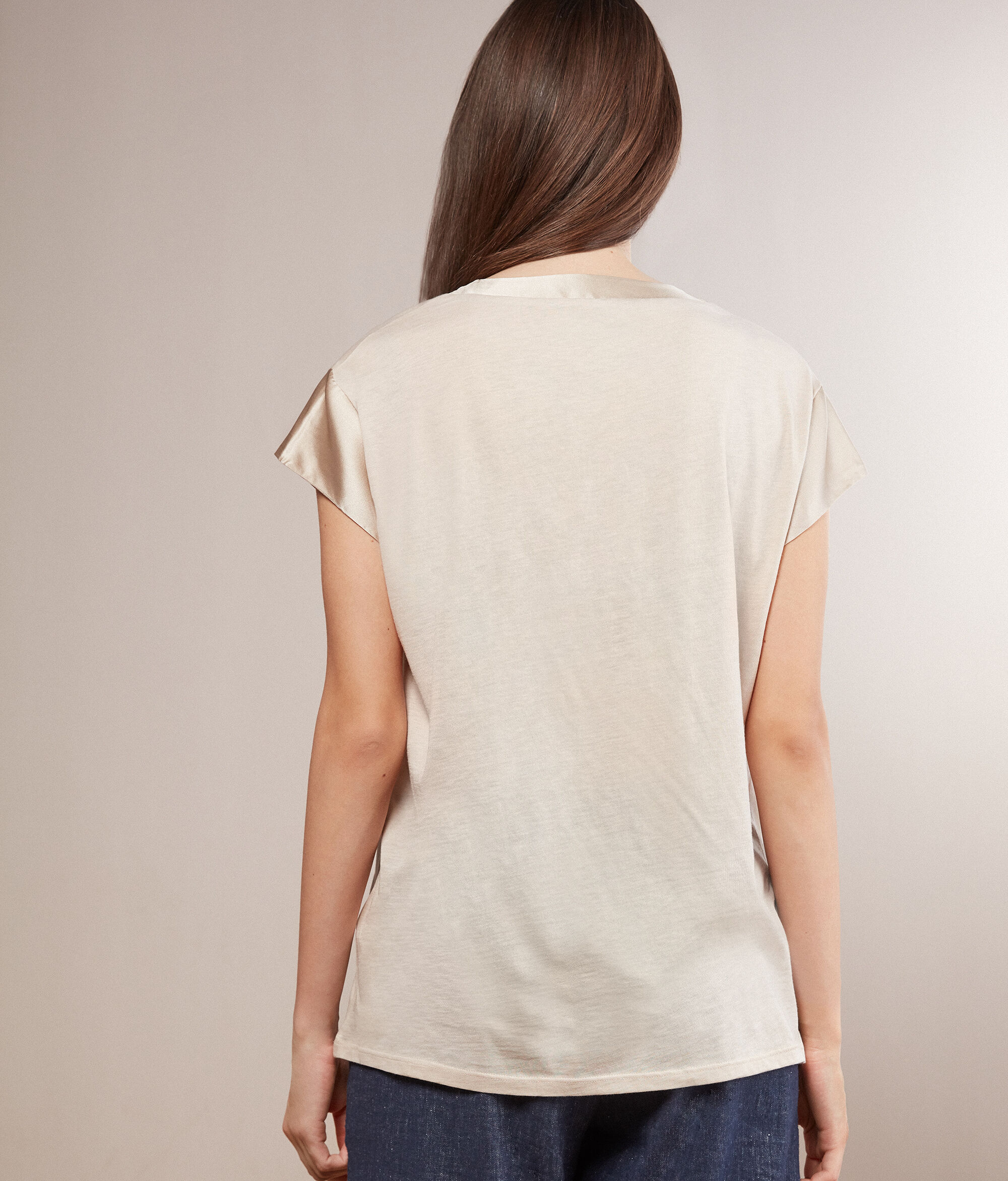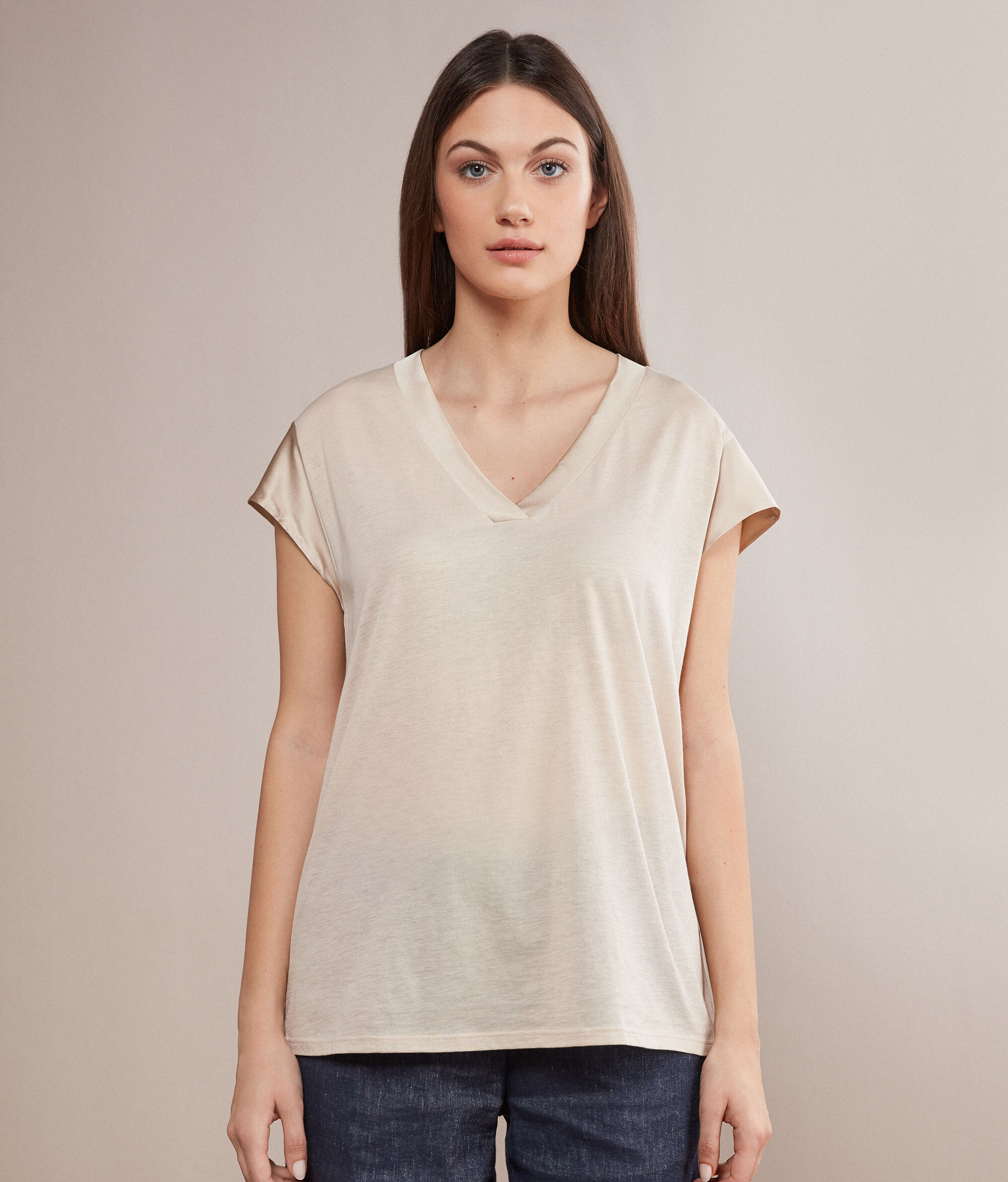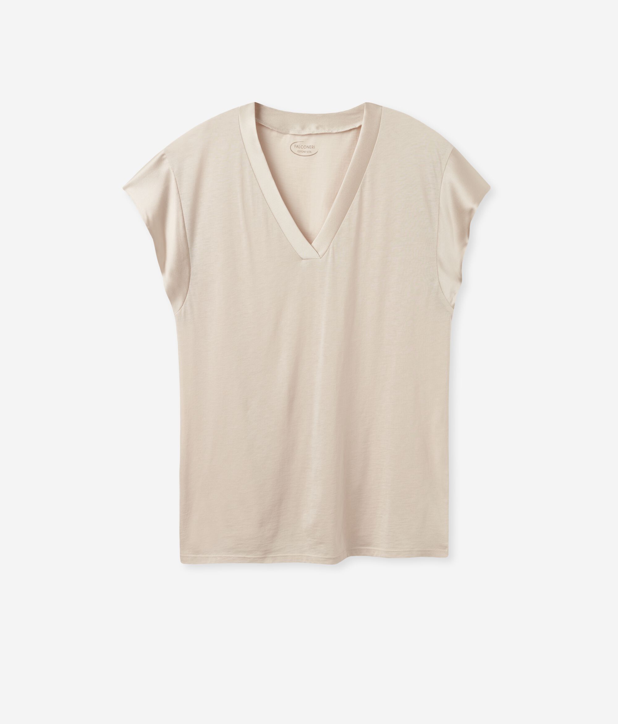 The pleasantly fresh and breathable texture, which is at the same time both soft and brilliant elevates the versatile and essential style of the new t-shirt in fresh silk. An article of clothing born to celebrate the warmer weather, but that has become a new staple that will complement your outfits for all seasons.