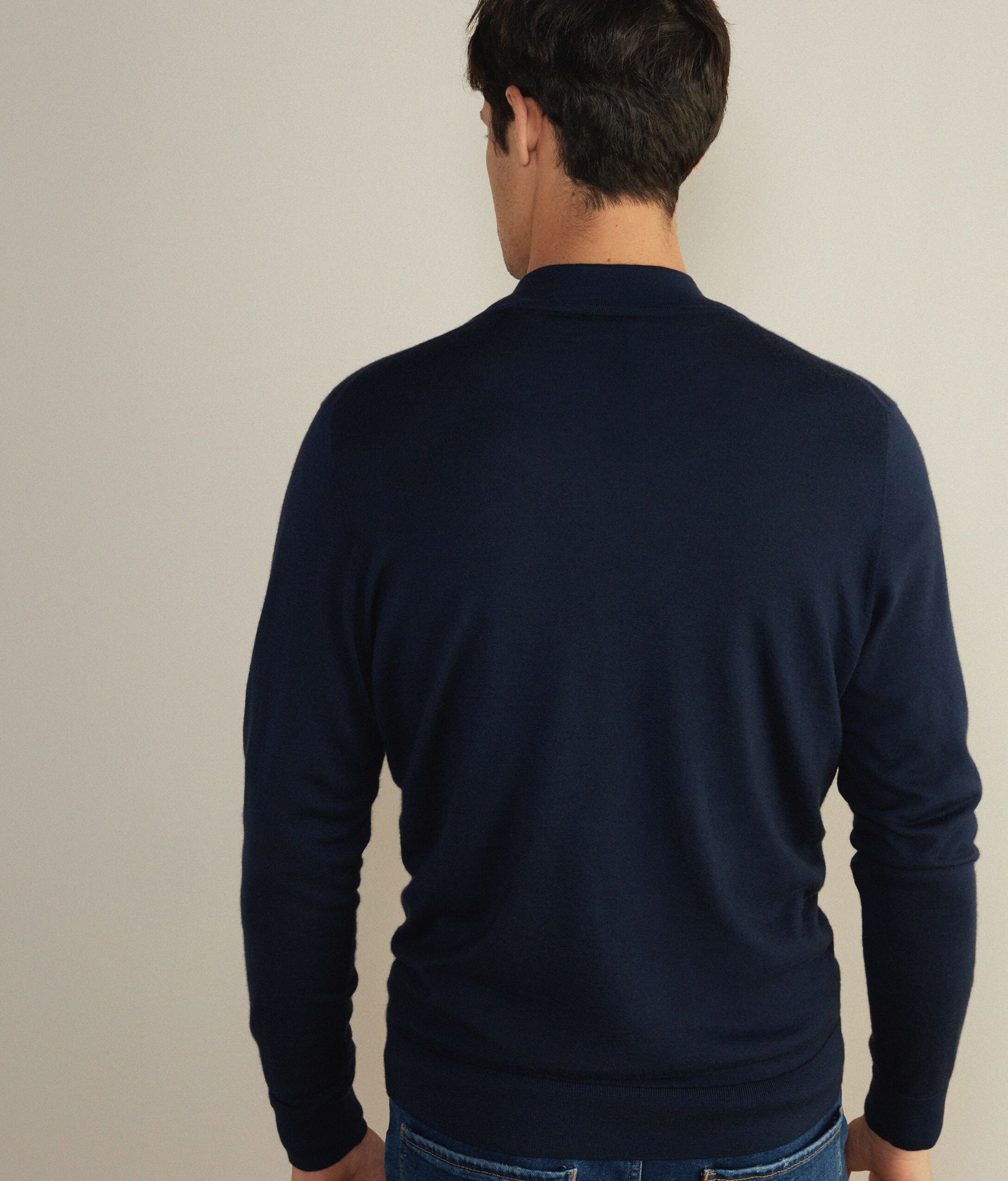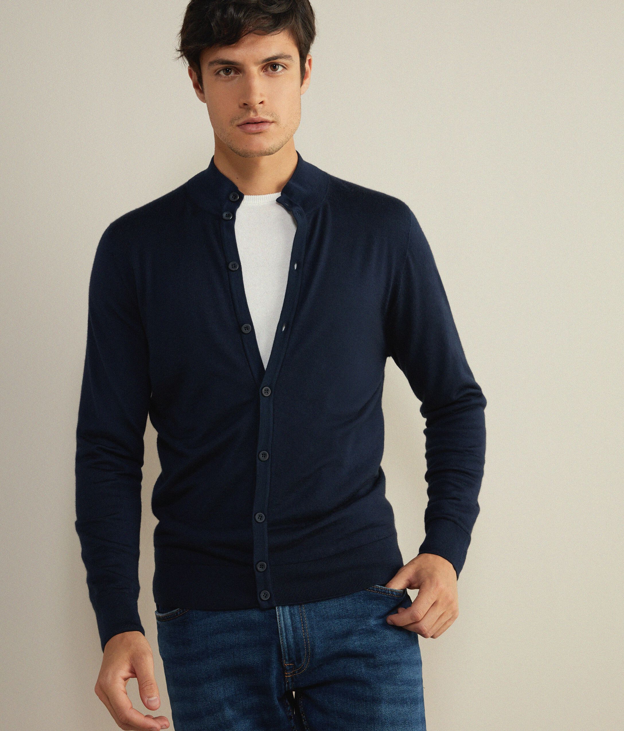 High-neck buttoned cardigan in Ultrafine Cashmere. The lightness of the yarn and the particular garment-dyed color give this luxurious knit a marbled-effect. Perfect for wearing under a jacket for a new look, or for pairing with a T-shirt. Regular fit.