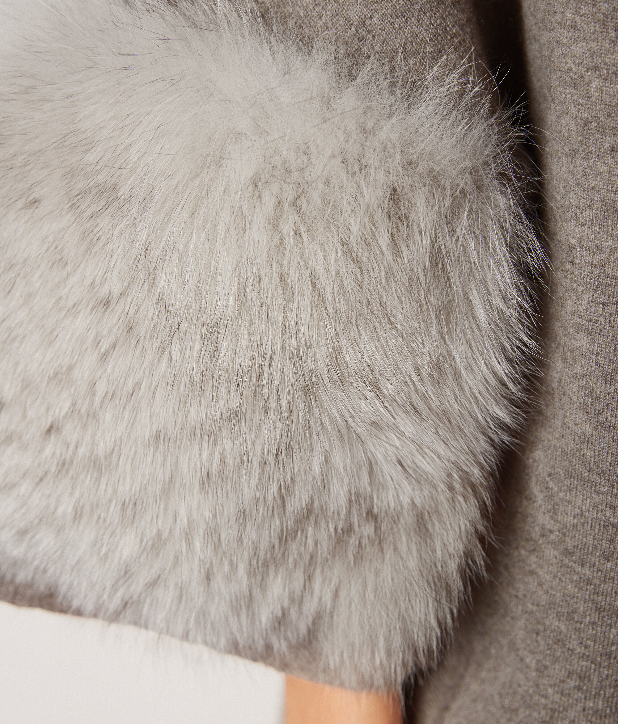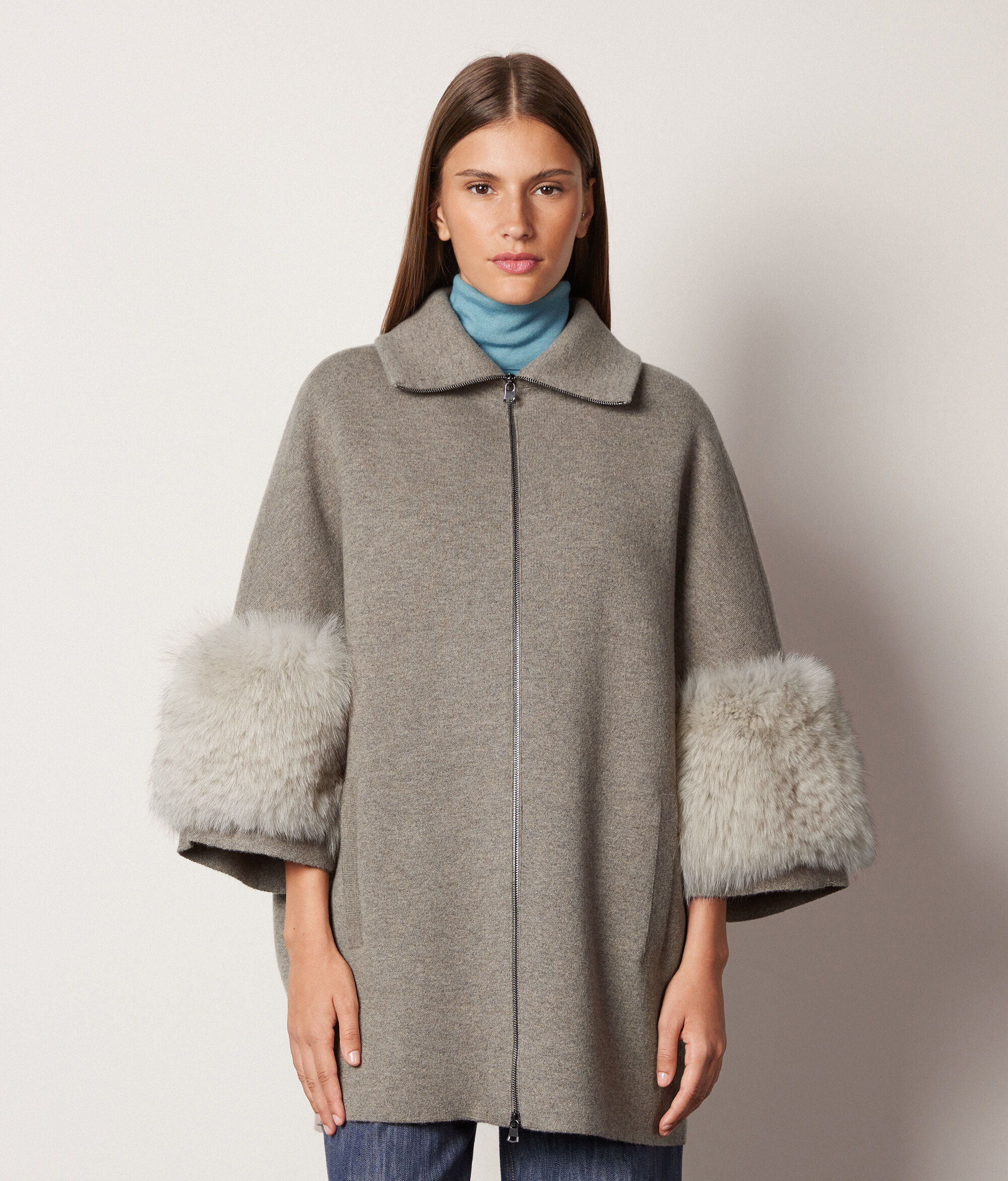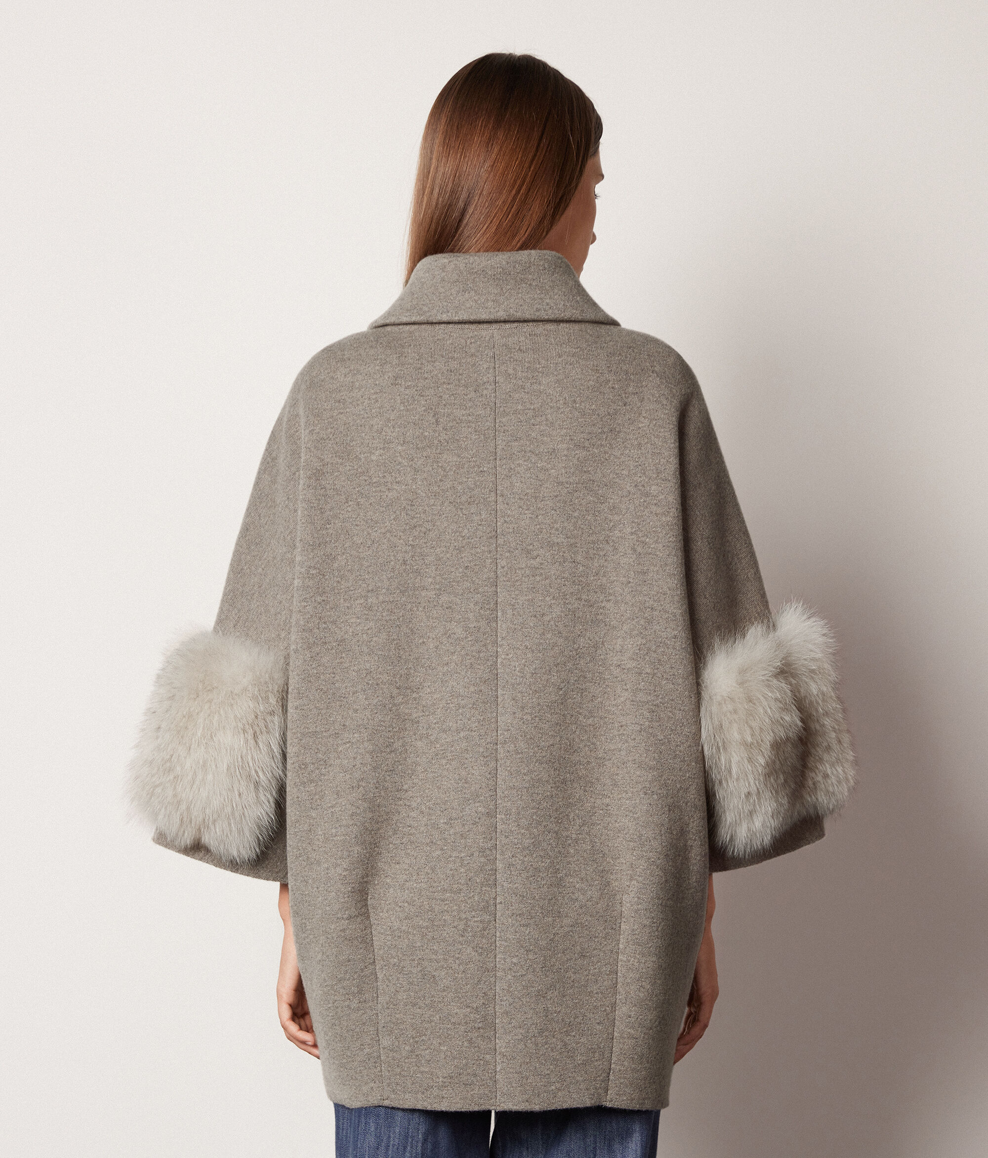A cosy aesthetic and a sophisticated feel characterise this Falconeri cashmere kimono coat. The skilful craftsmanship accentuates the softness and warmth of the garment, while the wide sleeves and fox-fur detail on the cuffs give the garment a timeless yet refined feel.