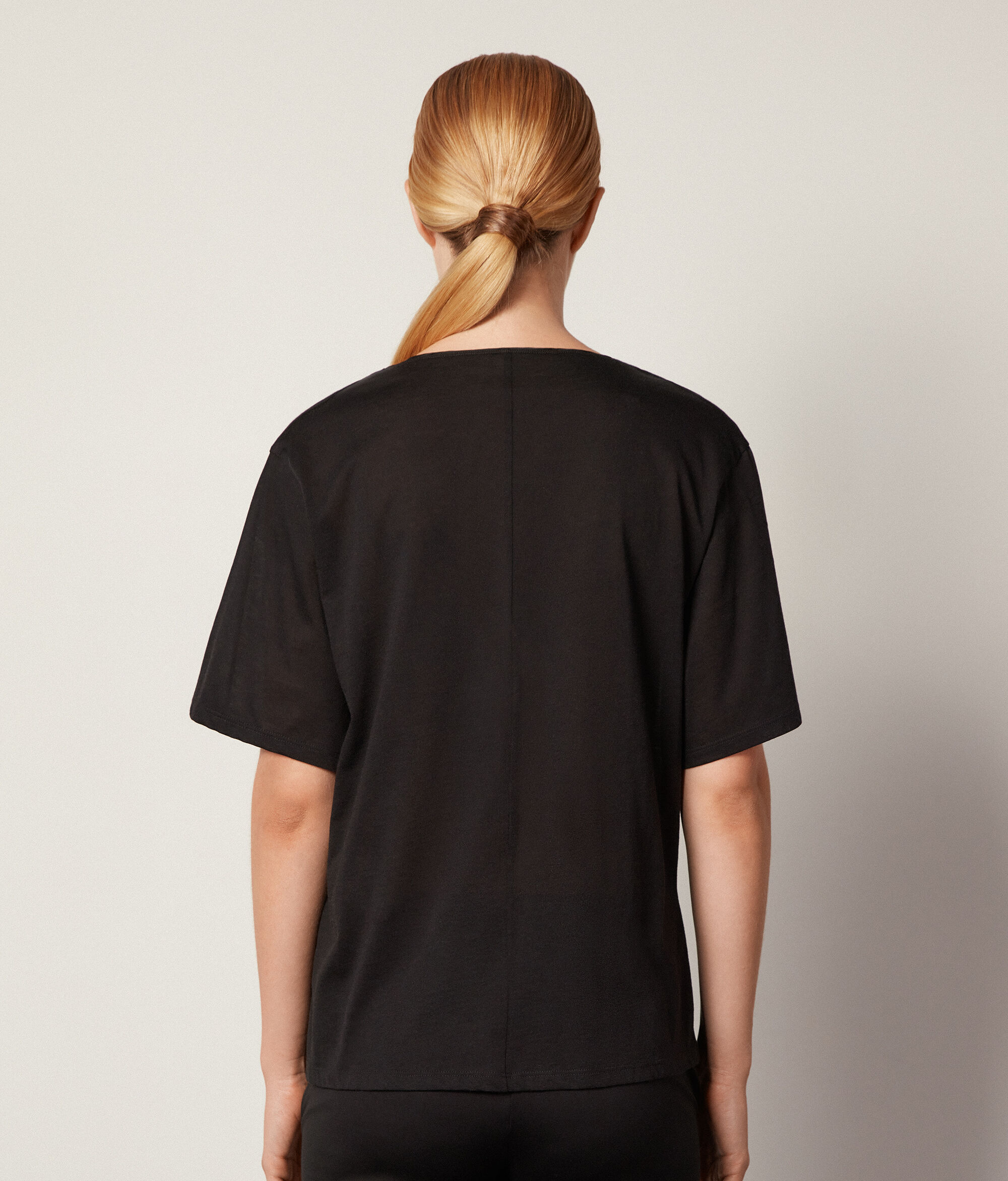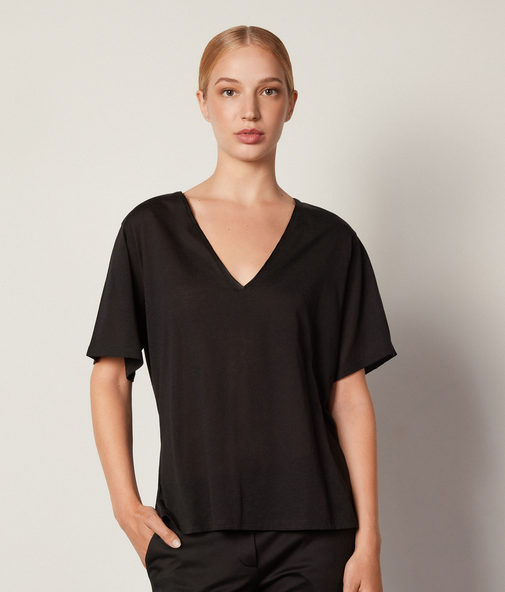 Η ισορροπία στα σχήματα και στους όγκους χαρακτηρίζει την κολεξιόν Falconeri που πάντα εναρμονίζει το στυλ με τη φύση των υλικών. Το βαμβακερό και μεταξωτό ύφασμα συνδυάζεται επιδέξια με τις απαλές γραμμές αυτού του t-shirt με λαιμόκοψη V. Μια ευέλικτη και εκλεπτυσμένη πρόταση για τη γυναικεία γκαρνταρόμπα, ιδανική για να συμπληρώσει με κομψότητα τα καθημερινά look με άνετο στυλ.