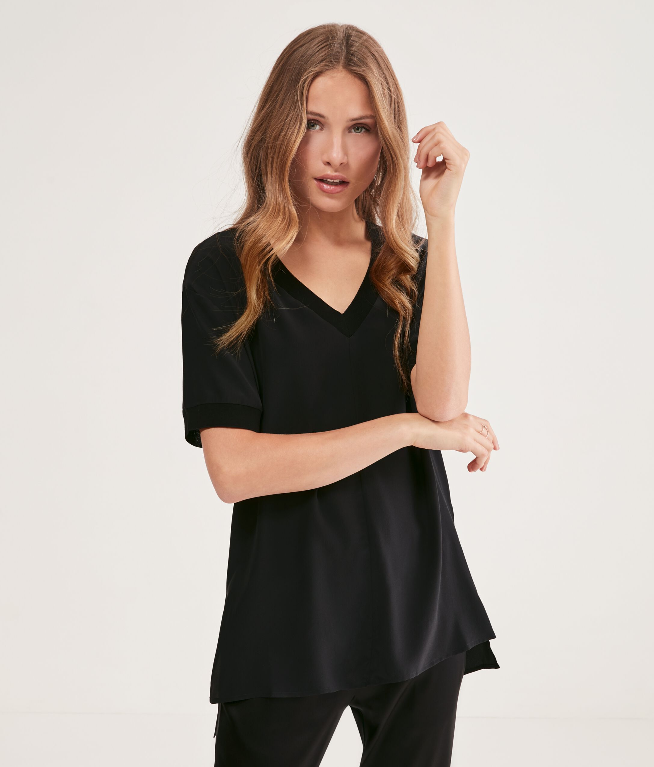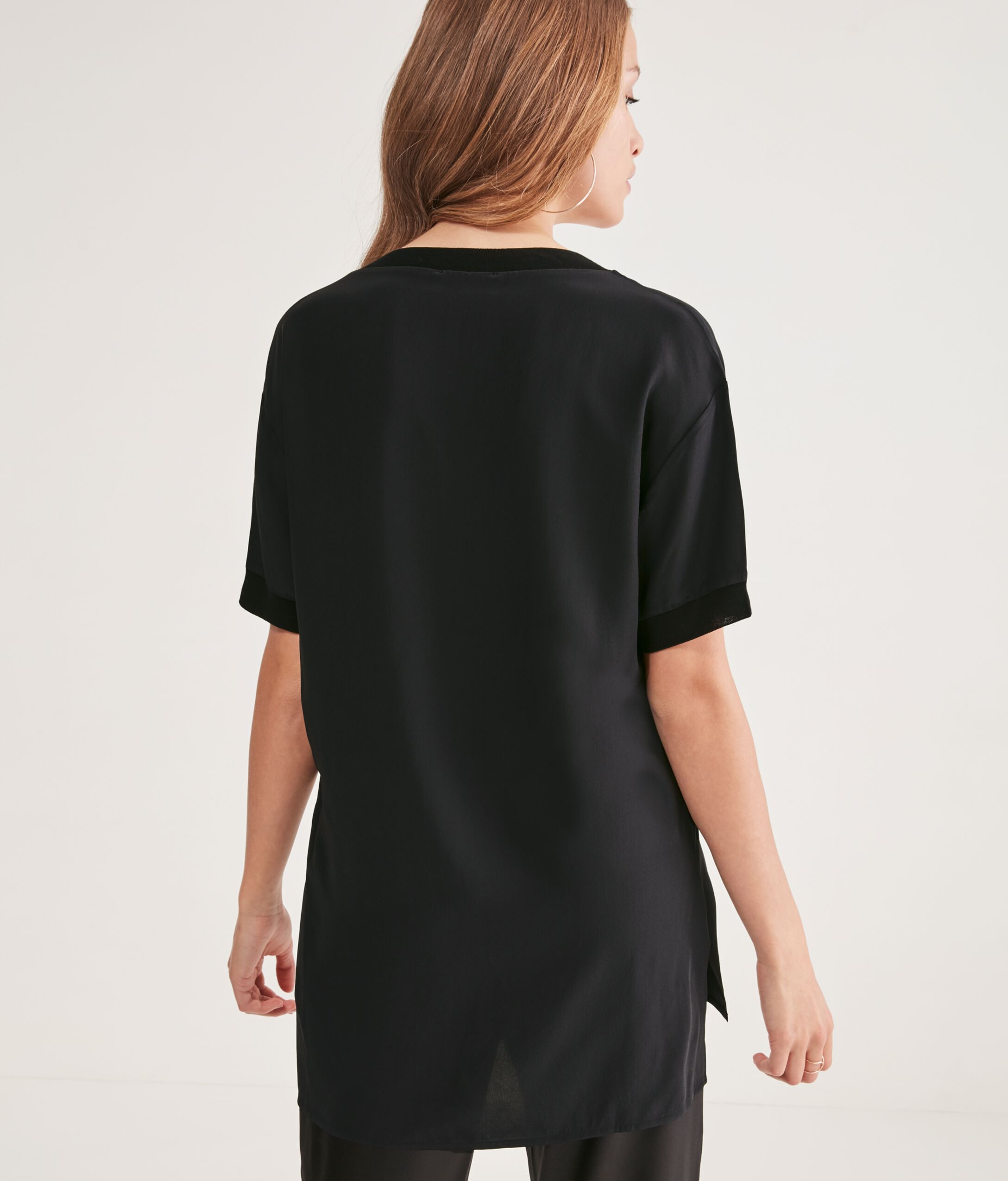 Silk T-shirt with deep V-neck and rib-knit cotton inserts on the sleeves and around the neckline. Featuring side slits and dropped shoulders. Relaxed fit.
