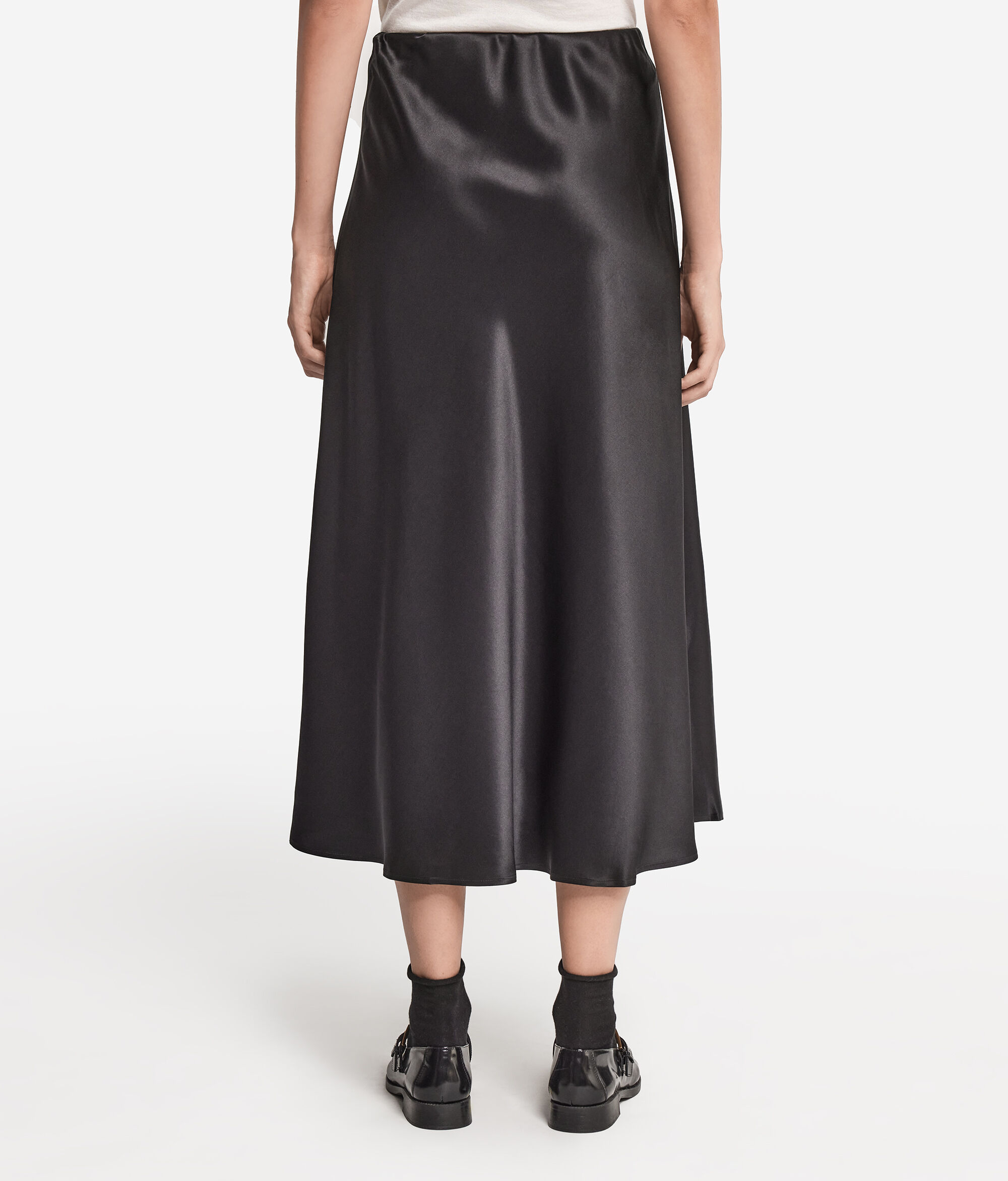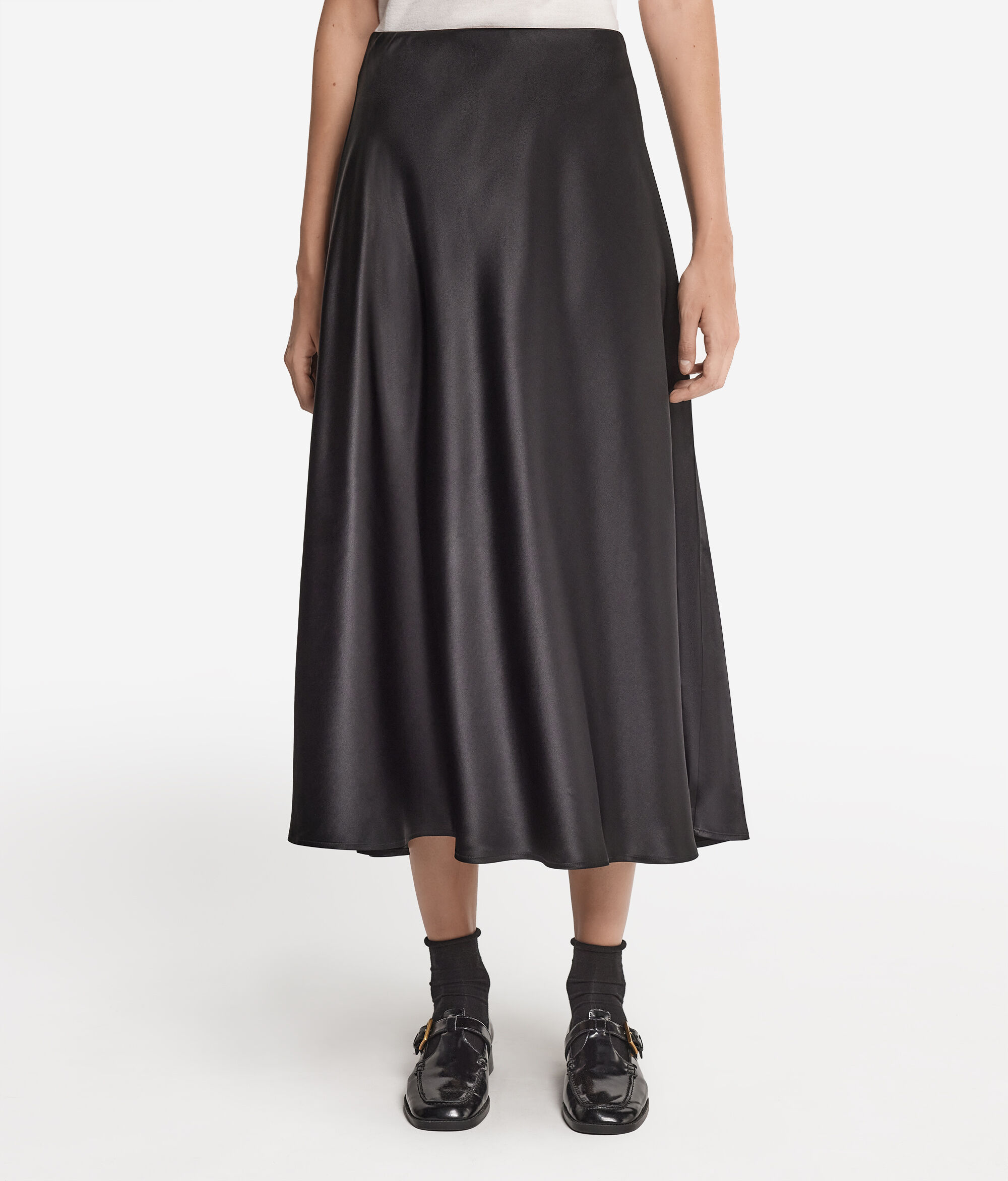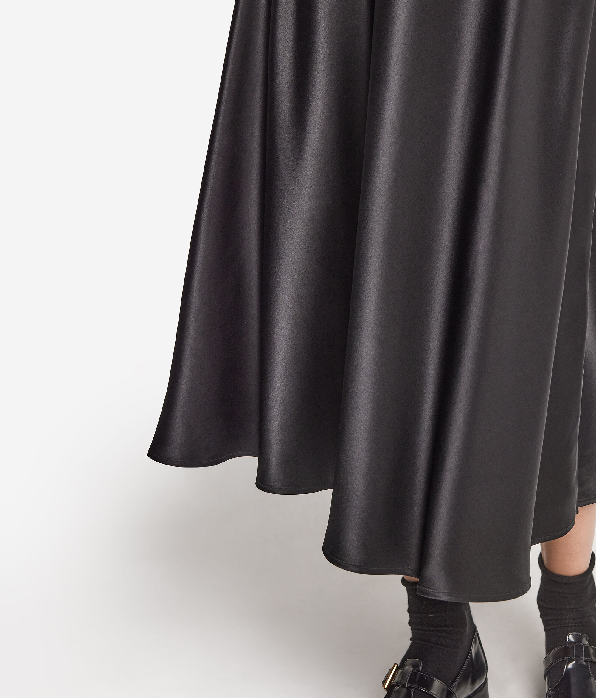 全体がシルクサテンで作られたこのスカートの、優雅さと洗練性を満喫しましょう。快適さとフィット感を高めるウエストの伸縮性ベルトがデザインのポイント。ふくらはぎ丈で上品なタッチを演出した、デイタイムにも、イブニングにも理想的なアイテムです。サテン布地が軽やかで高級感あふれる仕上がりを加え、時代を超えて愛される洗練されたルックをお約束します。