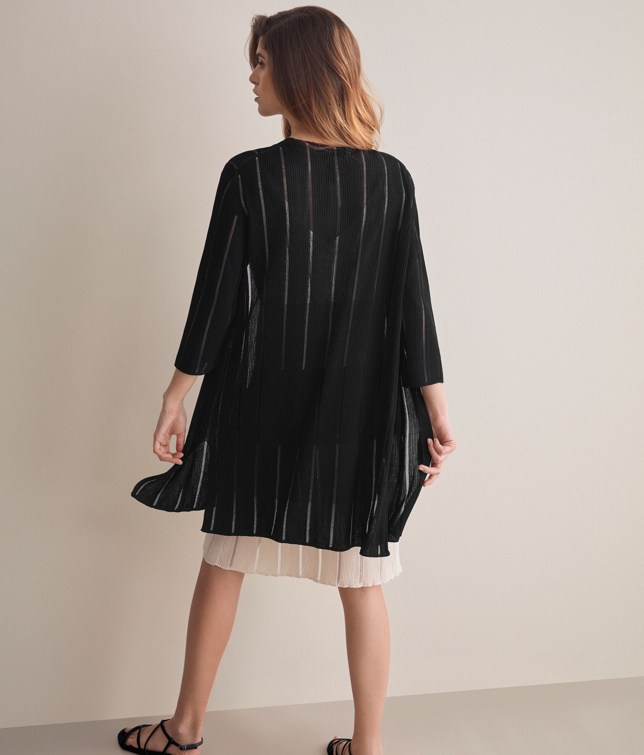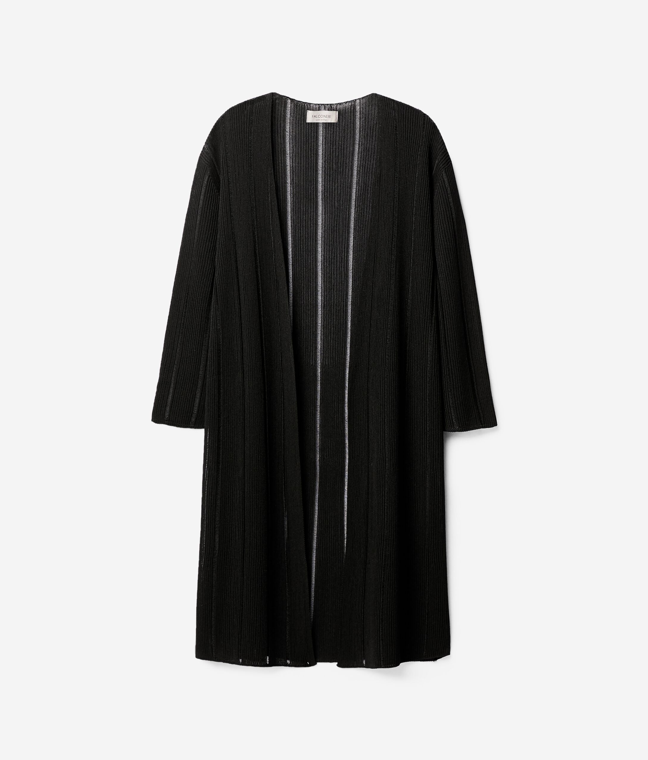 高級素材と画期的な工法が出会うことで、Falconeriのニットウェアが醸し出すテイストがアレンジされ、洗練された独自のスタイルを生み出します。七分袖の新作マキシオープンカーディガンはシーンの美しいビスコースヤーン製。浮き織でストライプを織り出し、女性らしく洗練されたシルエットを描き出しました。レギュラーフィット、ロング丈に仕立てています。モデルの身長は179cmでMサイズを着用バスト: 88cm / ウエスト: 67cm / ヒップ: 94cm