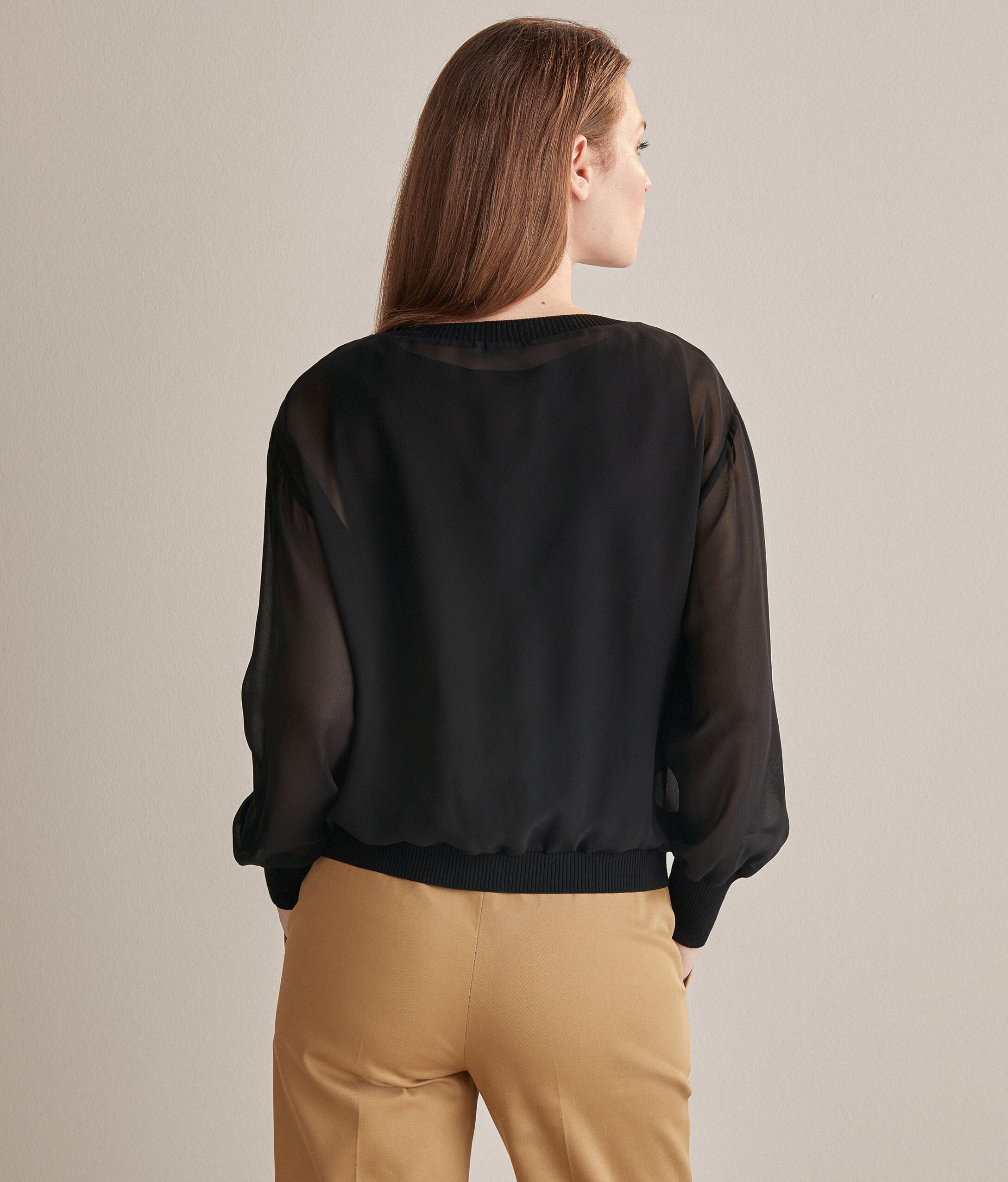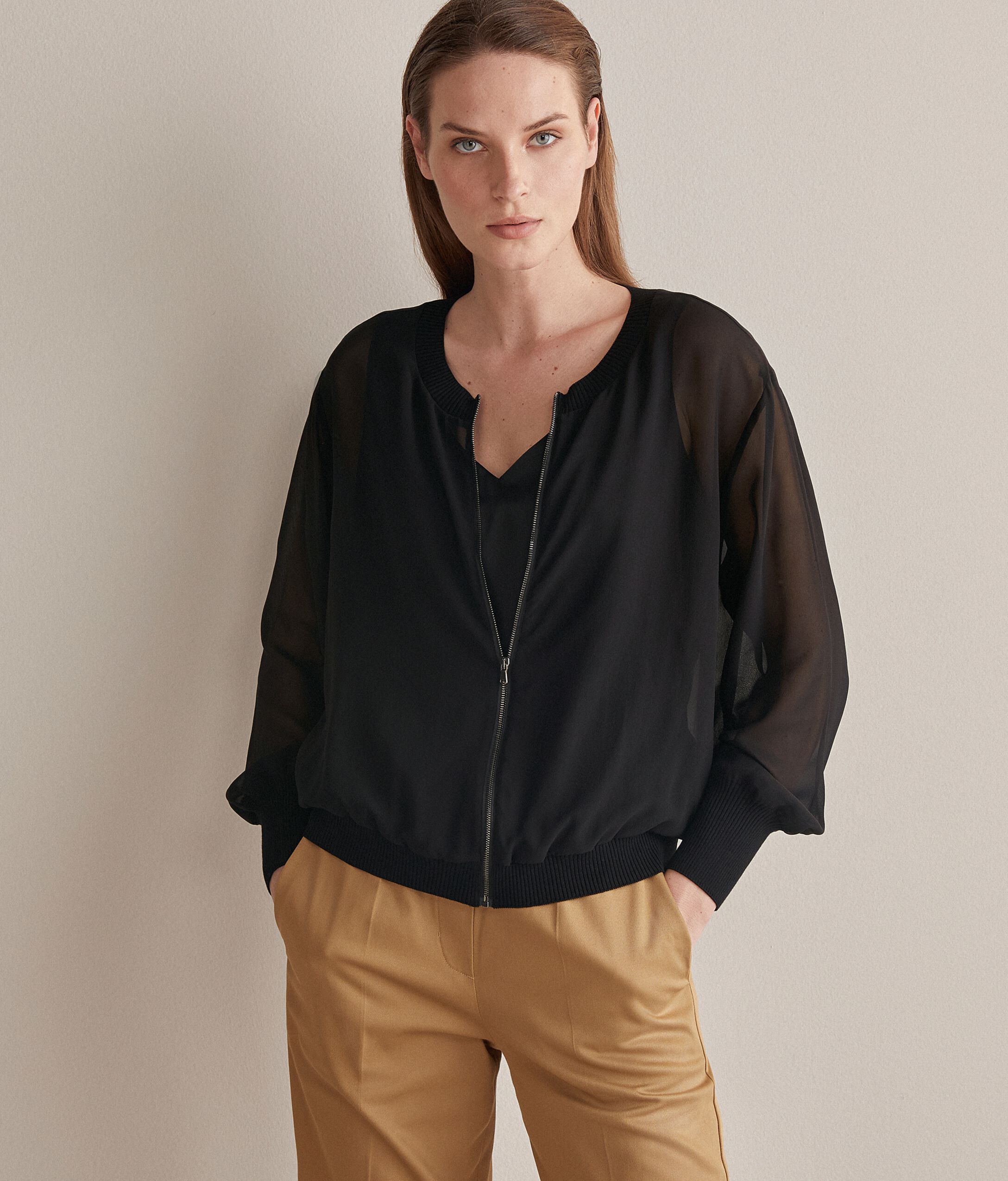 Icône des pièces de dessus, le blouson bomber en pure soie proposée par Falconeri conjugue lignes sportives et soin des détails, dans des matières raffinées. Des modèles en contraste exaltant une tenue contemporaine et recherchée valorisent l'image d'une femme chic qui aime les lignes confortables. La texture raffinée de la georgette de soie offre des nuances douces et brillantes, alternées par des empiècements en maille coton côtelée au niveau du cou, des poignets et de l'ourlet du bas. Coupe fluide. Le Mannequin Mesure 179 Cm Et Porte Une Taille MMPoitrine : 88 cm / Taille : 67 cm / Bassin : 94 cm