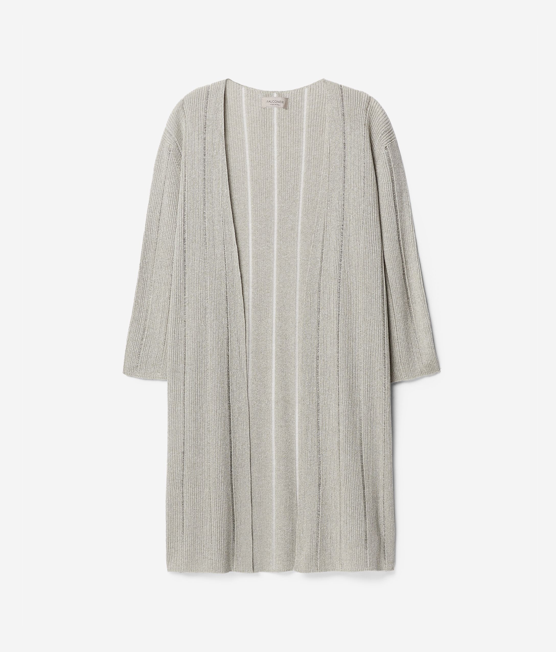 La rencontre entre des matières naturelles et des techniques de confection innovantes réinterprètent le goût de la maille Falconeri et donnent vie à un style raffiné et unique. Le nouveau maxi cardigan ouvert à manches 3/4 en fils de viscose brillante offre un travail de fils flottants à rayures qui dessine une silhouette féminine et raffinée. Cette pièce adopte une coupe classique et une longueur longue. Le Mannequin Mesure 179 Cm Et Porte Une Taille MMPoitrine : 88 cm / Taille : 67 cm / Bassin : 94 cm