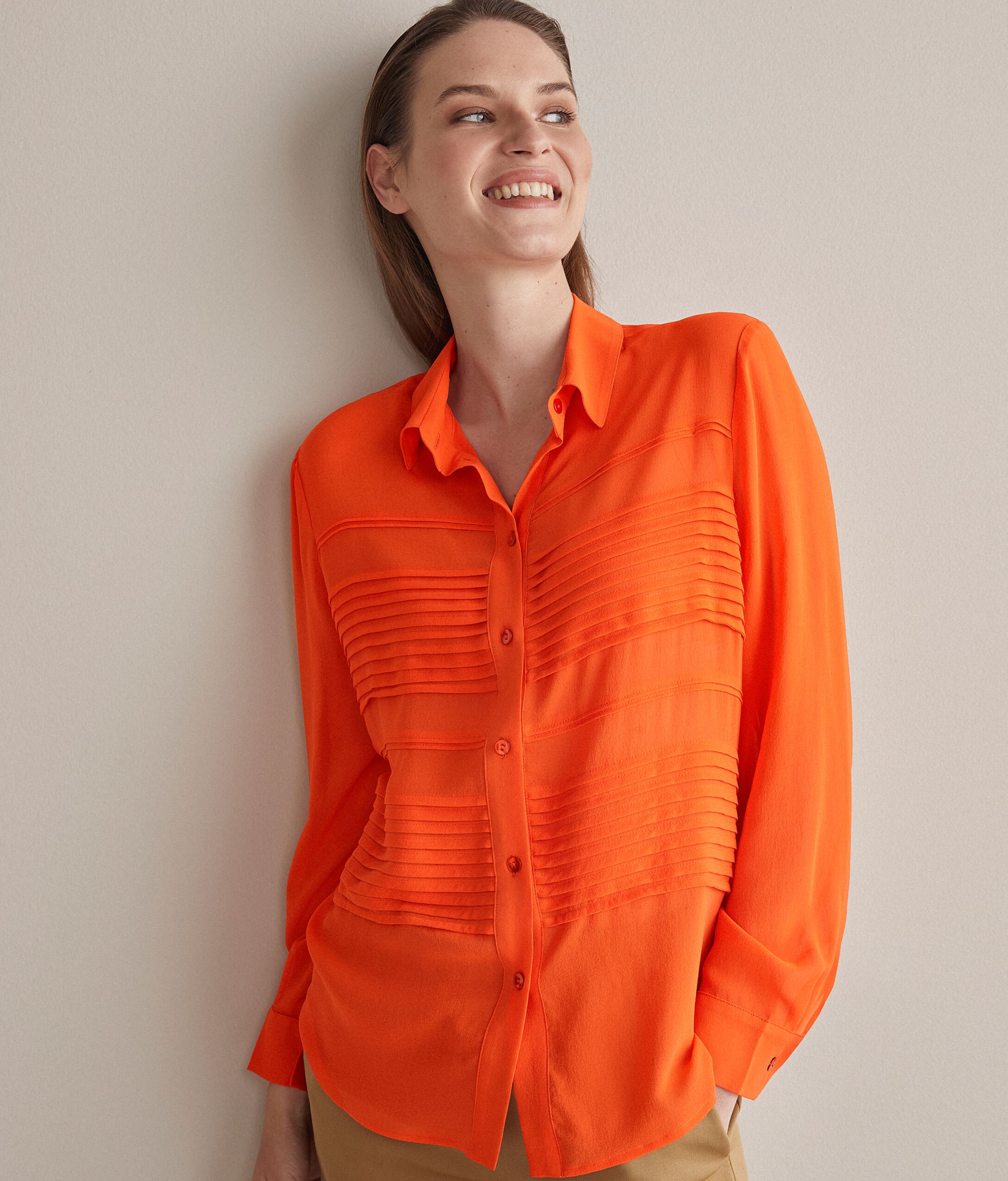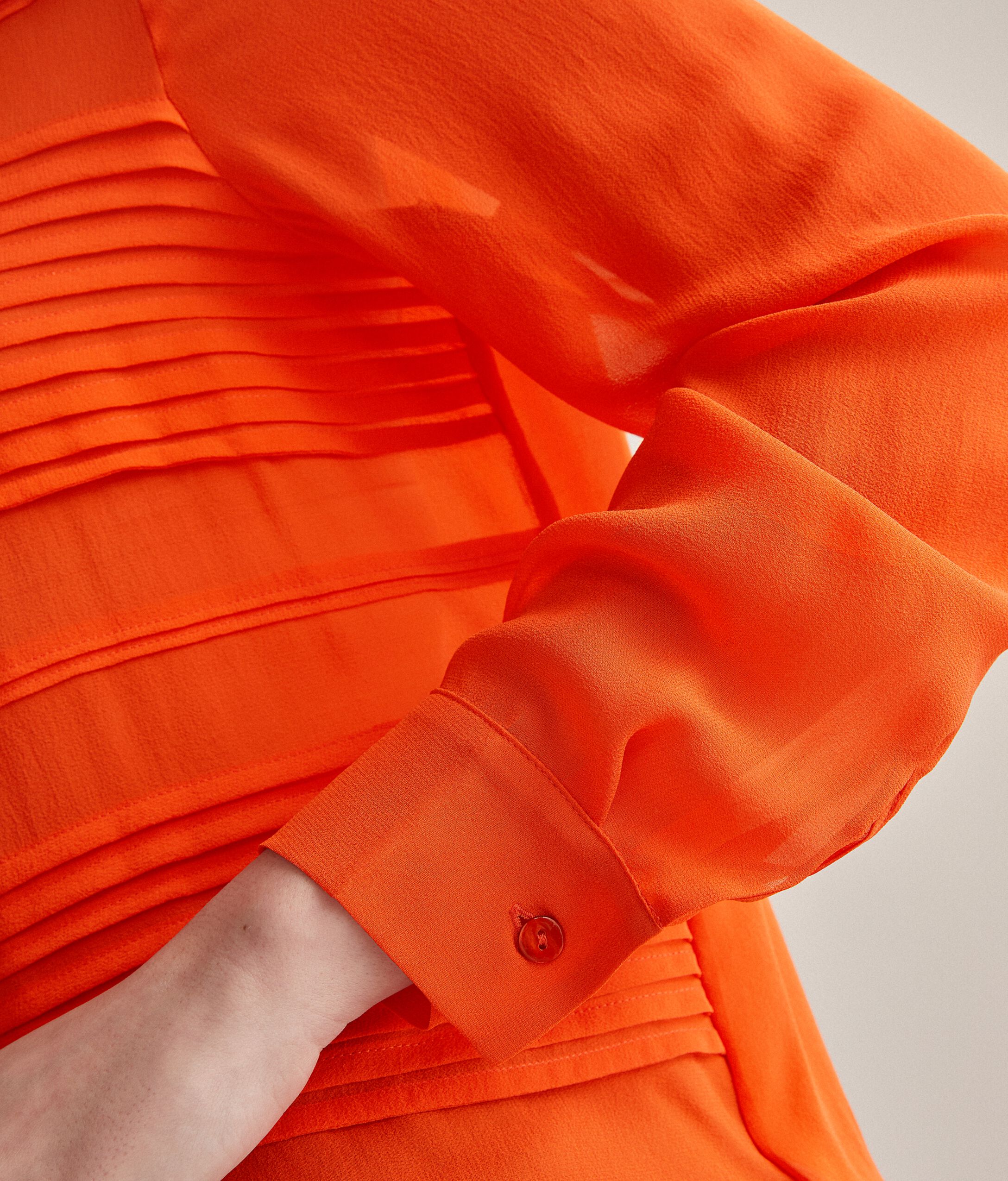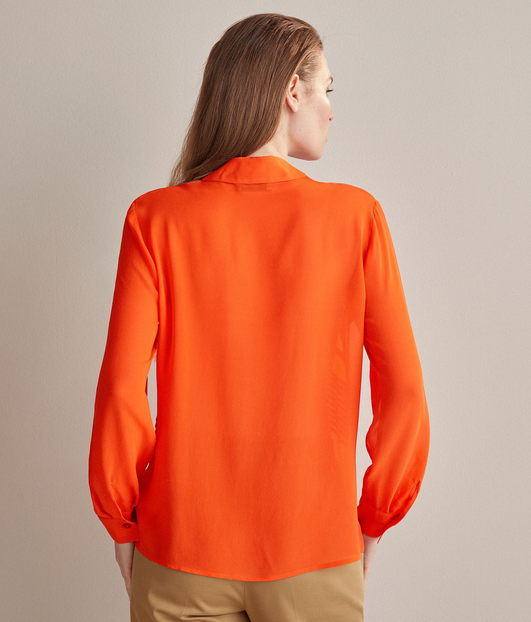 Les finitions exclusives à petits volants en soie pure témoignent d'un style unique, caractérisé par des détails prestigieux et des filés haut de gamme. Cette chemise en georgette de soie à l'effet léger et féminin affiche des lignes et des transparences discrètes. Les finitions du vêtement sont idéales pour des tenues recherchées qui ne passeront pas inaperçues. La coupe et la longueur sont régulières ; les manches sont terminées par un poignet boutonné. Le Mannequin Mesure 179 Cm Et Porte Une Taille MMPoitrine : 88 cm / Taille : 67 cm / Bassin : 94 cm