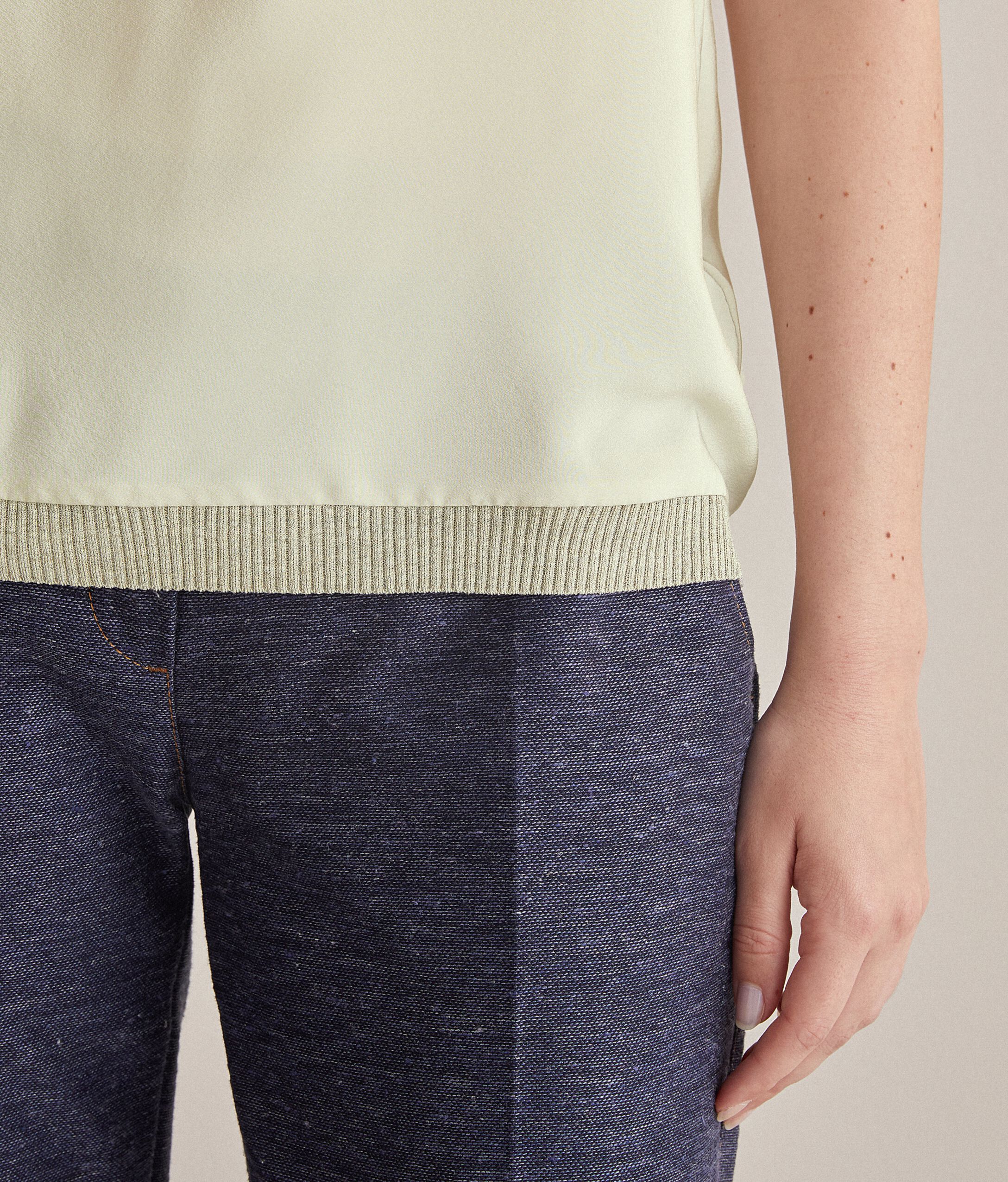 Débardeur plissé réalisé entièrement en soie avec empiècements en viscose raffinée à l'effet chatoyant sur le col, l'emmanchure et le bas. Coupe ample. Le Mannequin Mesure 178 Cm Et Porte Une Taille M Poitrine : 88 cm / Taille : 67 cm / Bassin : 94 cm
