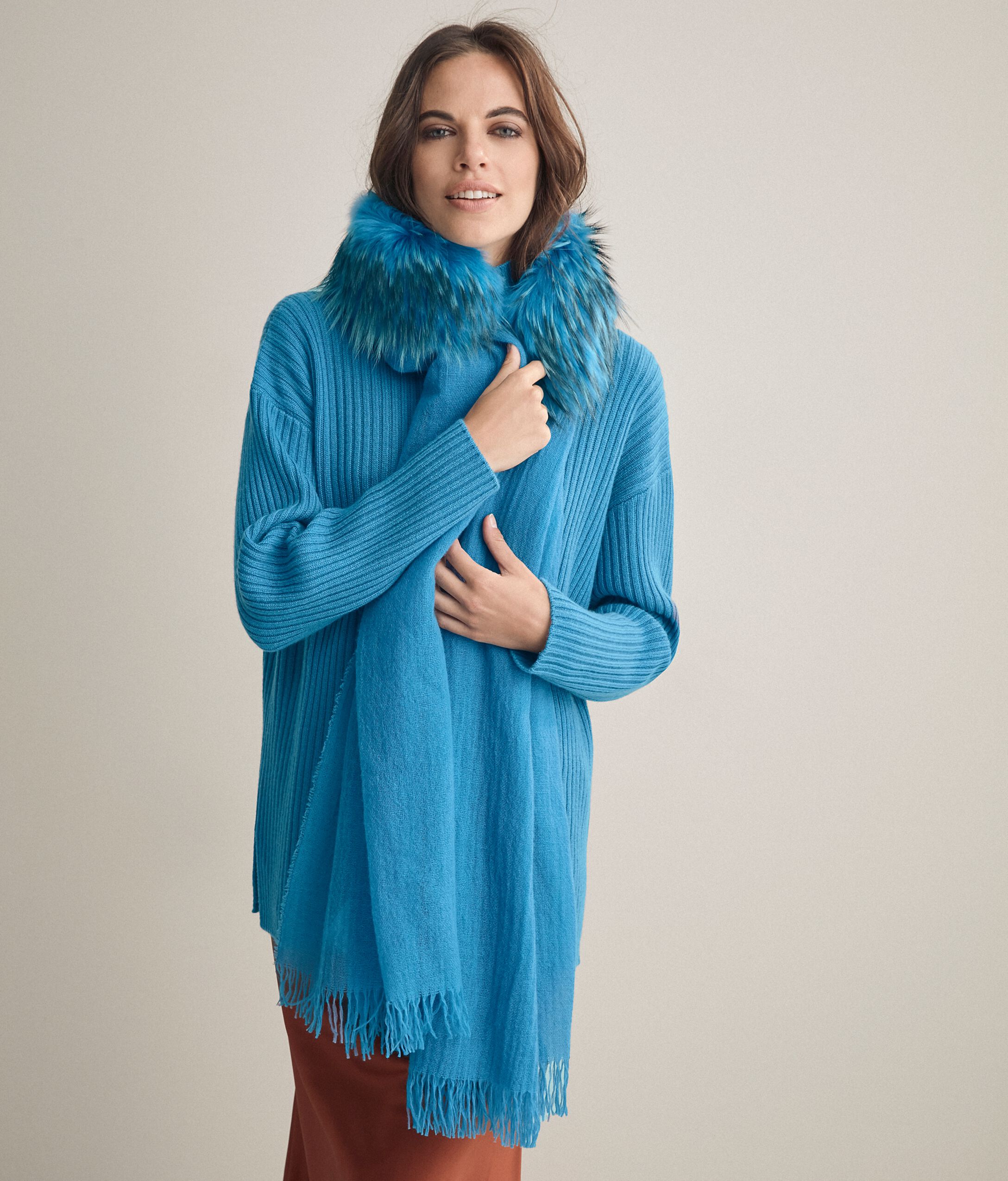 Étole en laine avec application de fourrure de raton laveur. Dimensions 70x180 cm.
