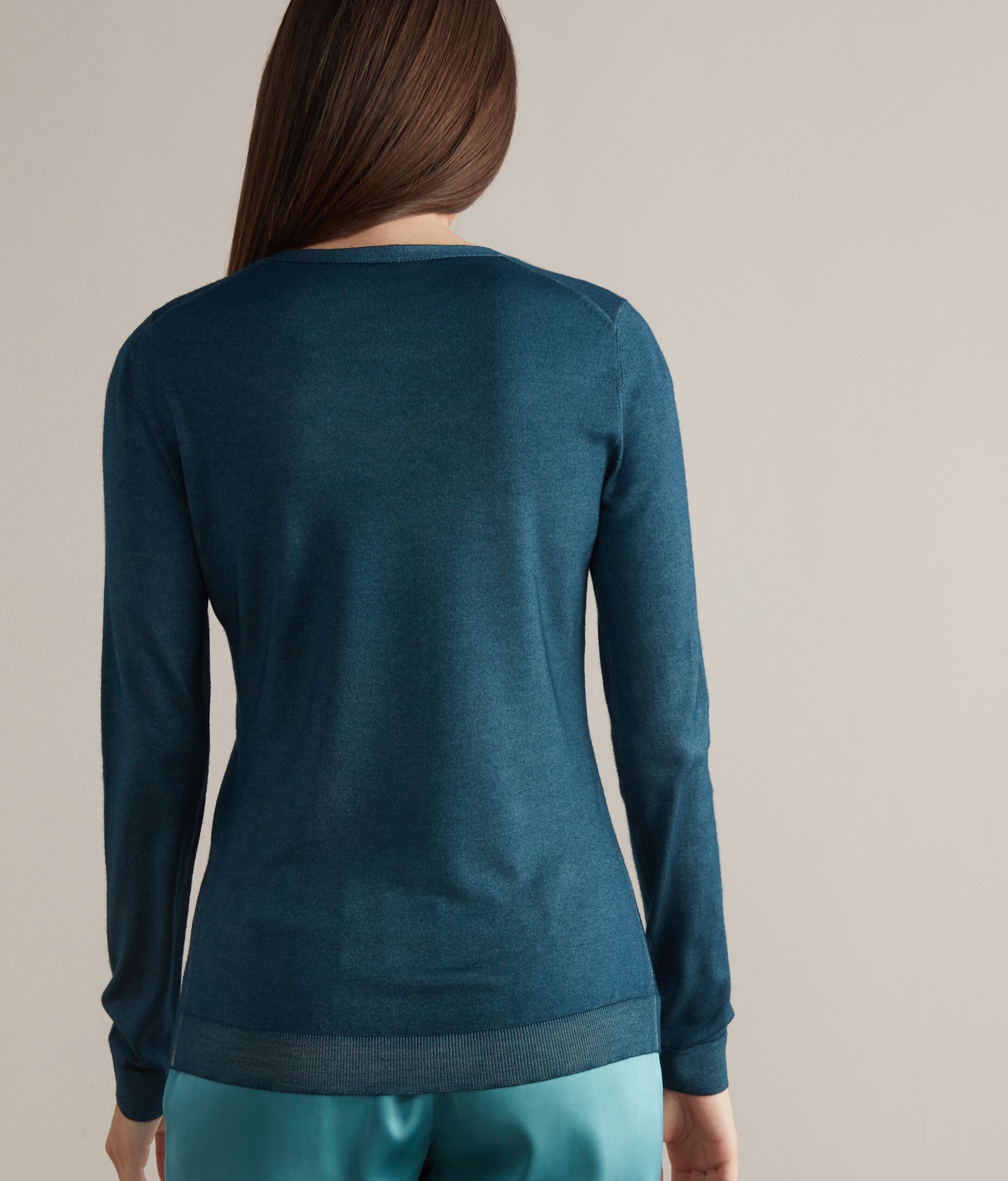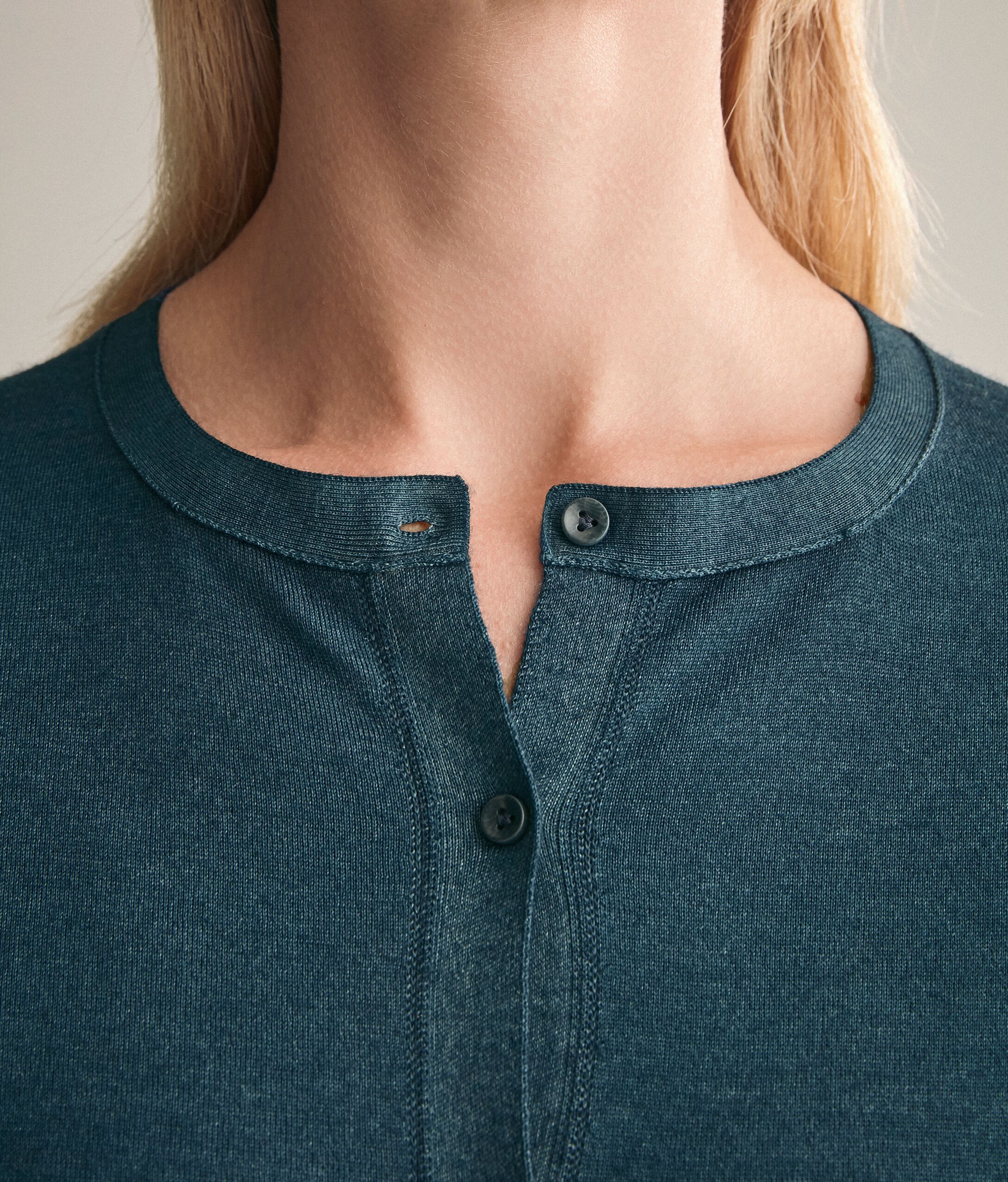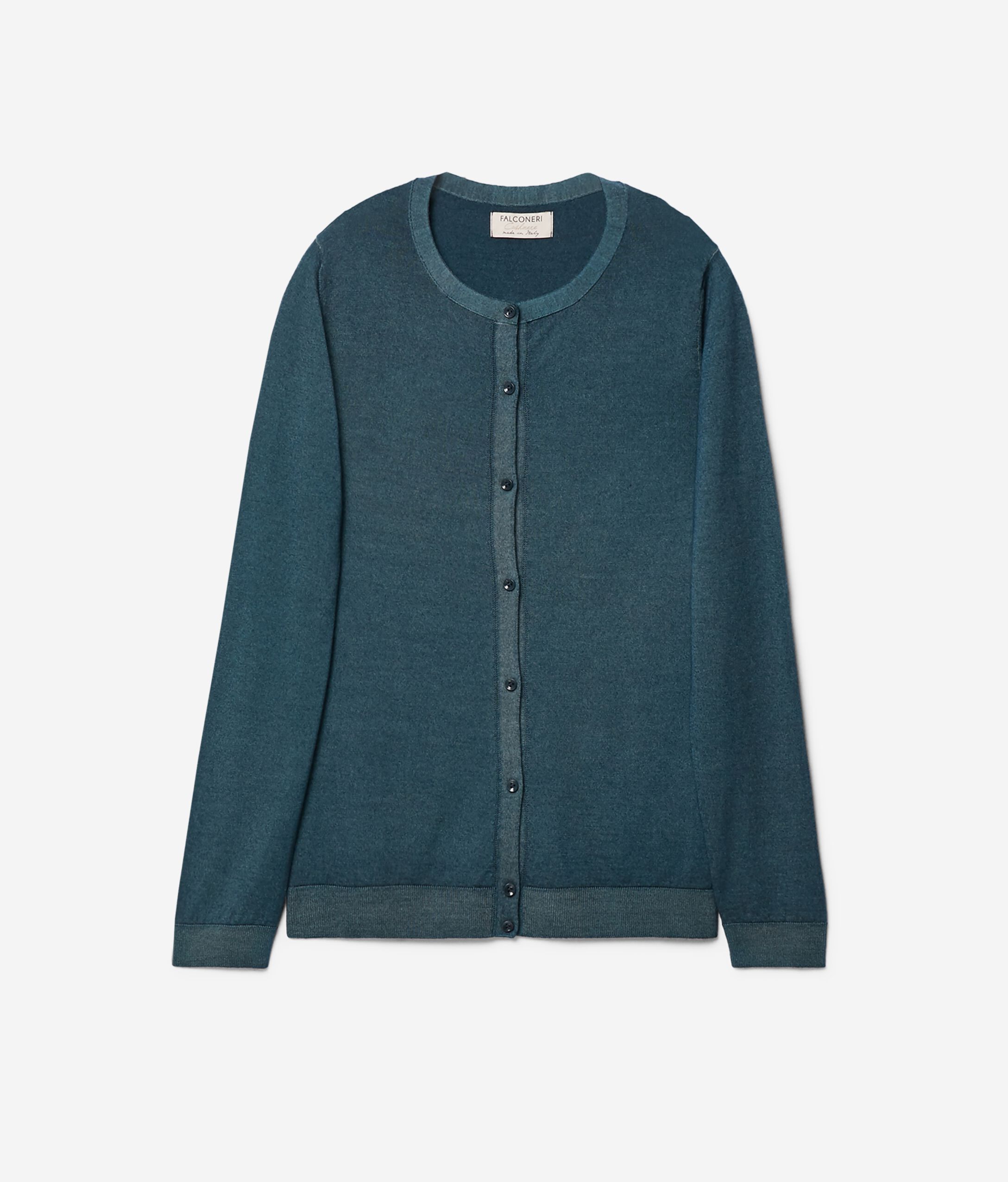 Gilet à col rond en cachemire ultra-léger au point jersey peigné.Caractérisé par une ouverture avec patte de boutonnage et des emmanchures légèrement tombantes. Il se porte idéalement en twinset avec notre débardeur DMC261C.
