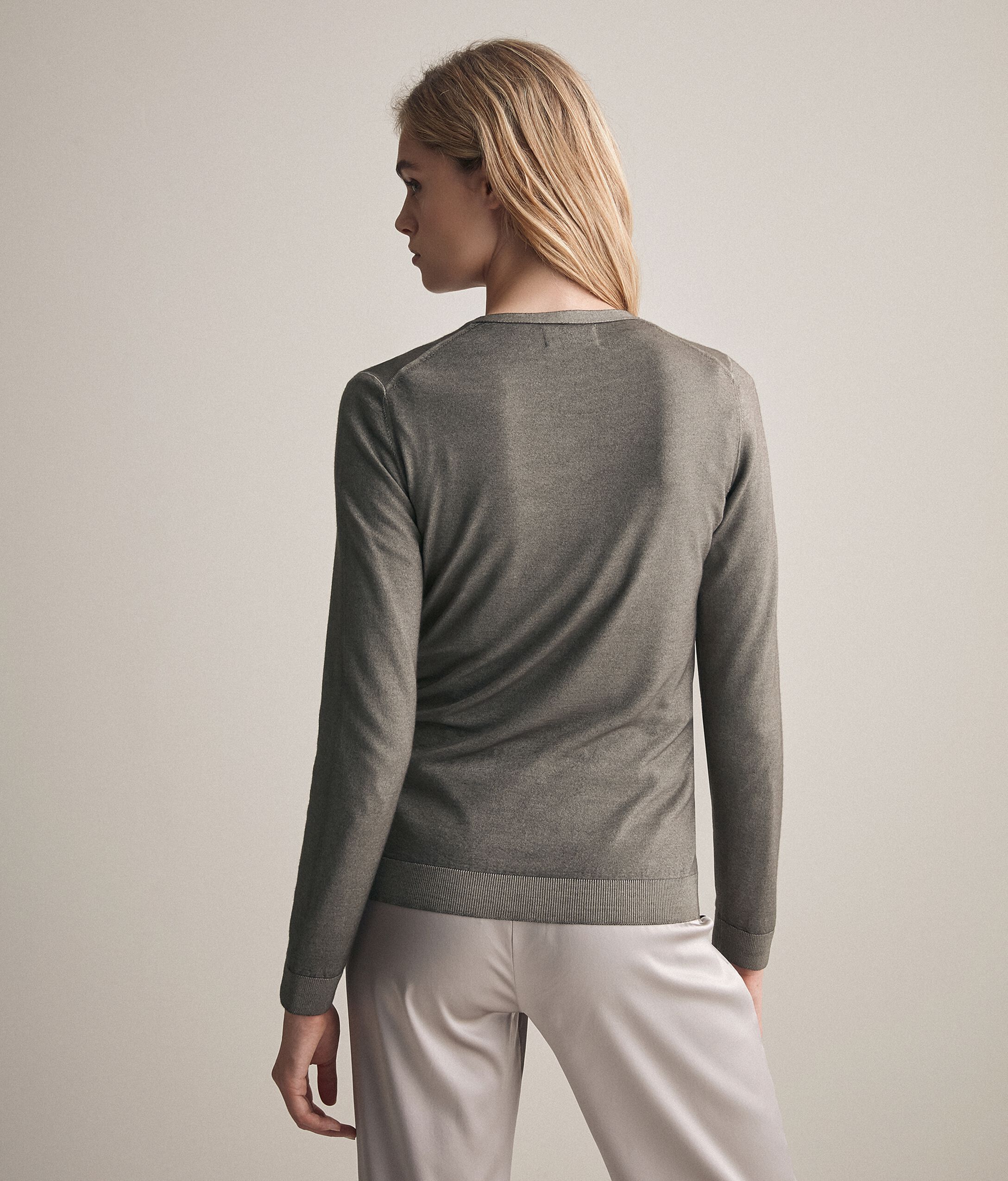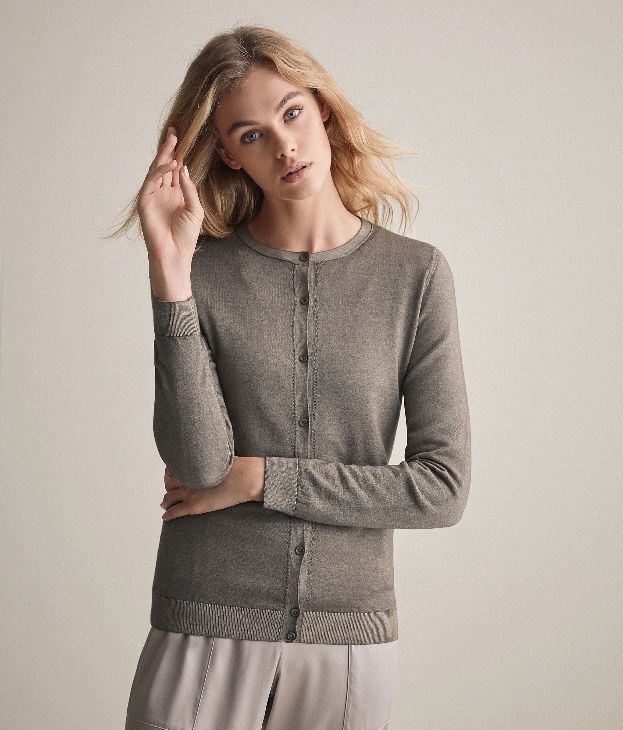 Gilet à col rond en cachemire ultra-léger au point jersey peigné.Caractérisé par une ouverture avec patte de boutonnage et des emmanchures légèrement tombantes. Il se porte idéalement en twinset avec notre débardeur DMC261C.