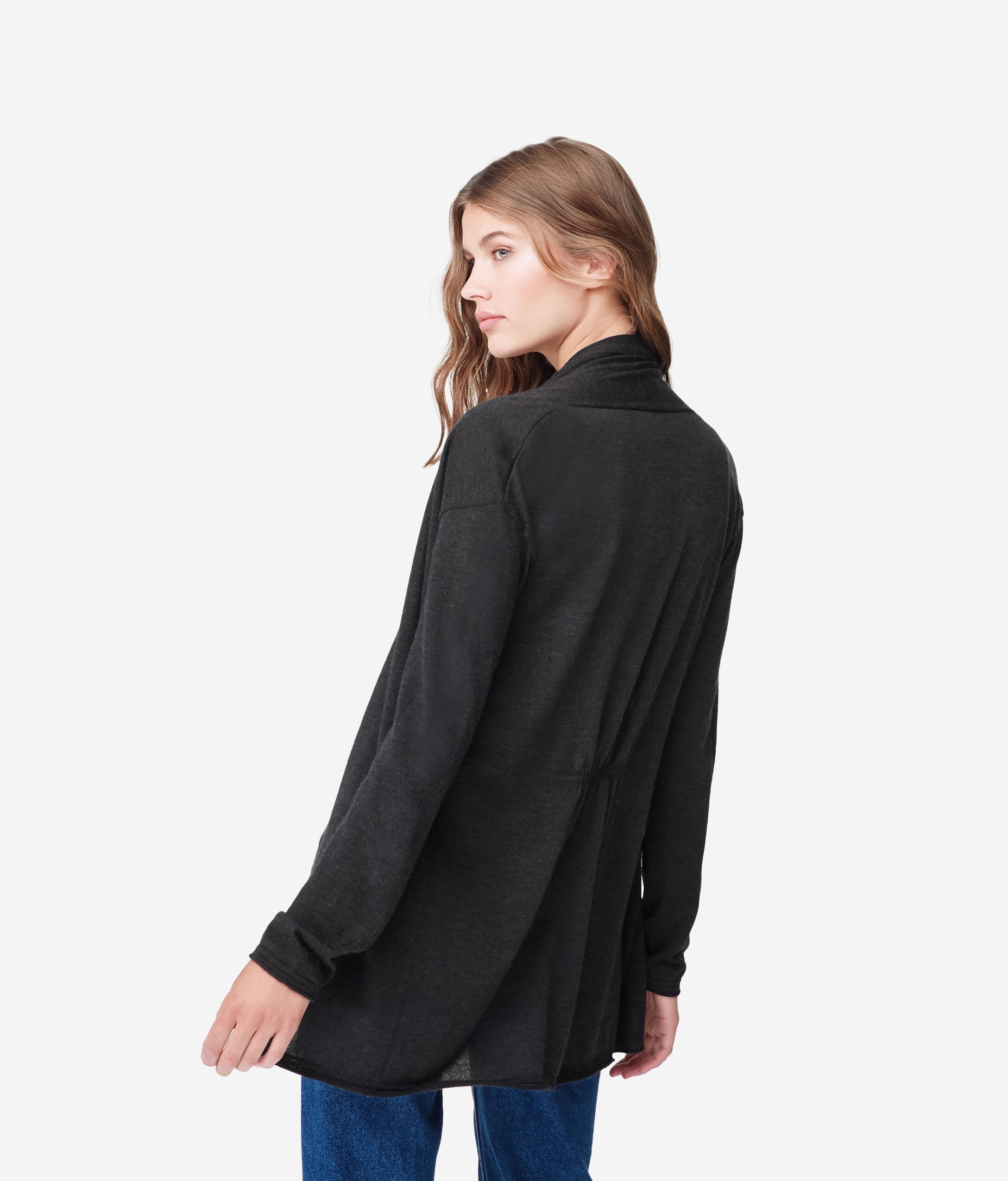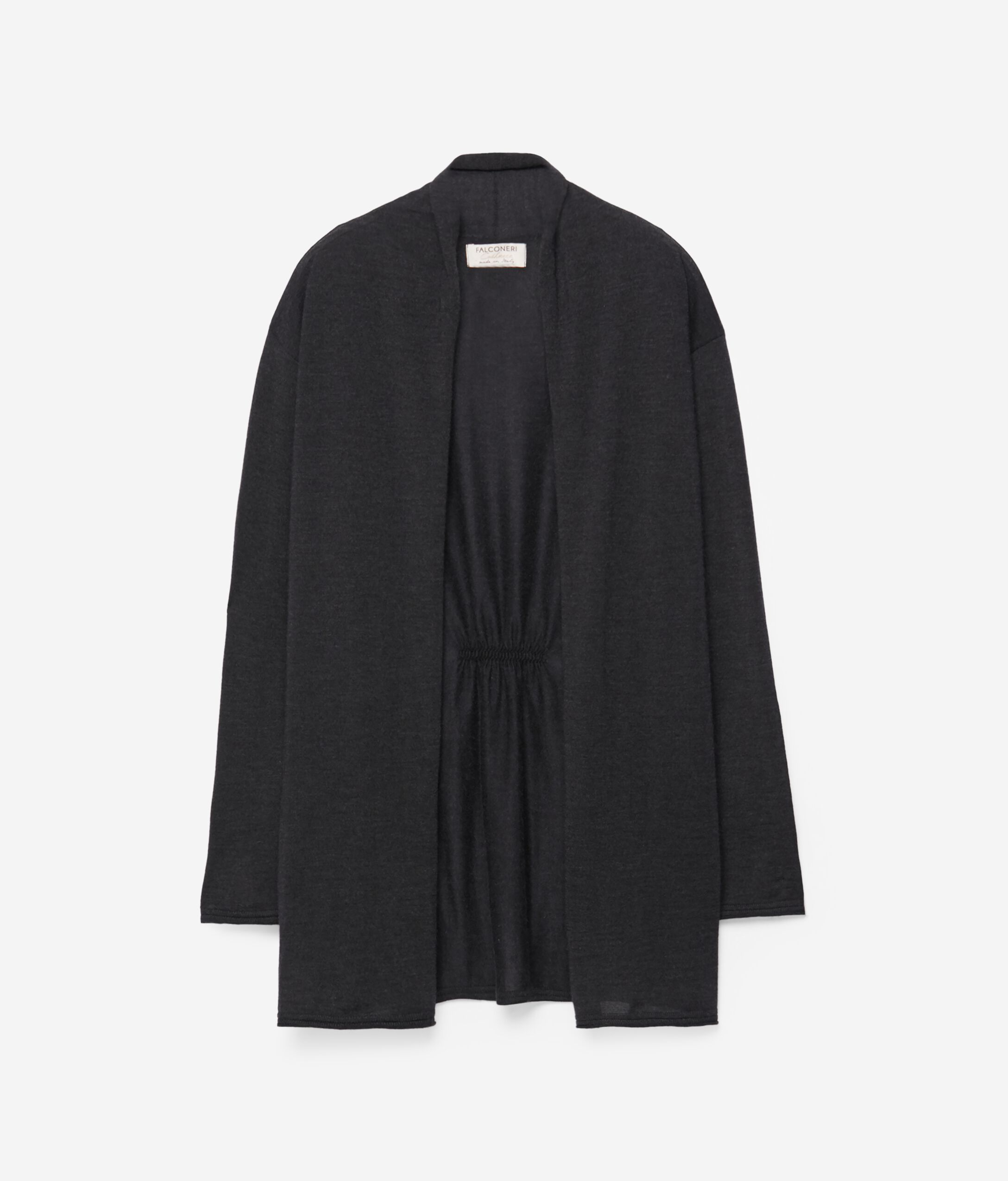 Gilet long ouvert, col châle, manches longues. 100% cachemire ultra-léger, sans coutures. Manches avec finition à motif tubulaire. Fronces dans le dos pour un plus joli porté.