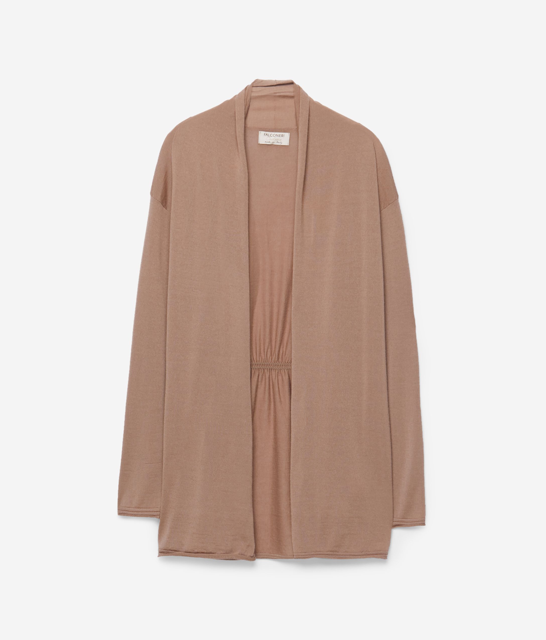 Gilet long ouvert, col châle, manches longues. 100% cachemire ultra-léger, sans coutures. Manches avec finition à motif tubulaire. Fronces dans le dos pour un plus joli porté.
