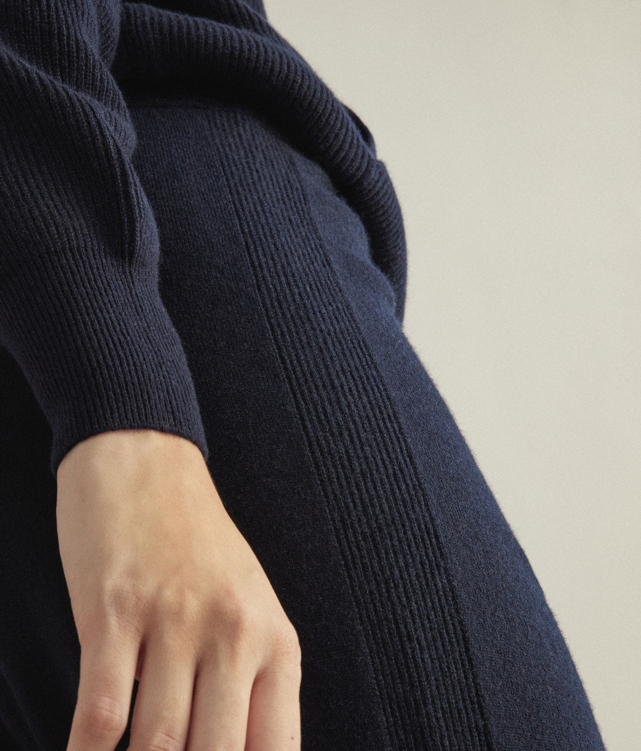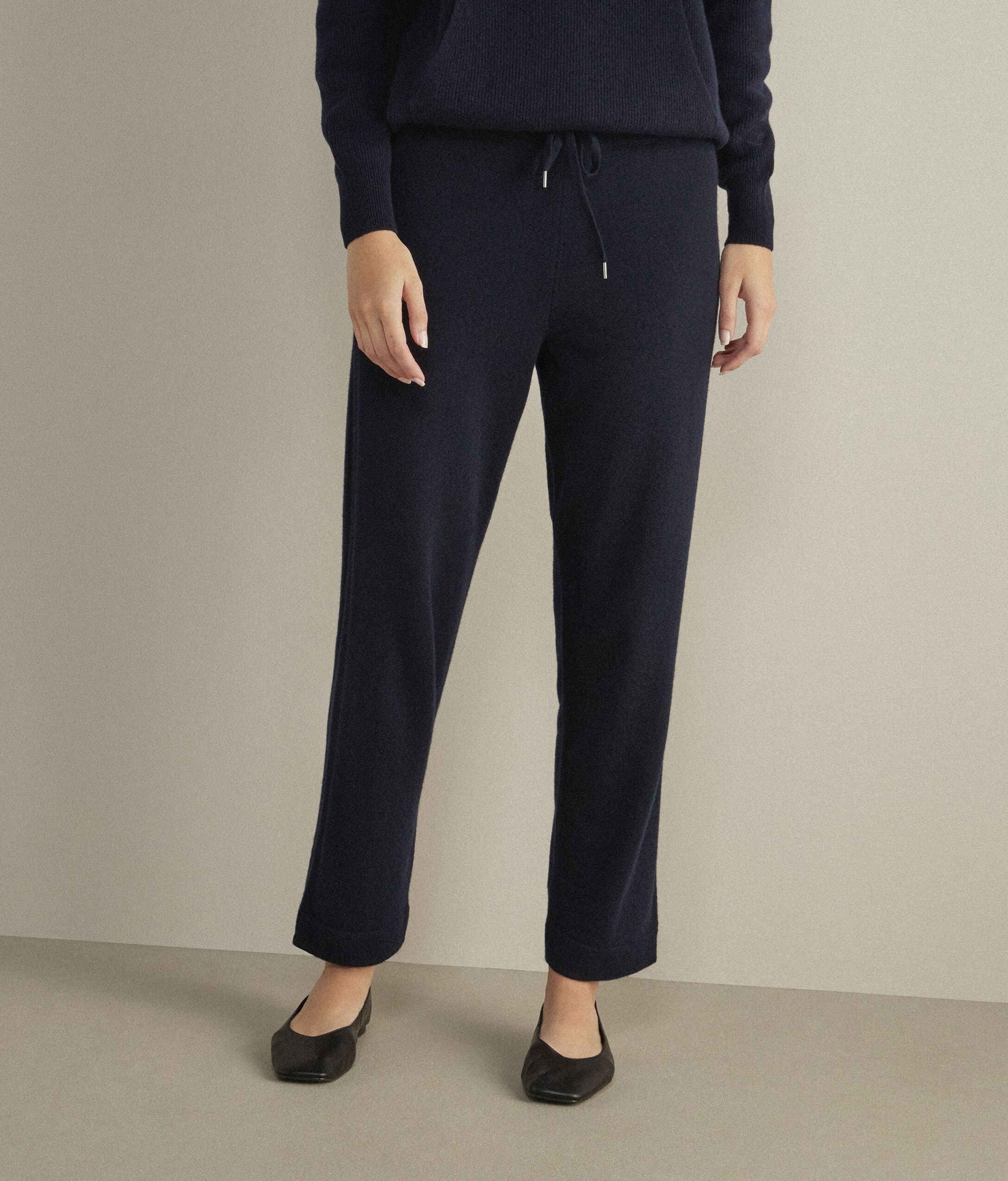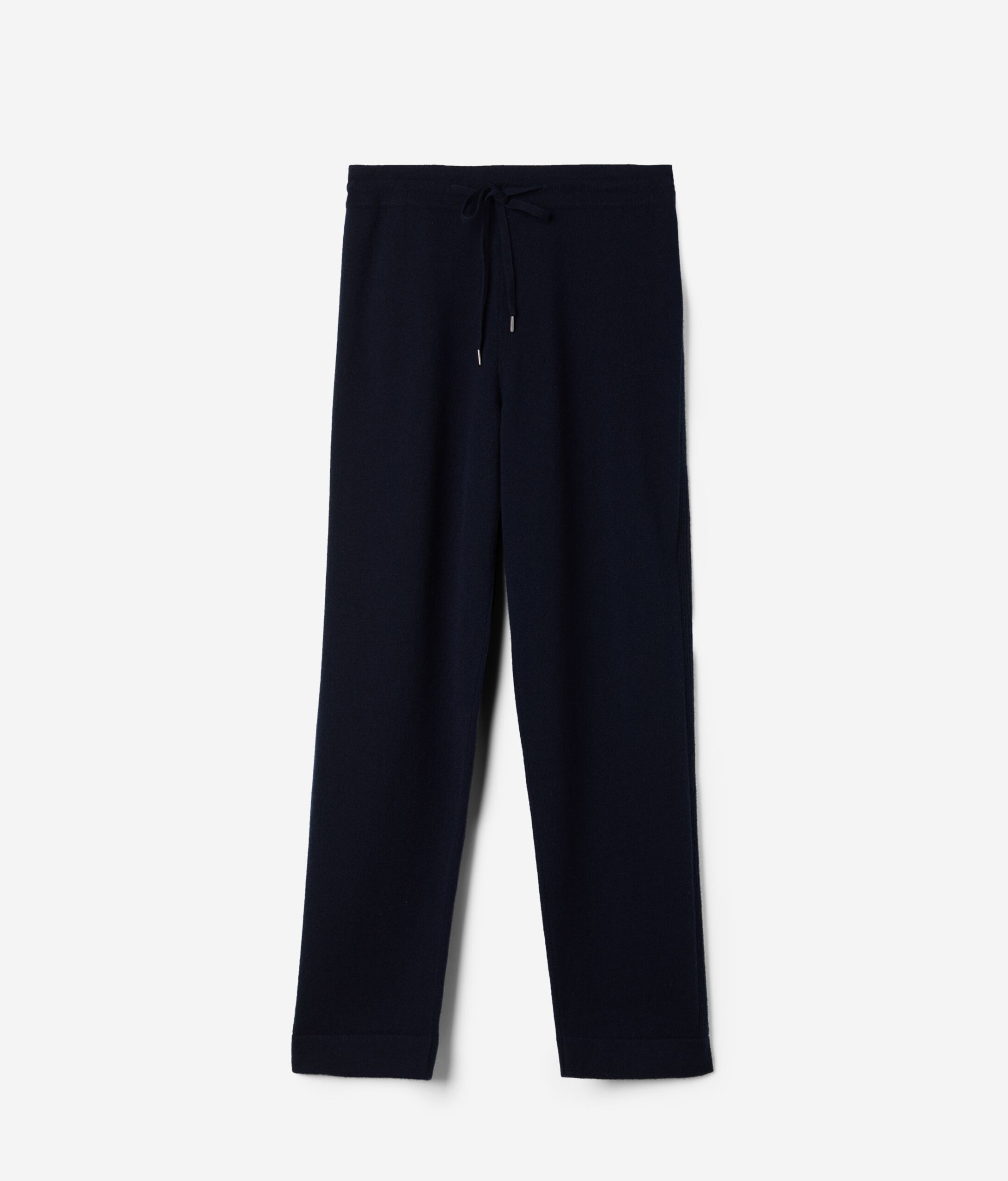 Pantalon en cachemire ultra-doux avec cordon coulissant à la taille, jambes droites fendues aux ourlets et bandes latérales côtelées. Ses longueurs sont définies par des poignets côtelés en coton. Idéal en association au pull DML458M.