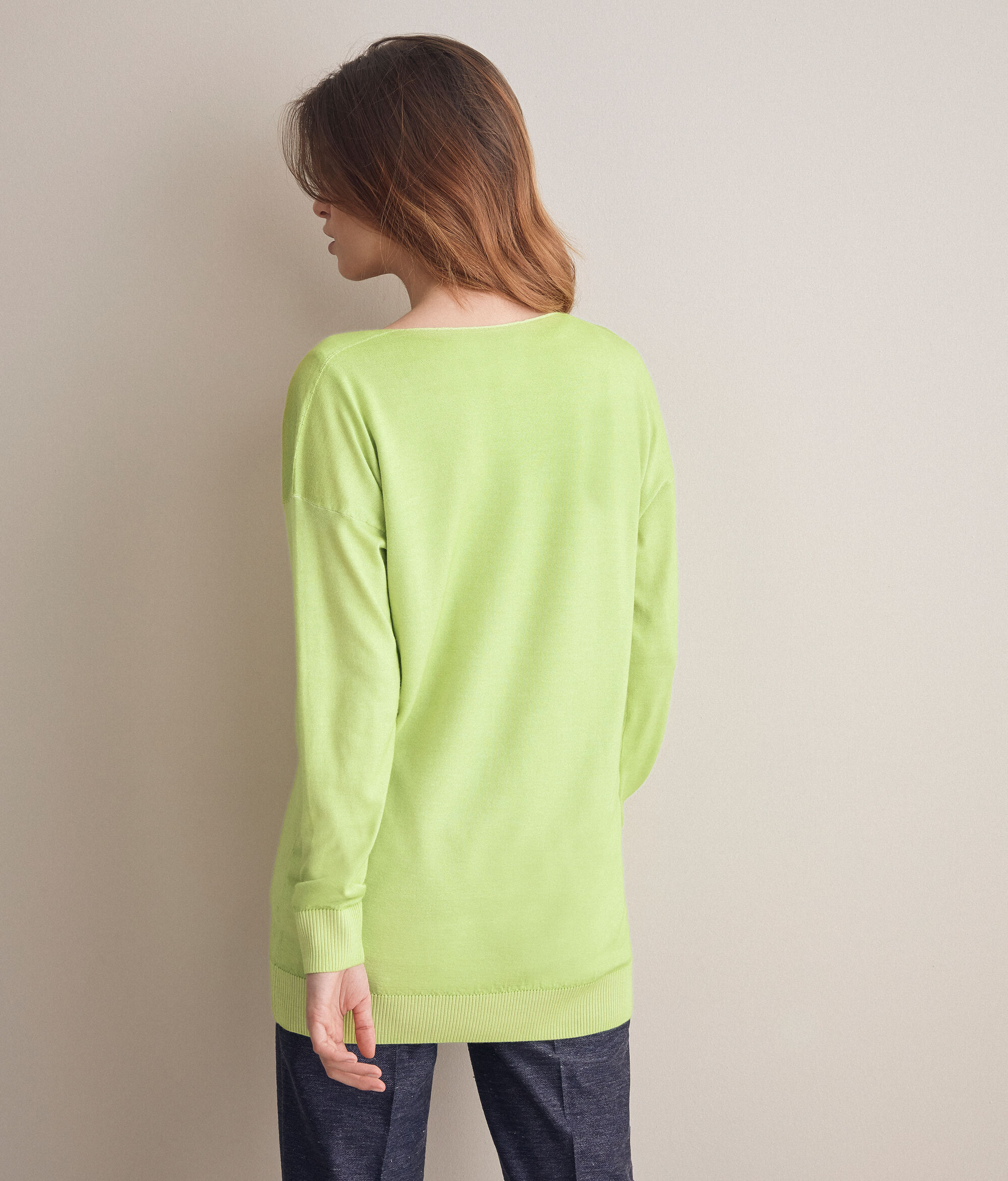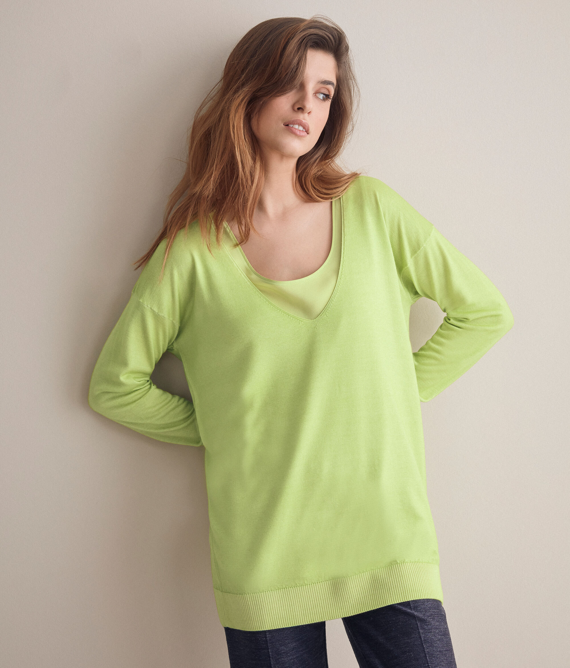 Pull large à col en V en pur Cachemire ultra-fin. Il présente une épaule tombante et une finition côtelée sur les poignets et le bas. Coupe ample.