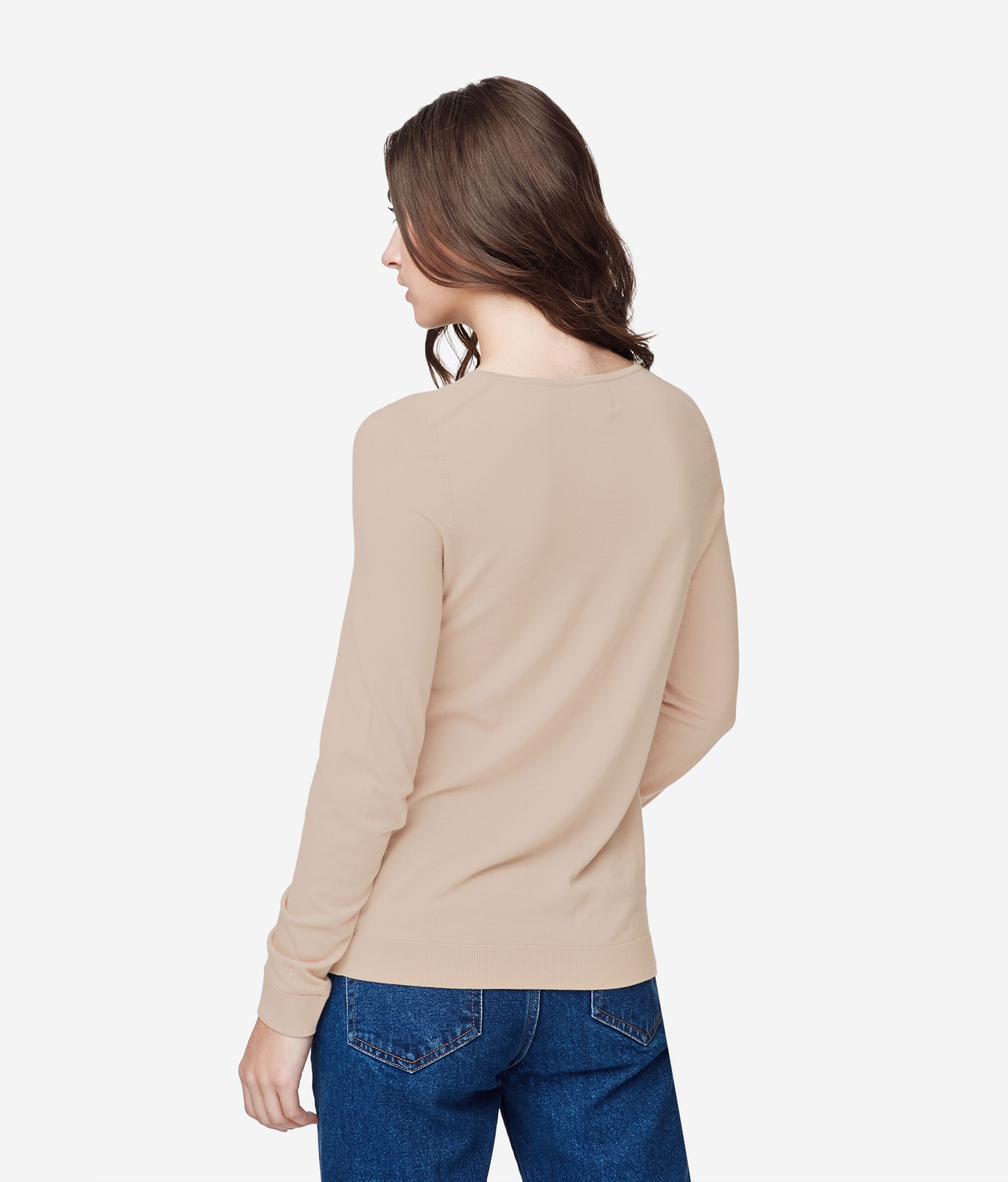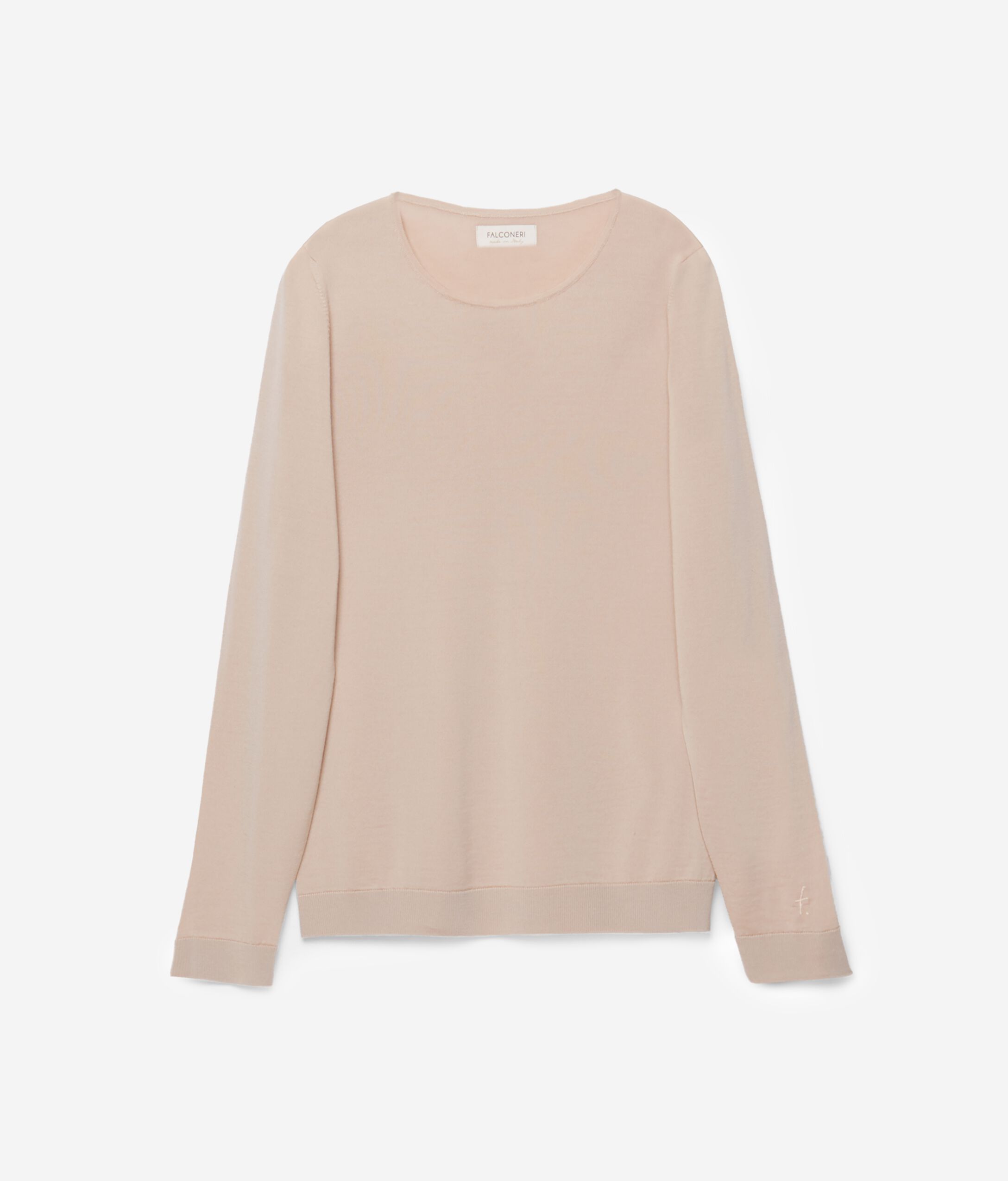 Pull ras de cou à manches longues, entièrement en laine mérinos. Coupe droite. Le Mannequin Mesure 178 Cm Et Porte Une Taille M Made in Italy