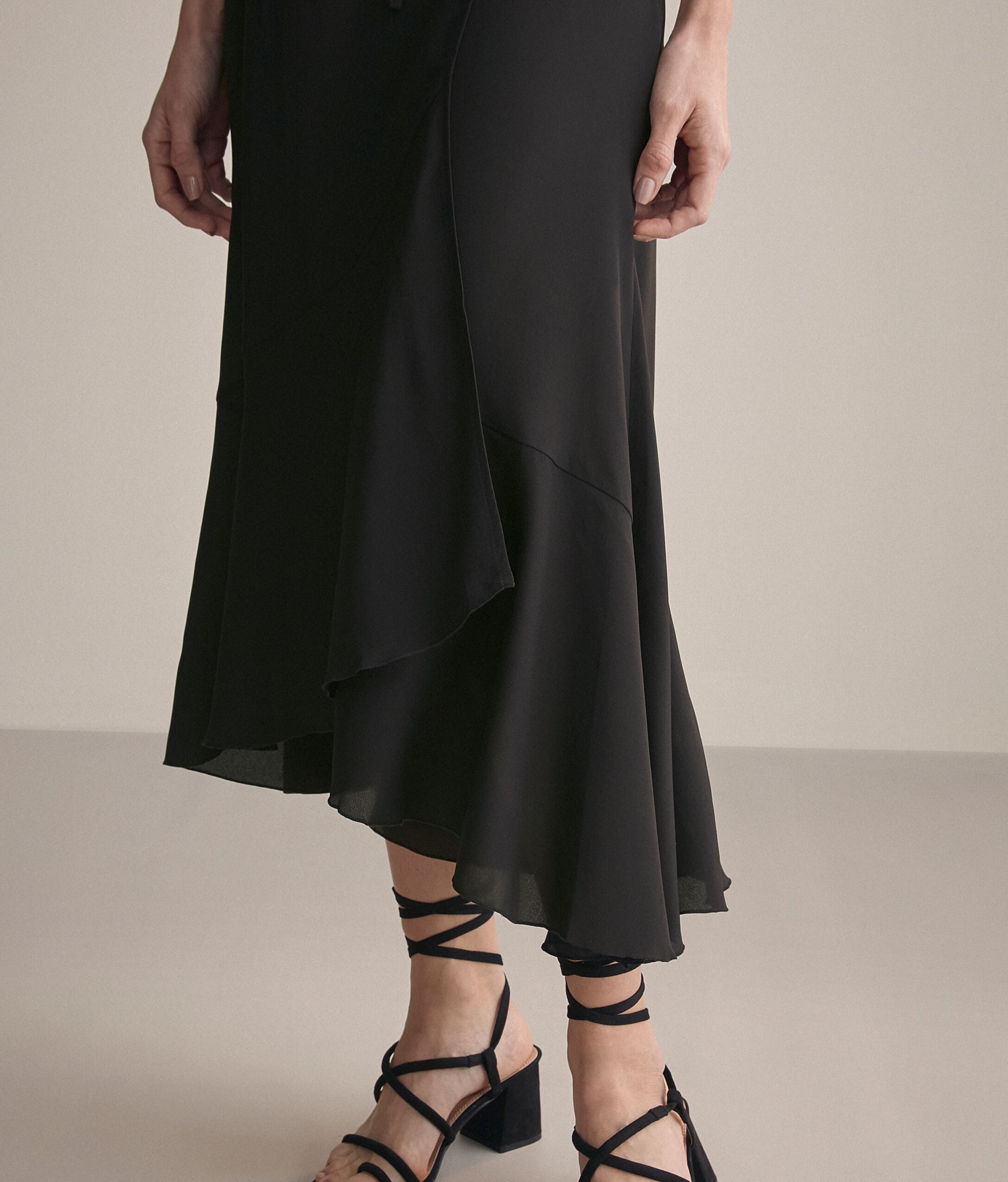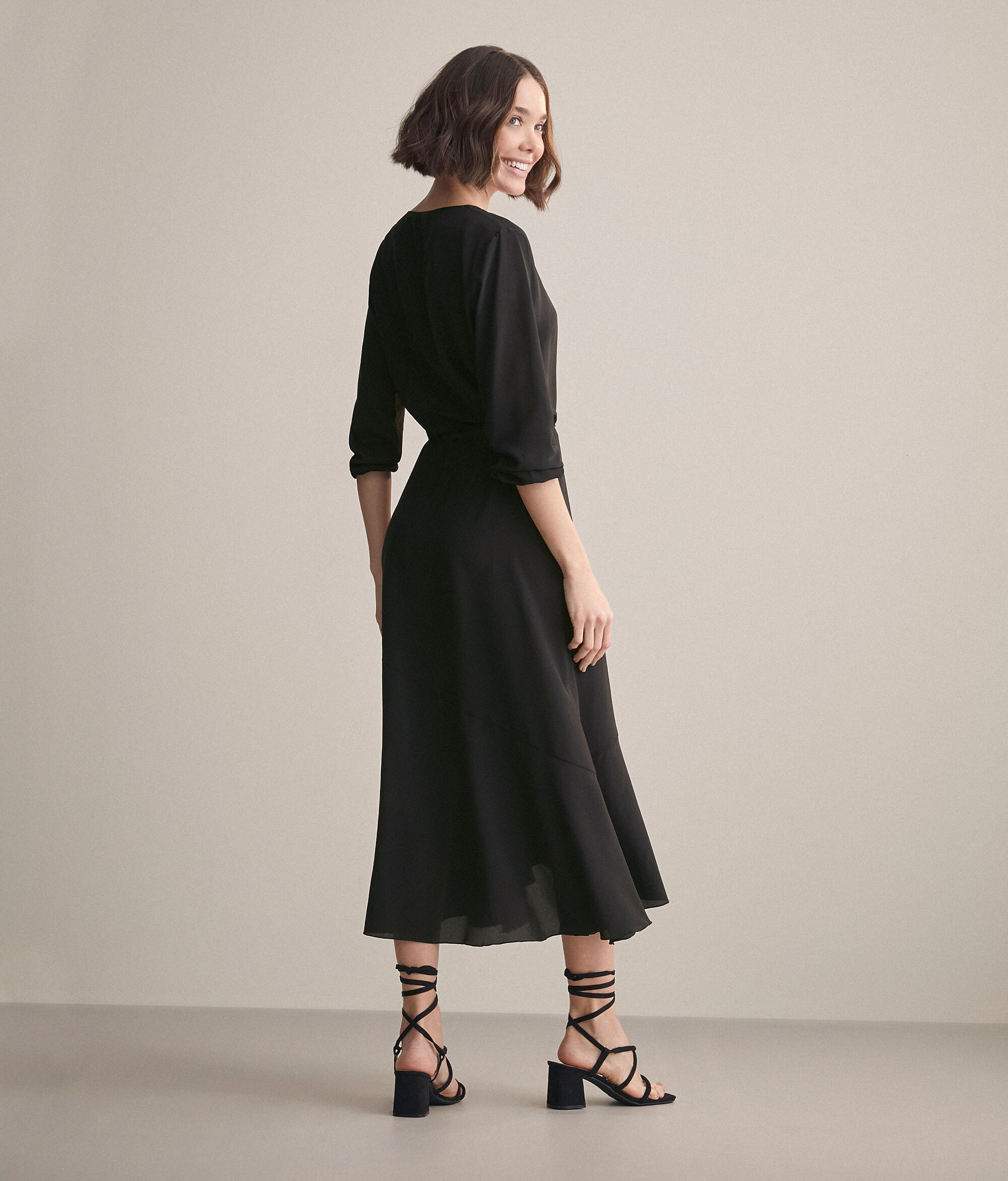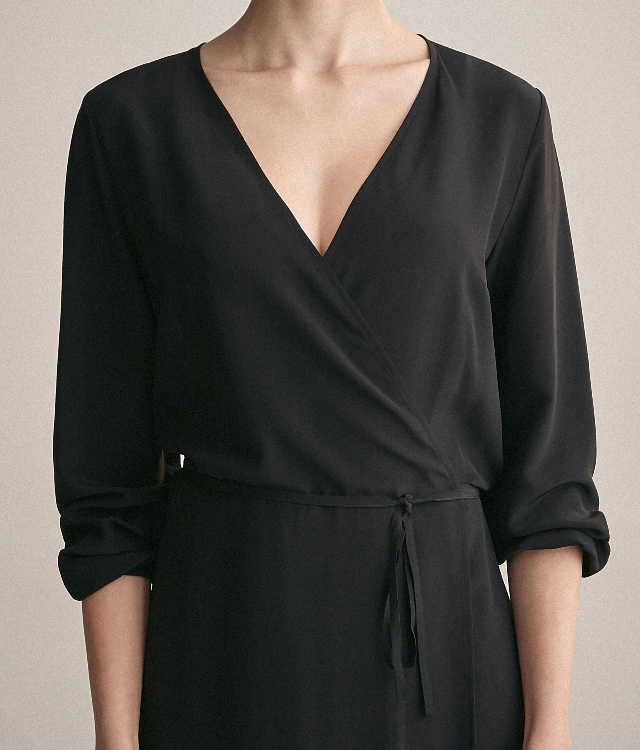 Des lignes fluides et des détails féminins apportent une touche unique à cette robe portefeuille. Sa coupe légère et déstructurée est mise en valeur par la texture naturelle et raffinée de la soie pure. Des manches 3/4 terminées par un élastique et une jupe arrivant au mollet lui apportent une touche un peu plus moderne. Le Mannequin Mesure 179 Cm Et Porte Une Taille MMPoitrine : 88 cm / Taille : 67 cm / Bassin : 94 cm