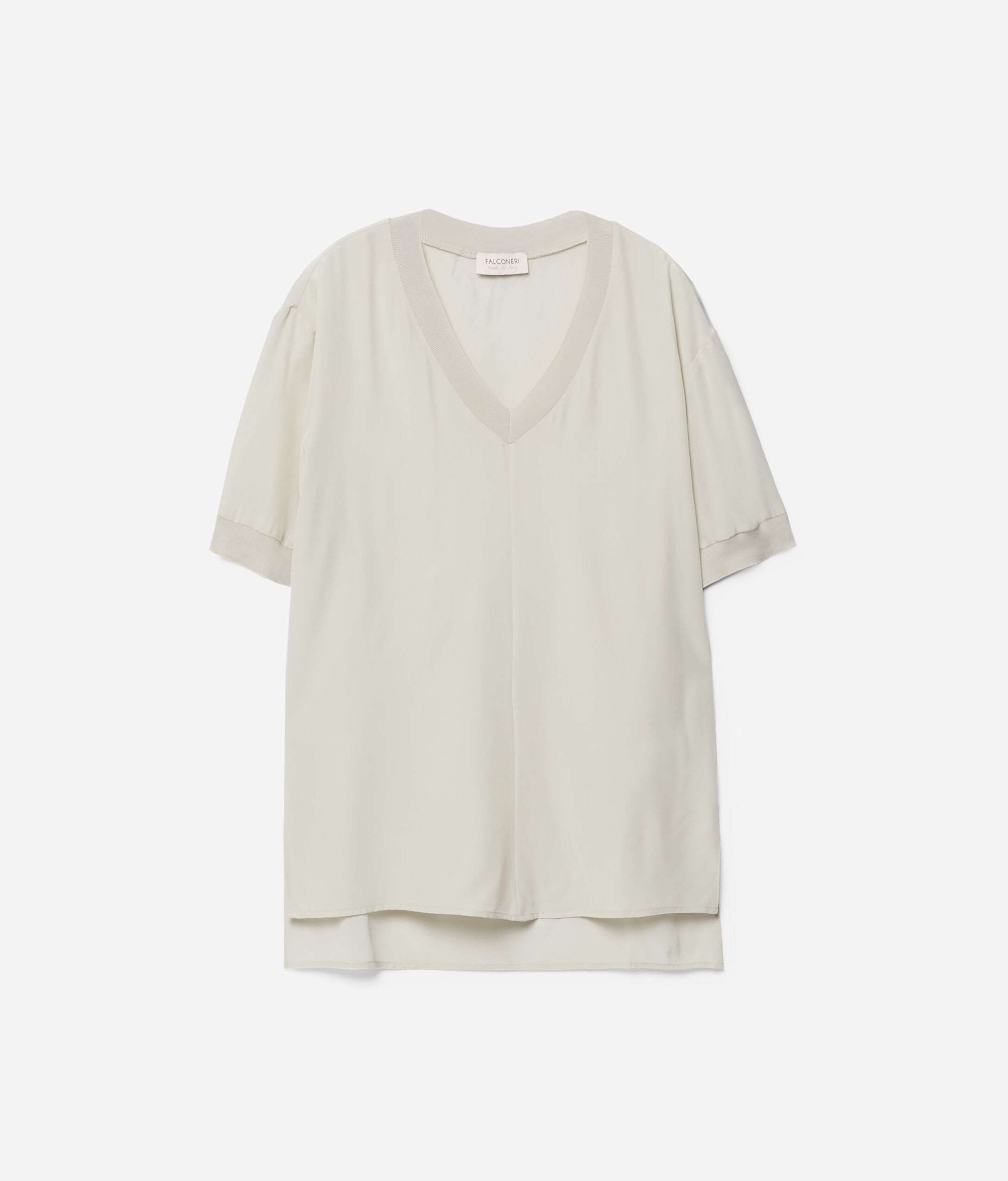 T-shirt à décolleté en V en soie, avec empiècements en maille de coton côtelé sur le bord des manches et sur l'encolure. Il se caractérise par des petites fentes latérales et des emmanchures basses. Coupe fluide.