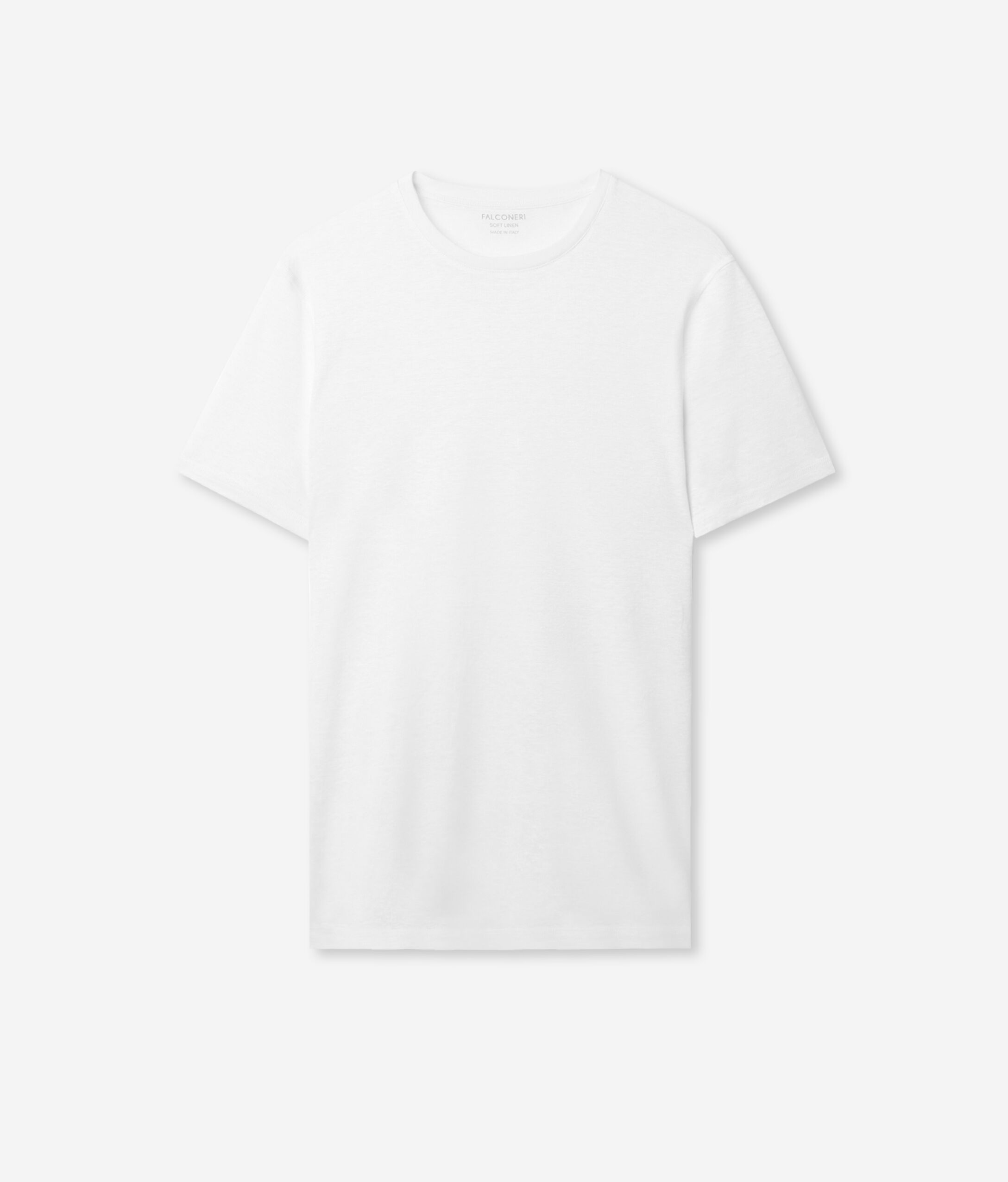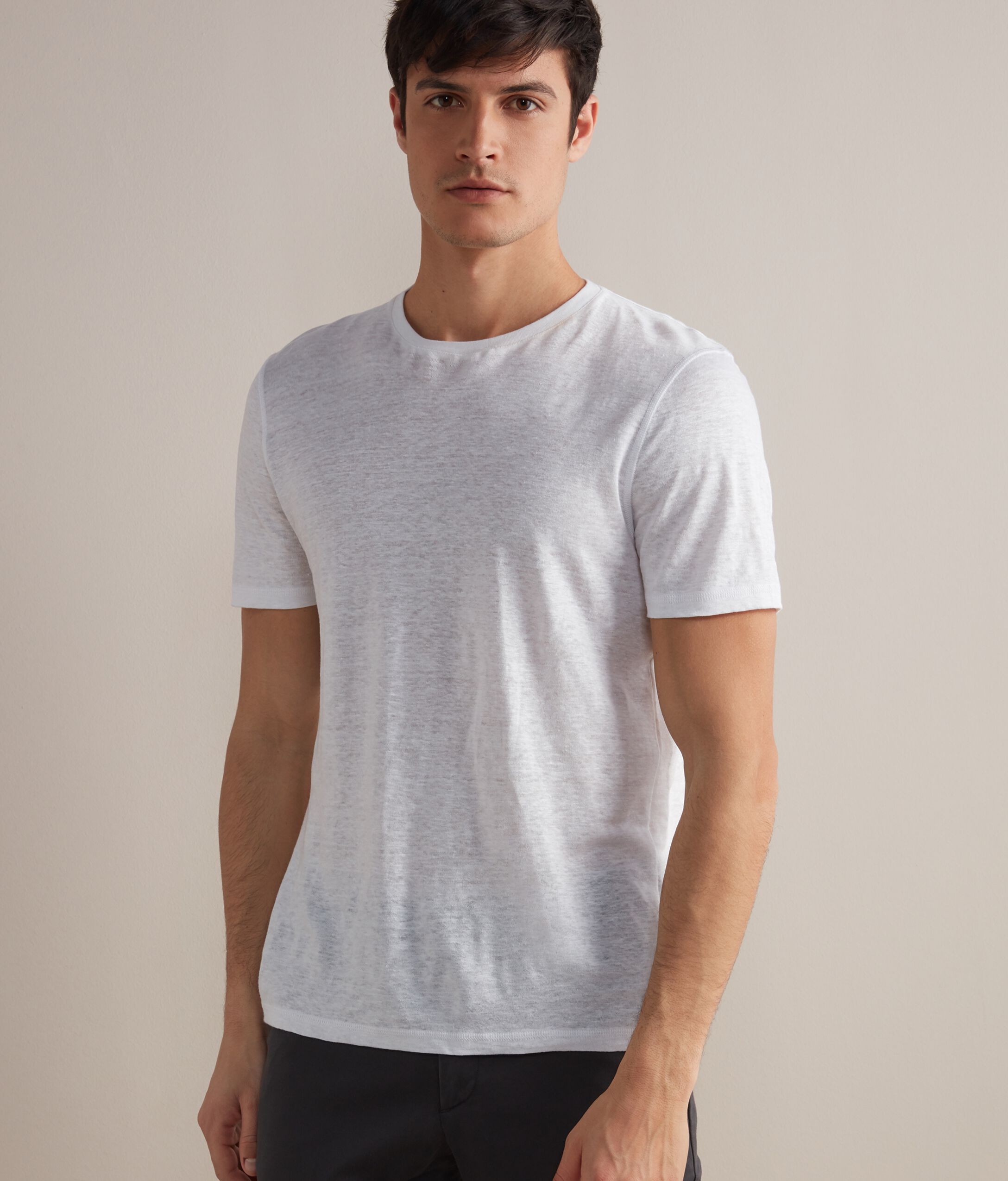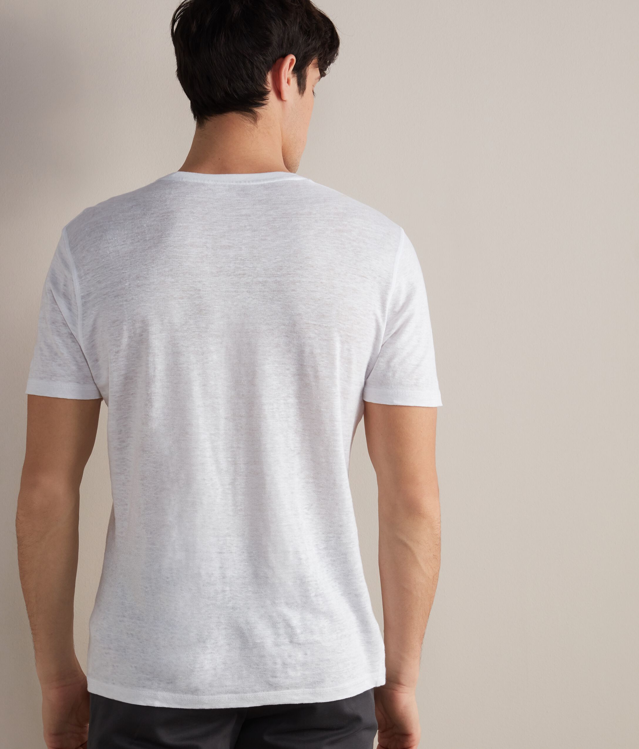 Ce t-shirt en jersey de lin flammé à col rond et manches courtes affiche un style désinvolte et polyvalent, qui s'intégrera facilement à un look plus décontracté. L'aspect irrégulier et les imperfections du tissu flammé constituent une caractéristique prestigieuse qui rend chaque vêtement unique. Il présente une coupe et une longueur standard. Le mannequin mesure 184 cm et porte une taille 50 Poitrine : 98 cm / Taille : 82 cm / Bassin : 99 cm