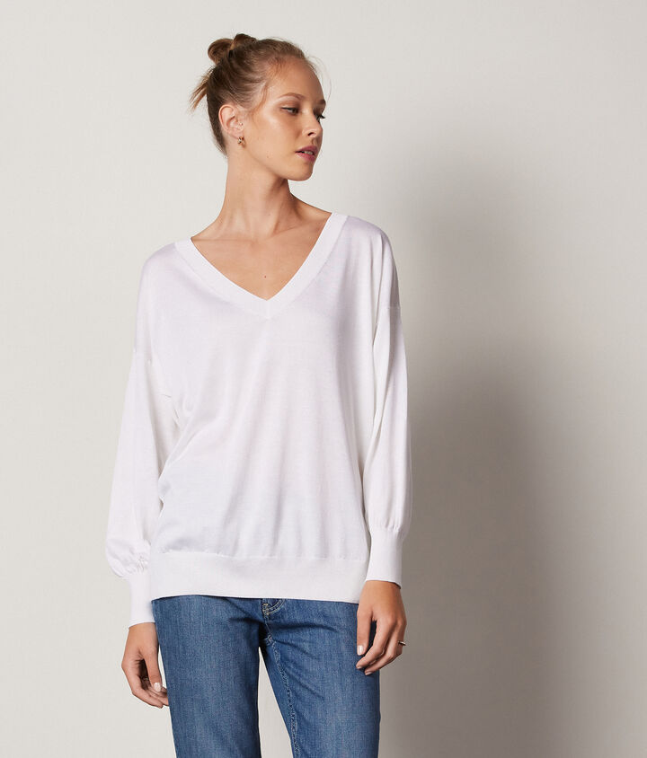 V-Neck Silk and Cotton Jumper with Balloon Sleeves€148.00Select your colourWhiteSaltNavy Blue+ 1Selected color: White