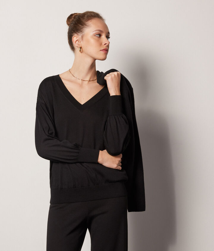V-Neck Silk and Cotton Jumper with Balloon Sleeves€148.00Select your colourBlackWhiteSalt+ 1Selected color: Black