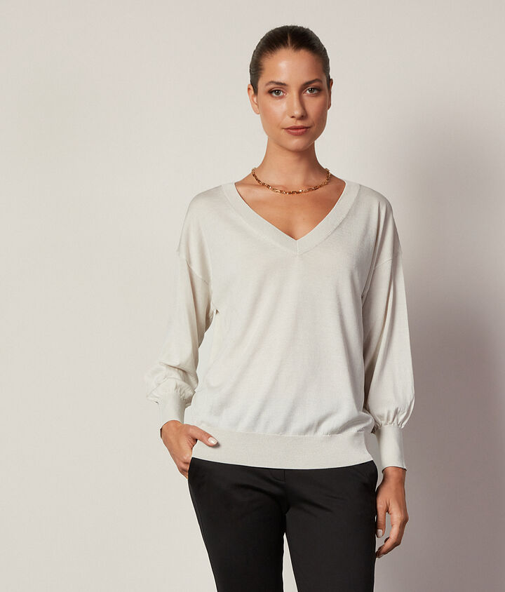 V-Neck Silk and Cotton Jumper with Balloon Sleeves€148.00Select your colourSaltWhiteNavy Blue+ 1Selected color: Salt
