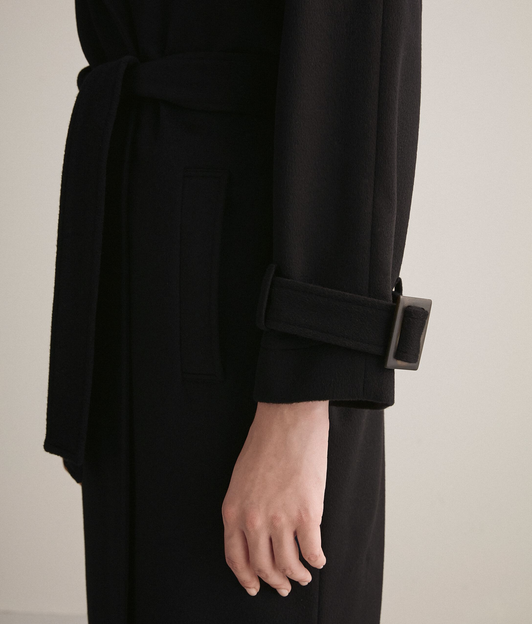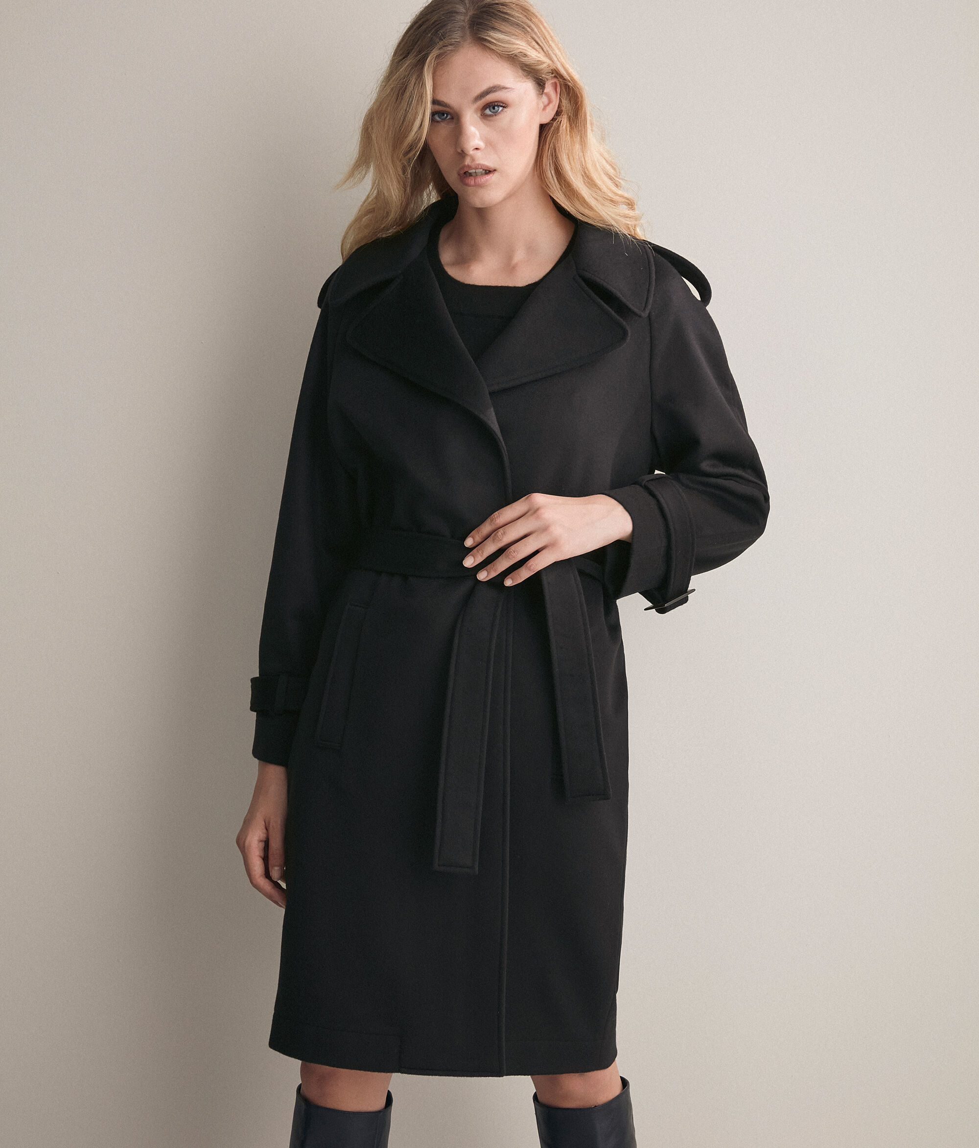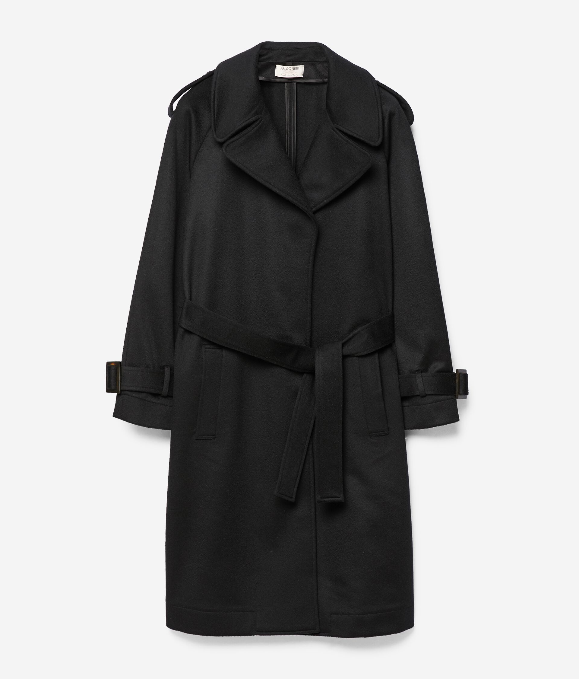 100% cashmere trench coat with belt fastening at the waist. Embellished with flashes on the shoulders, belt and straps at the wrists. Regular length and fit. Model is 179 cm tall and wears a size MChest: 88cm / Waist: 67cm / Hips: 94cm