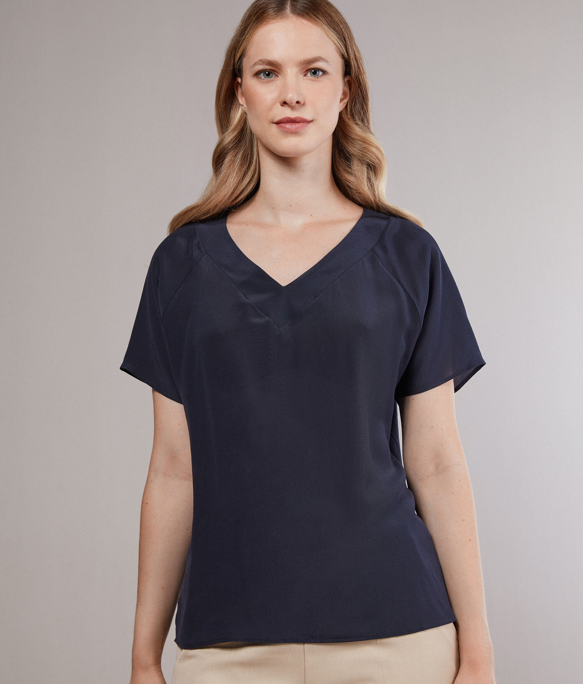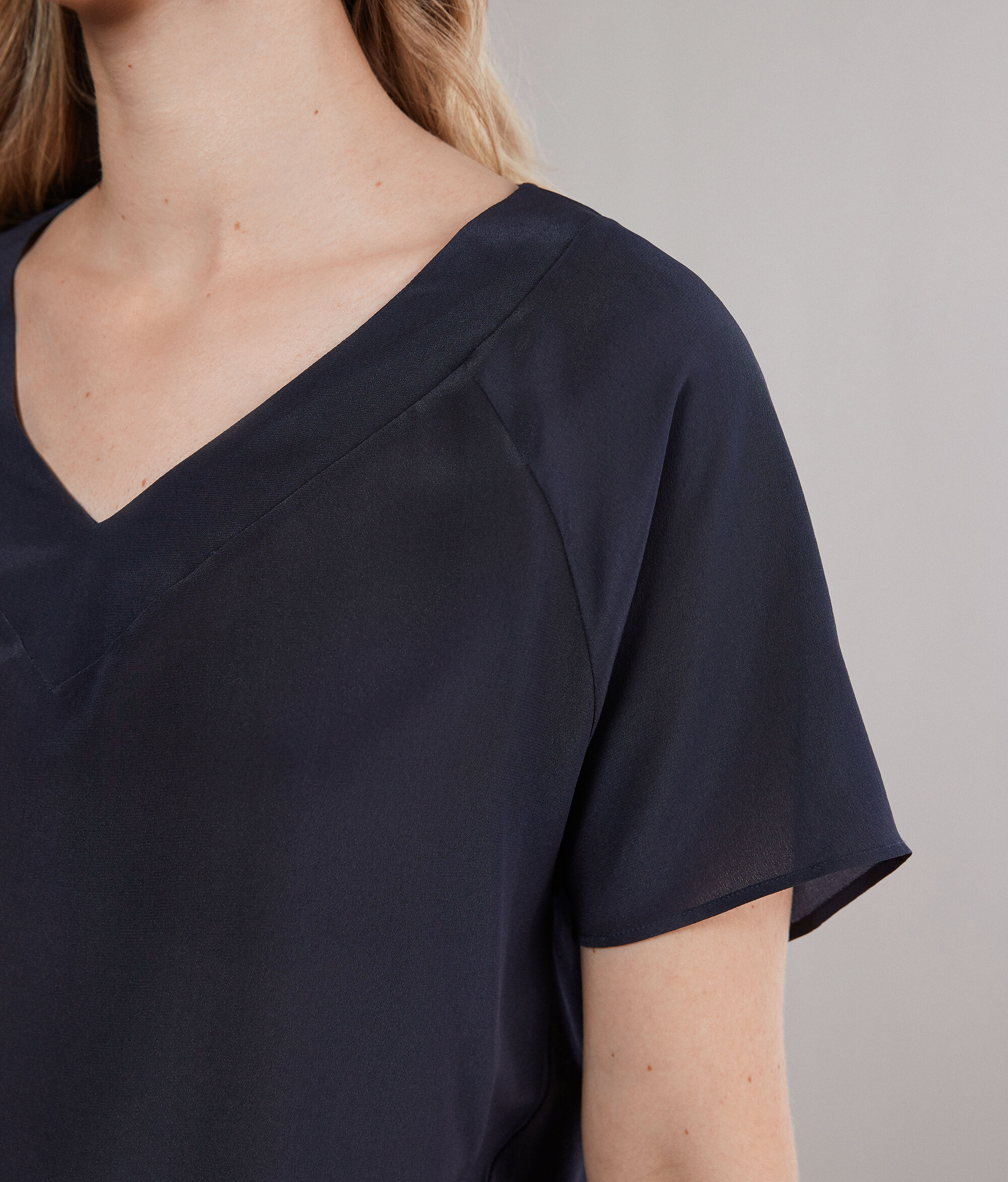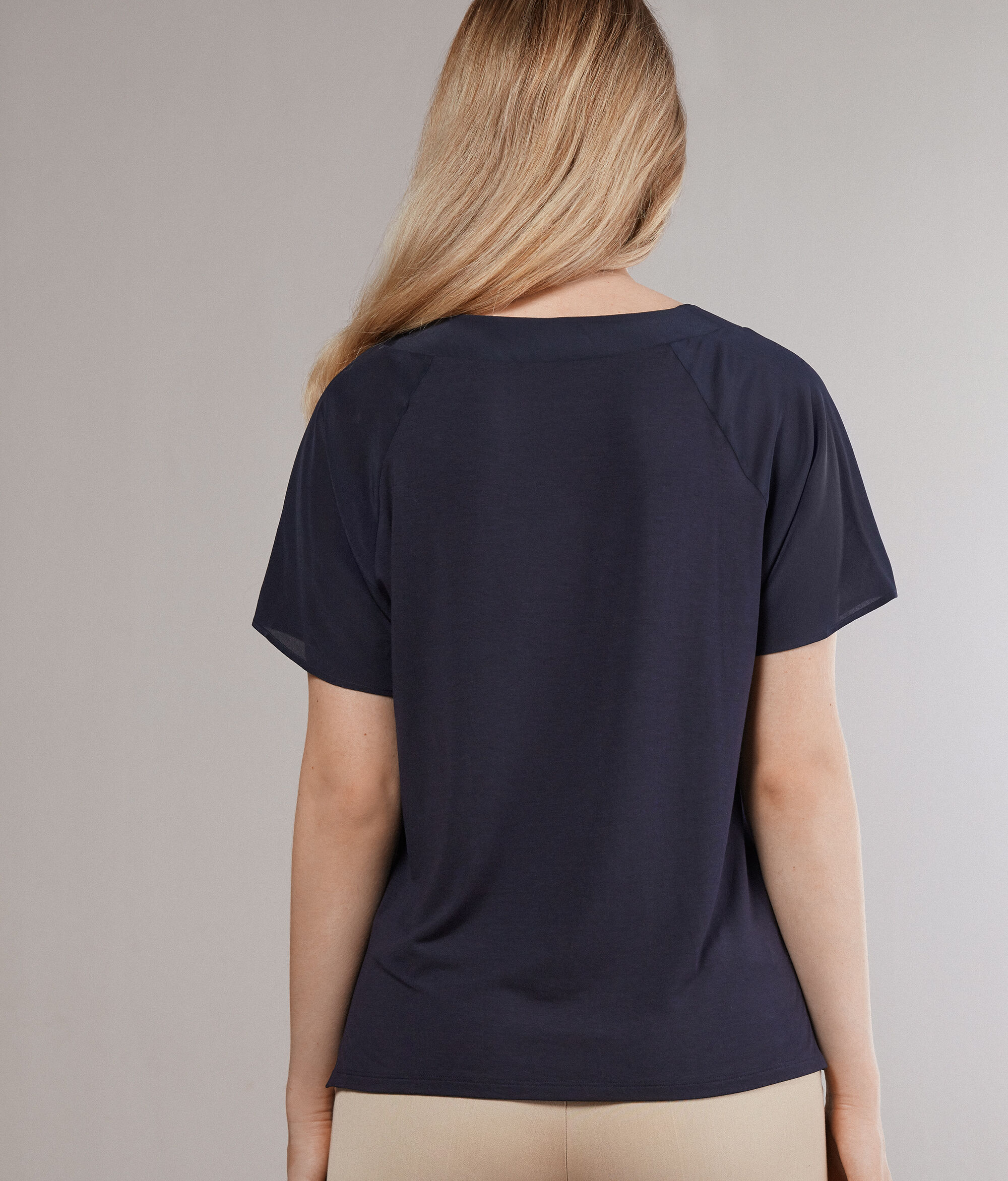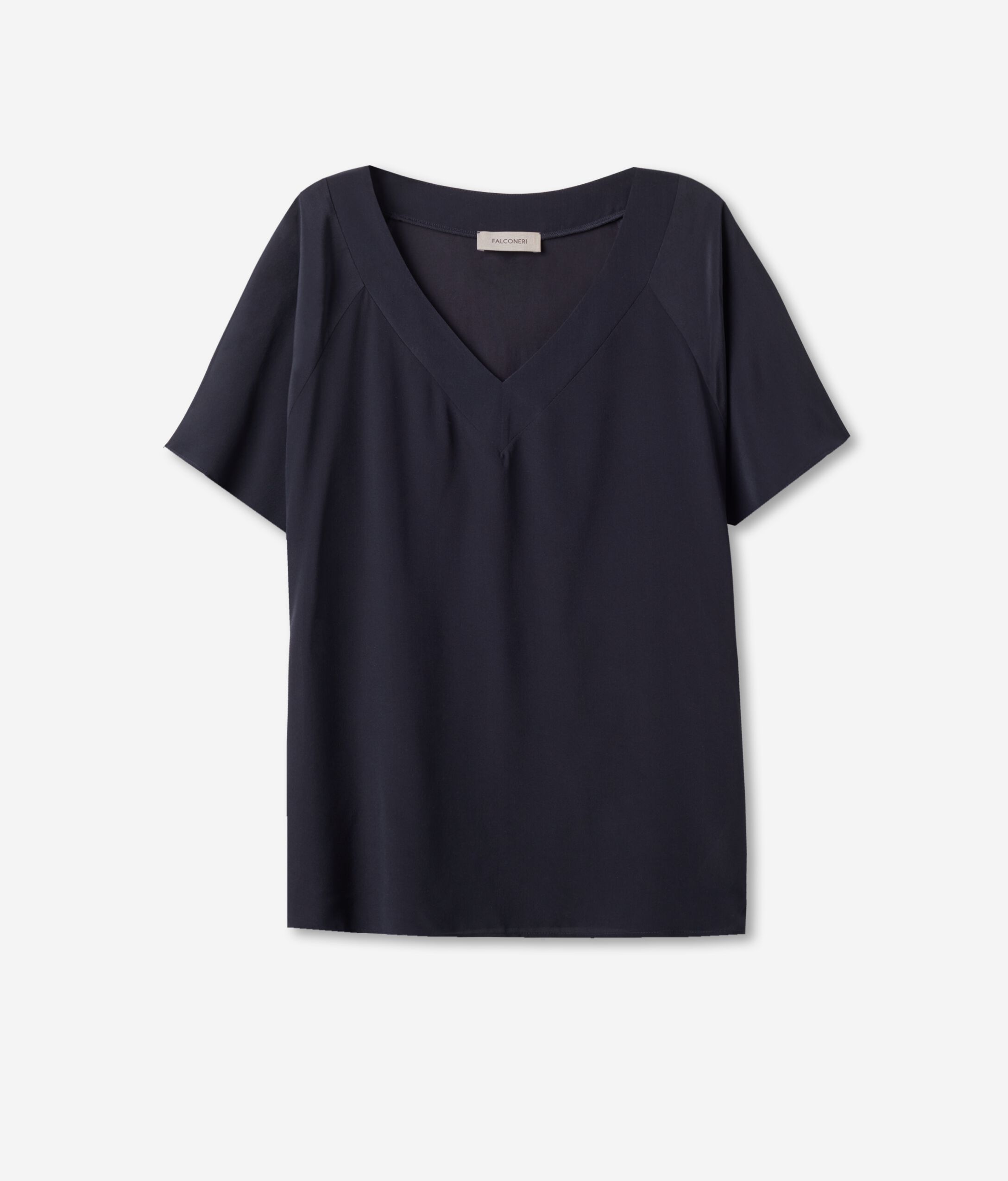 The balance of shapes and silhouettes characterizes the style of the Falconeri collection, having always harmonized style with the naturalness of fabrics. Silk combines harmoniously with the soft shapes of this V-neck T-shirt with raglan sleeves in crepe de chine on the front and modal on the back. A versatile and refined sweater for a woman’s wardrobe, ideal to complement day-to-day looks with elegance. Relaxed fit and regular length. Model is 179 cm and wears a size M Chest: 88 cm / Waist: 67 cm / Hips: 94 cm