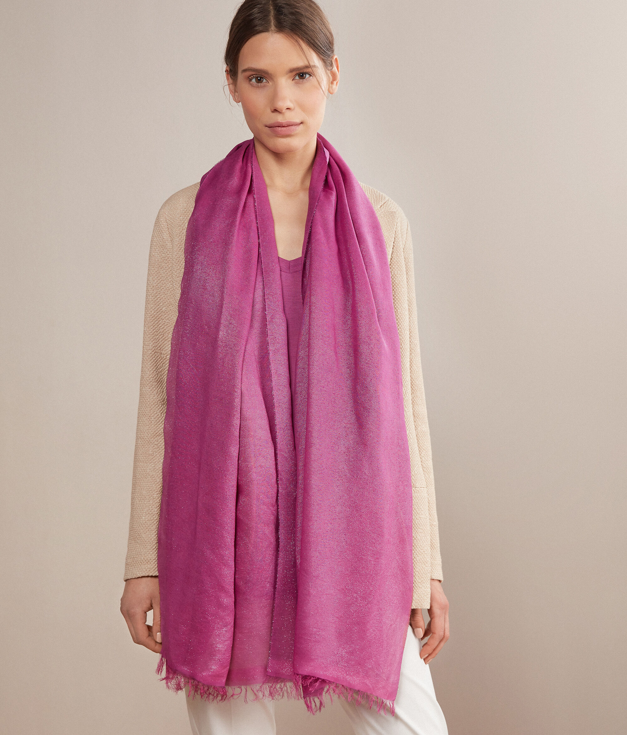 Chusta Falconeri wykonana z miękkiej, połyskującej wiskozy przeplatanej metalową nicią to niezbędny dodatek do każdej stylizacji. Różny poziom nasycenia kolorów tworzy niezwykle artystyczny efekt. Brzegi wykończone lamówką z delikatnymi frędzlami. Szerokość: 60 cm, długość: 180 cm.