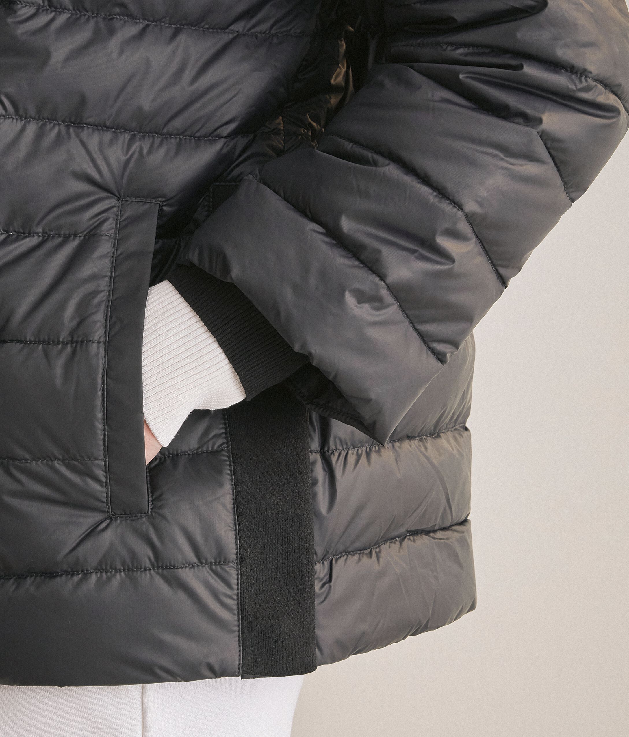 Dyskretny i subtelny styl marki znajduje odzwierciedlenie w nowoczesnej frenezji i ewoluuje w formy i proporcje stawiające na pierwszym miejscu uniwersalność i sportowy charakter, nie zapominając jednak o wysokogatunkowych materiałach. Kurtka puchowa z okrągłym dekoltem, z kaczego puchu, idealna na najchłodniejsze dni, wyrażająca współczesny, stroniący od zbytku styl Falconeri, który odwołuje się do dynamicznej i autentycznej kobiecości. Ukryte napy, dzianinowy ściągacz na mankietach, kołnierzu i bokach podkreślający fason. Modelka ma 179 cm wzrostu i nosi rozmiar MKlatka piersiowa: 88 cm / Talia: 67 cm / Biodra: 94 cm