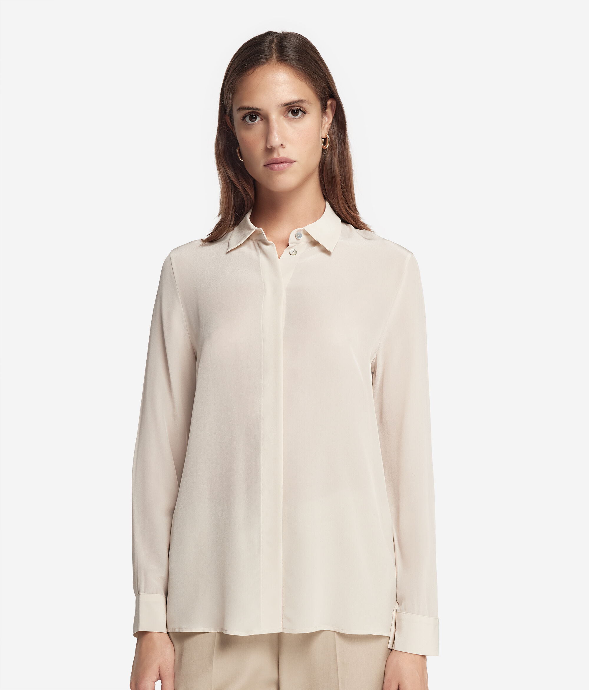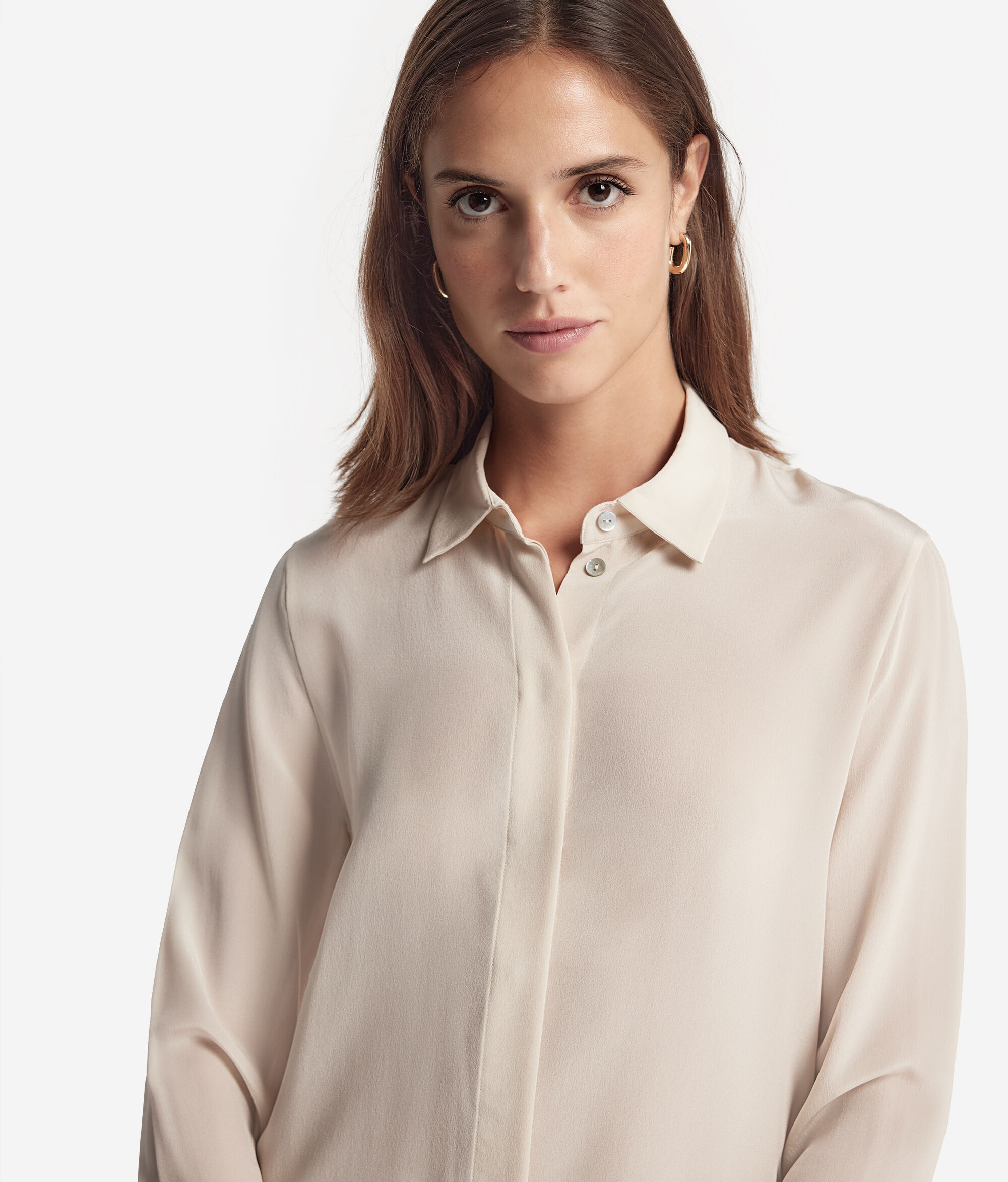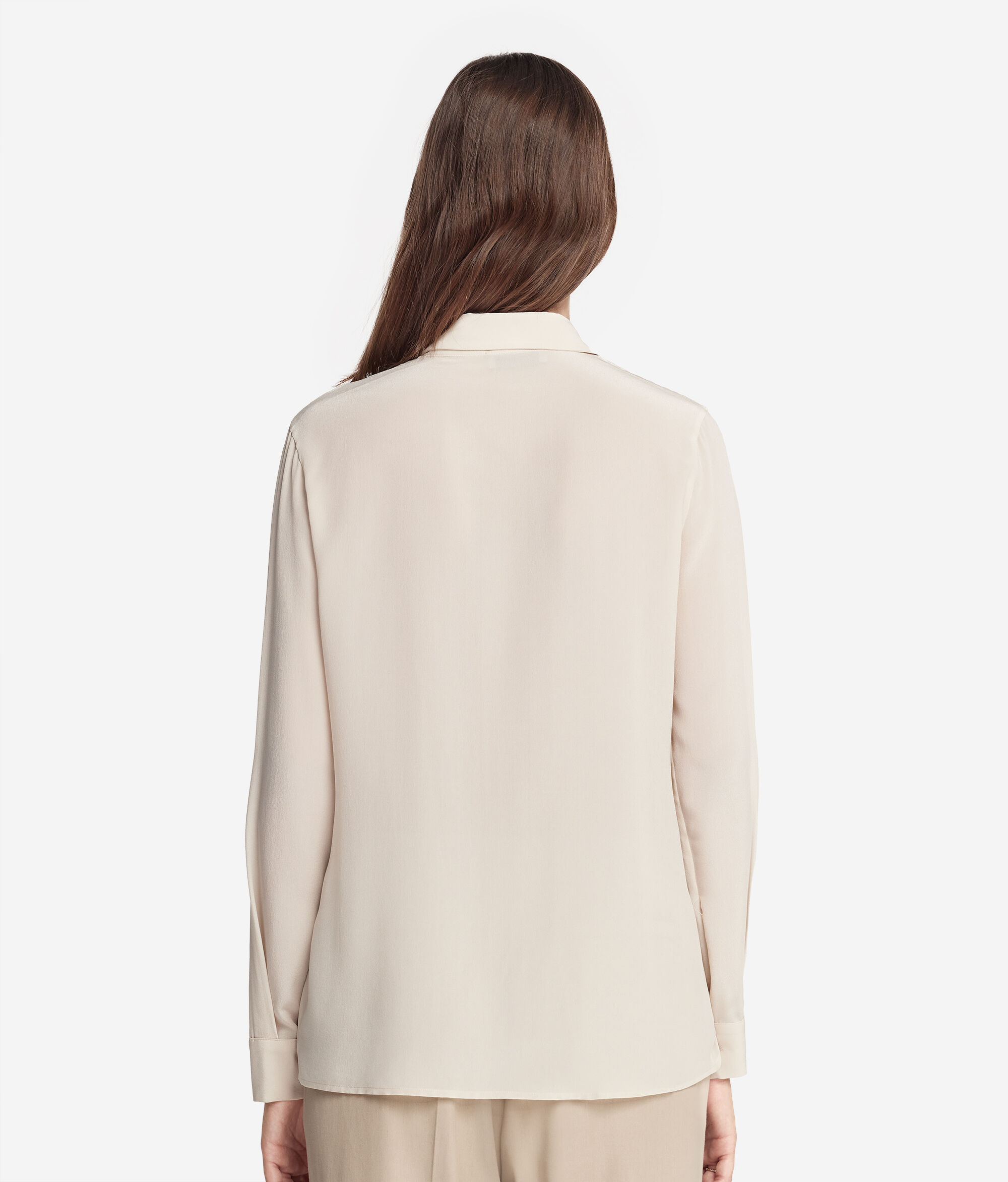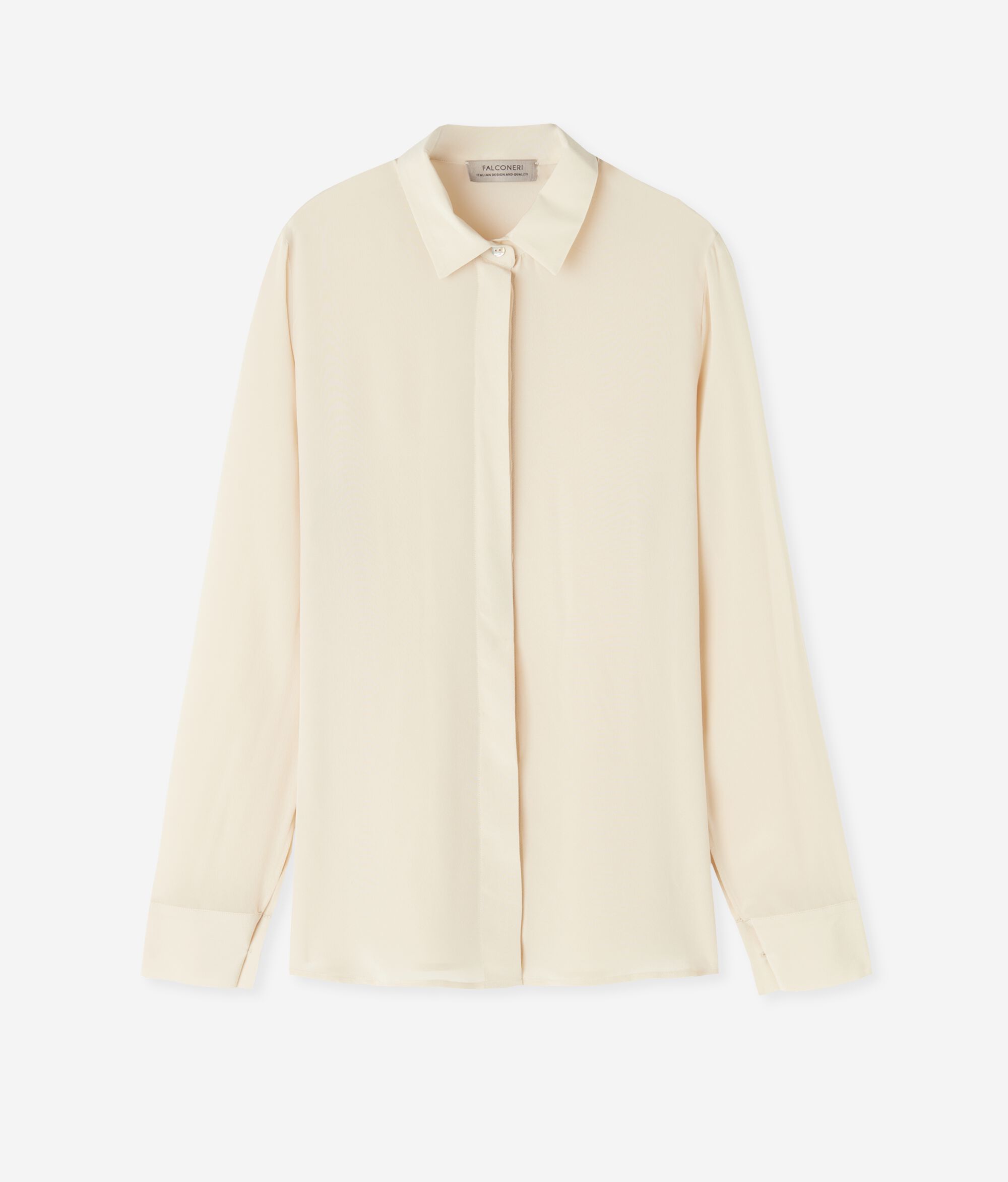 Il pregio della texture della pura seta esalta i volumi di questa camicia raffinata e moderna, che fluida avvolge ed esalta le forme femminili in una delicata morbidezza.