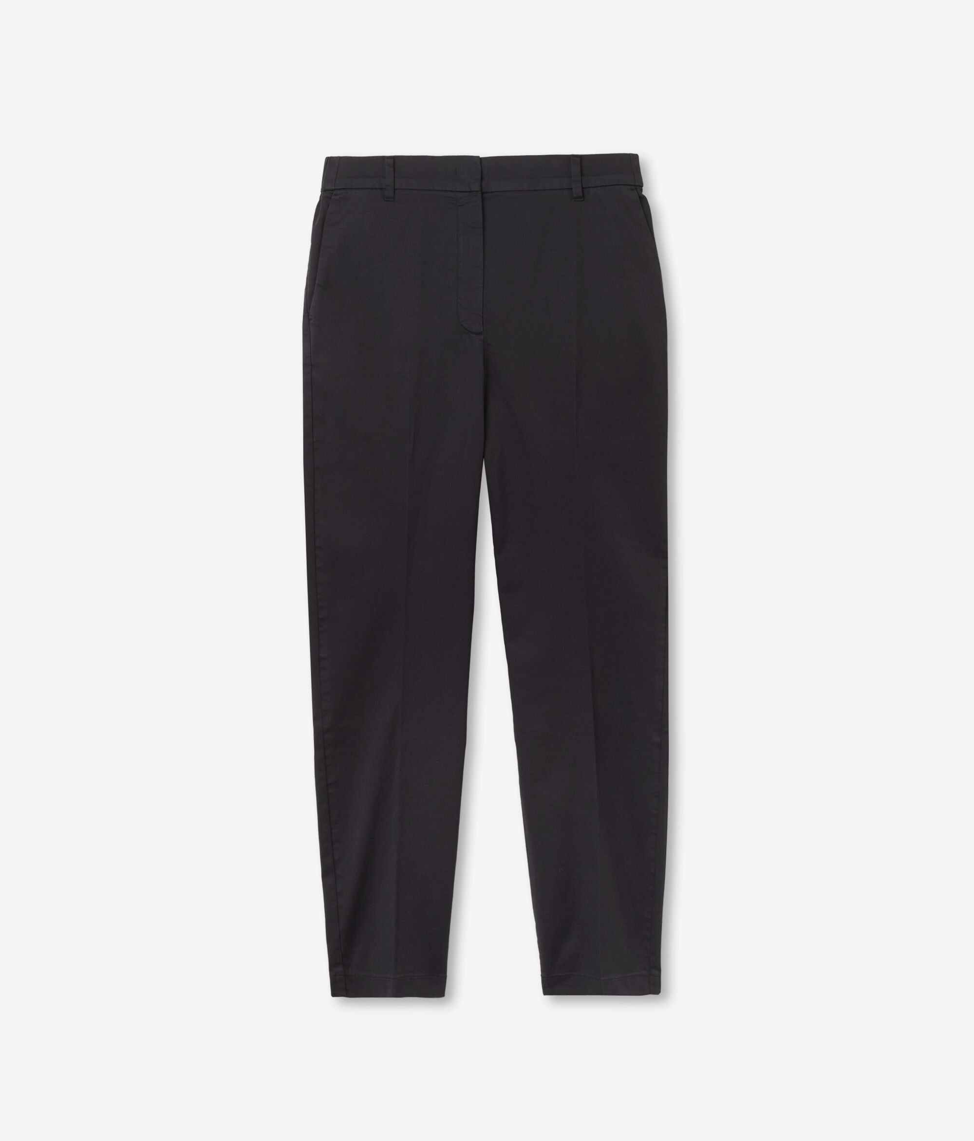 Il pantalone è un modello a sigaretta realizzato in cotone. Presenta una chiusura frontale con zip e con bottone a vista, completano il modello due tasche laterali aperte. Lo caratterizza un leggero arriccio posteriore e i passanti in vita. La sua vestibilità è slim.