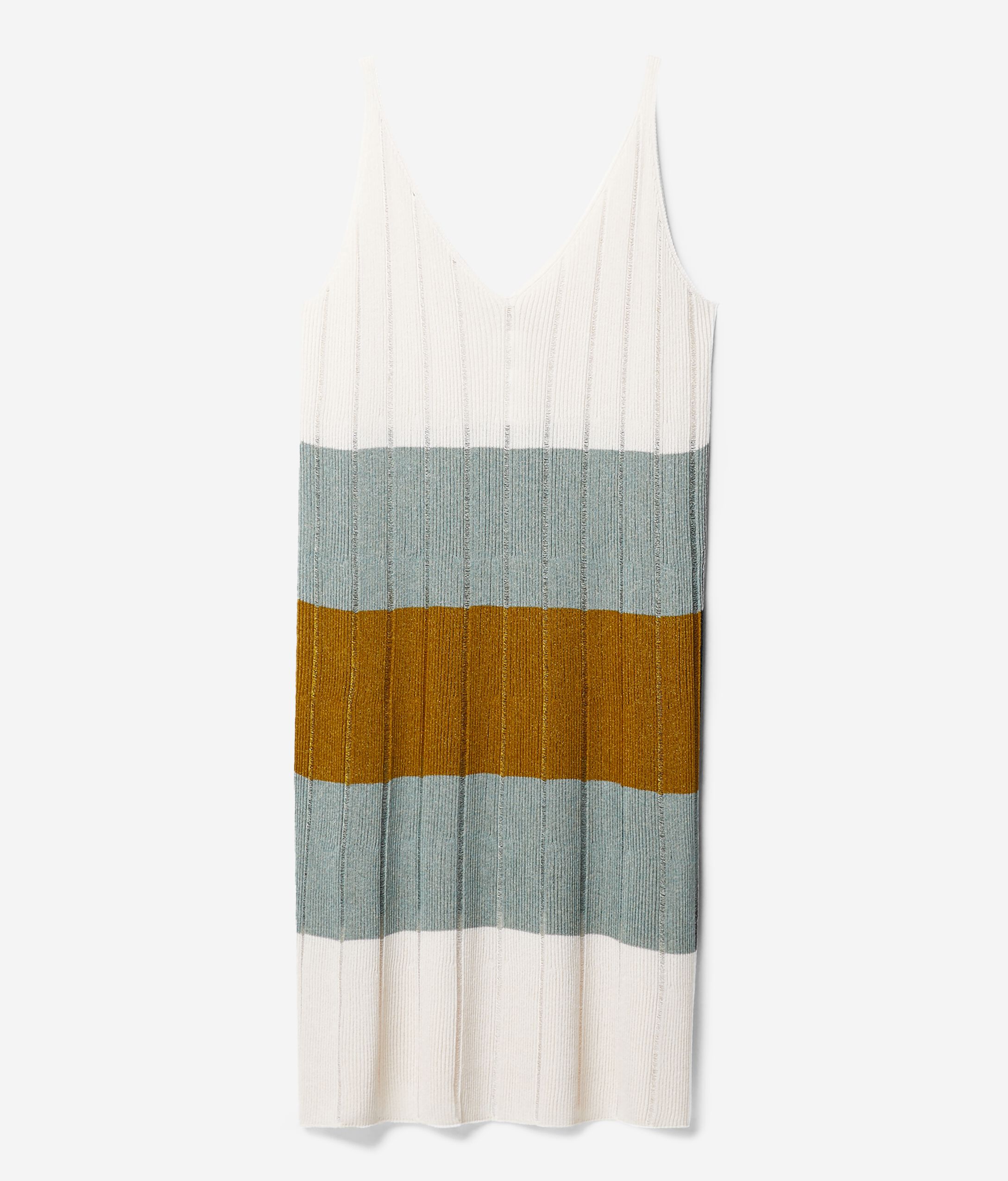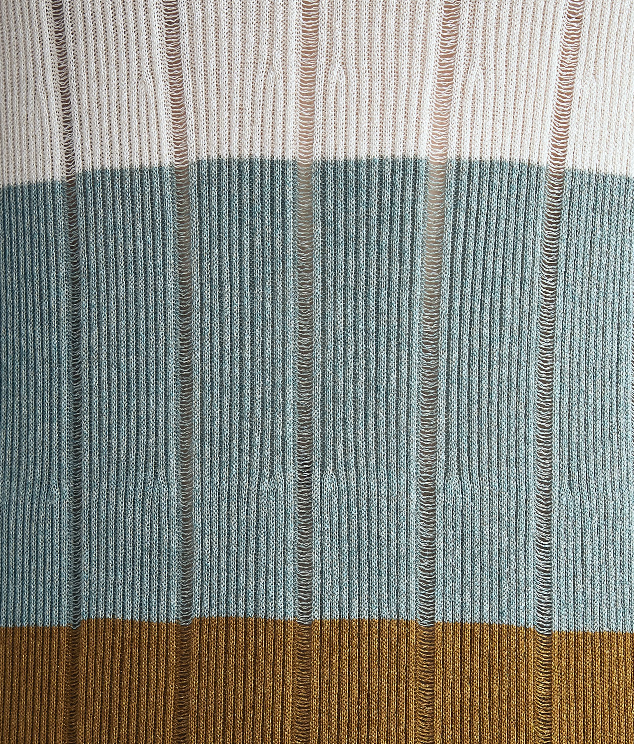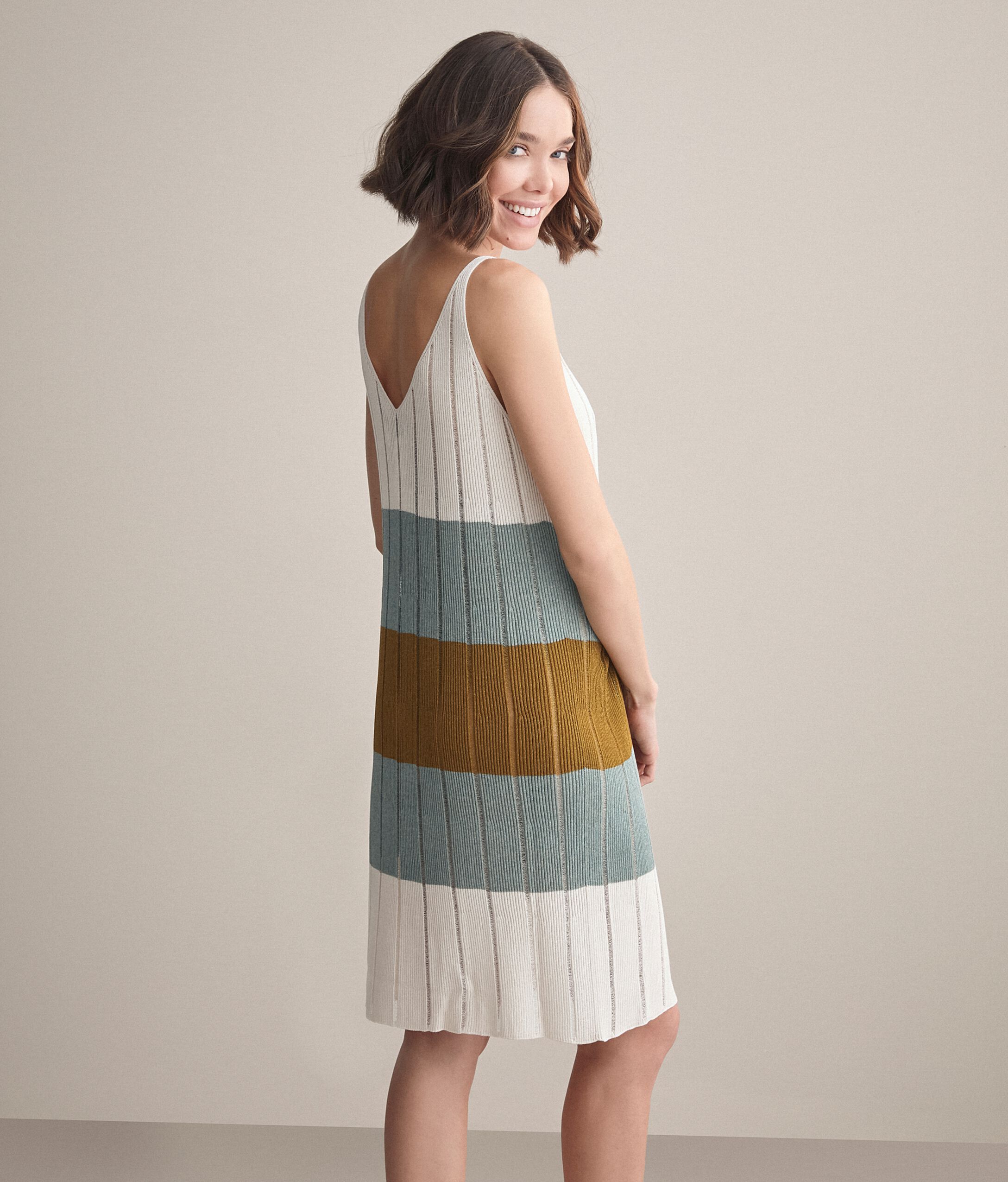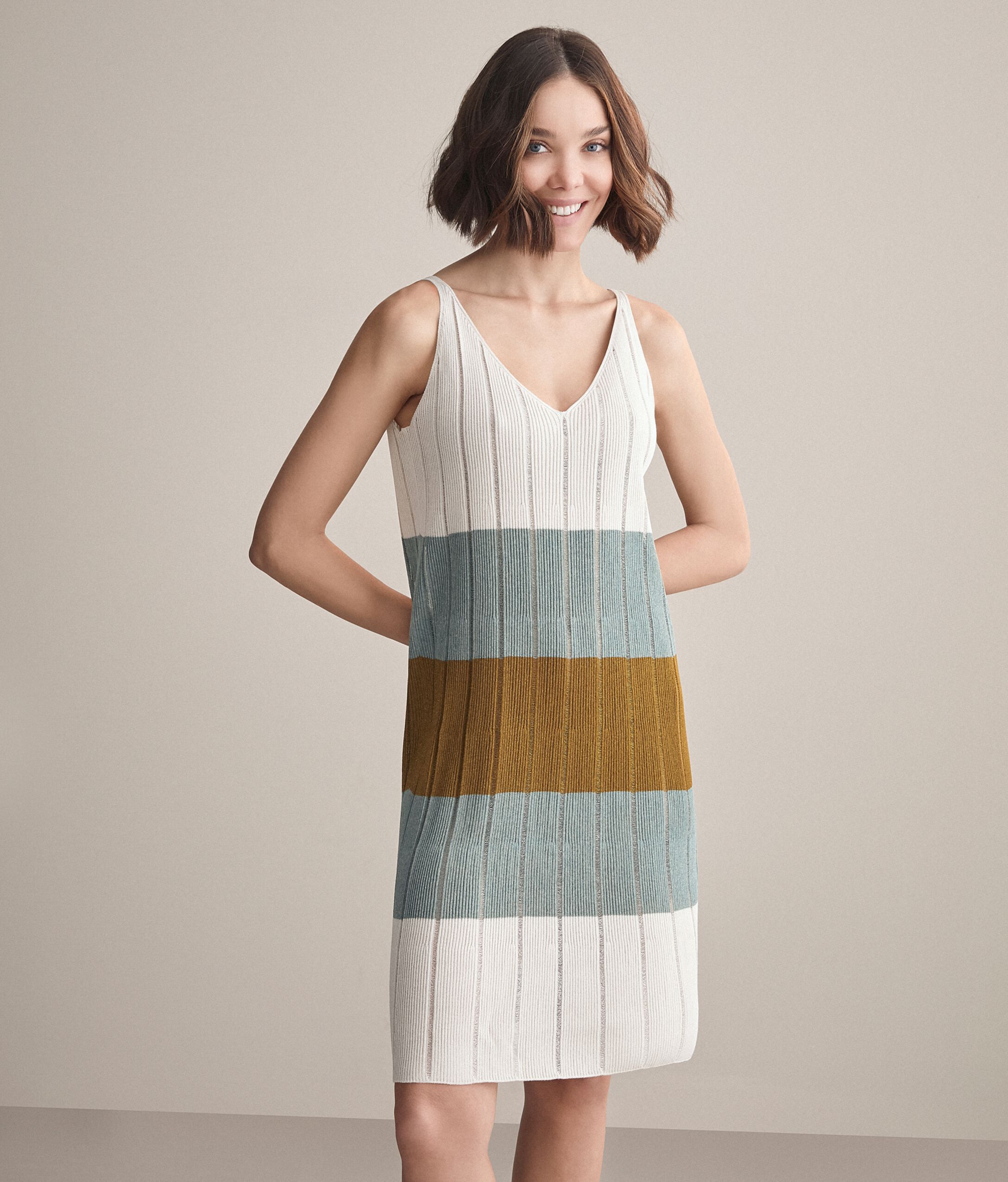 L'incontro tra pregiati materiali e lavorazioni innovative reinterpretano il gusto della maglieria Falconeri e danno vita a uno stile raffinato ed unico. Il nuovo abito corto senza maniche in filato di viscosa lucida offre una lavorazione di fili flottanti a righe che disegna una silhouette femminile e raffinata. La vestibilità è morbida e la lunghezza sopra al ginocchio. La modella è alta 179 cm e veste una taglia MPetto: 88cm / Vita: 67cm / Fianchi: 94cm