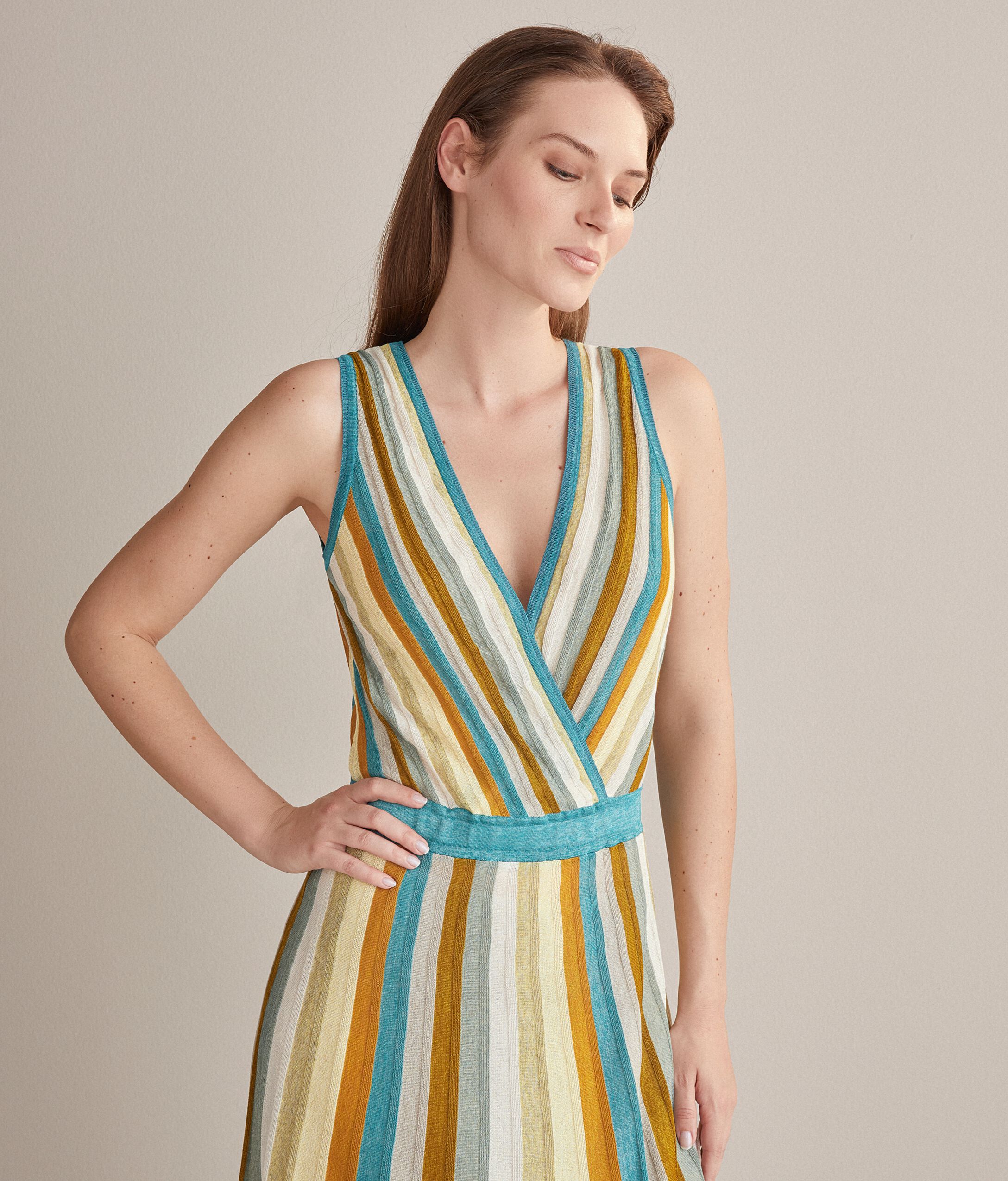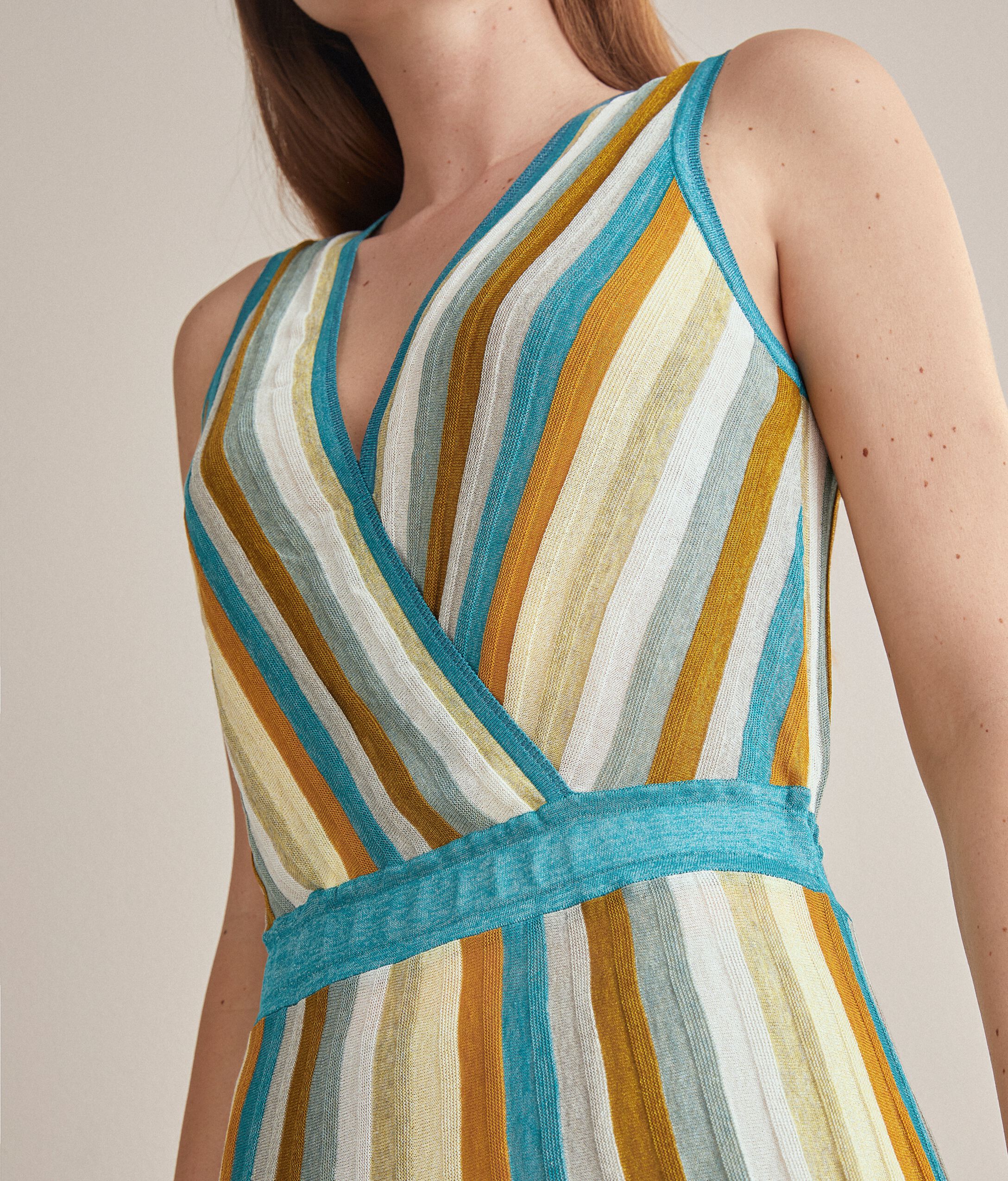 Un tocco romantico e femminile si coniuga ai materiali innovativi e dà vita ad un elegante ed al tempo stesso moderno, stile Falconeri. Il filato lucido di viscosa alterna accese nuance di colore ed accende un esclusivo gioco di coste. Il corpetto incrociato con la sua texture morbida e lucente percorre le linee di questo abito raffinato ed estivo e la gonna lunga, leggermente svasata al fondo, crea un armonioso movimento a ruota. La vestibilità è regolare e la lunghezza è alla caviglia. La modella è alta 179 cm e veste una taglia MPetto: 88cm / Vita: 67cm / Fianchi: 94cm