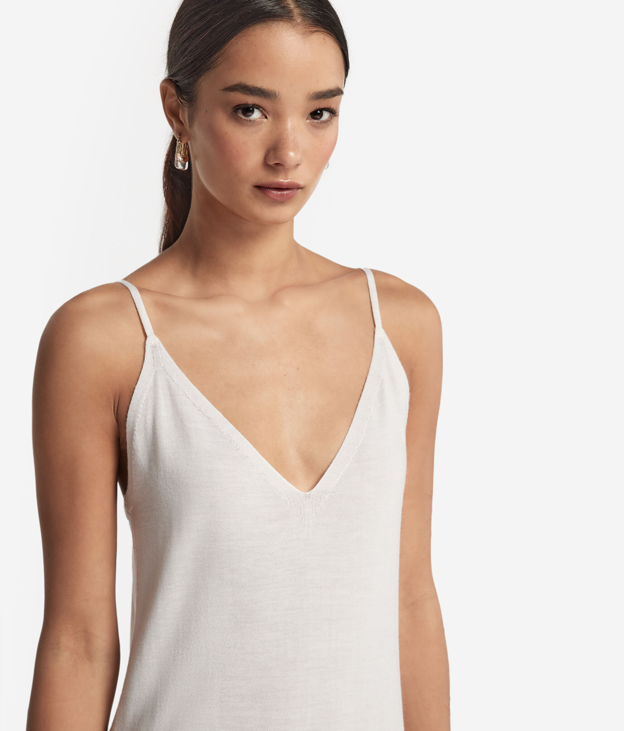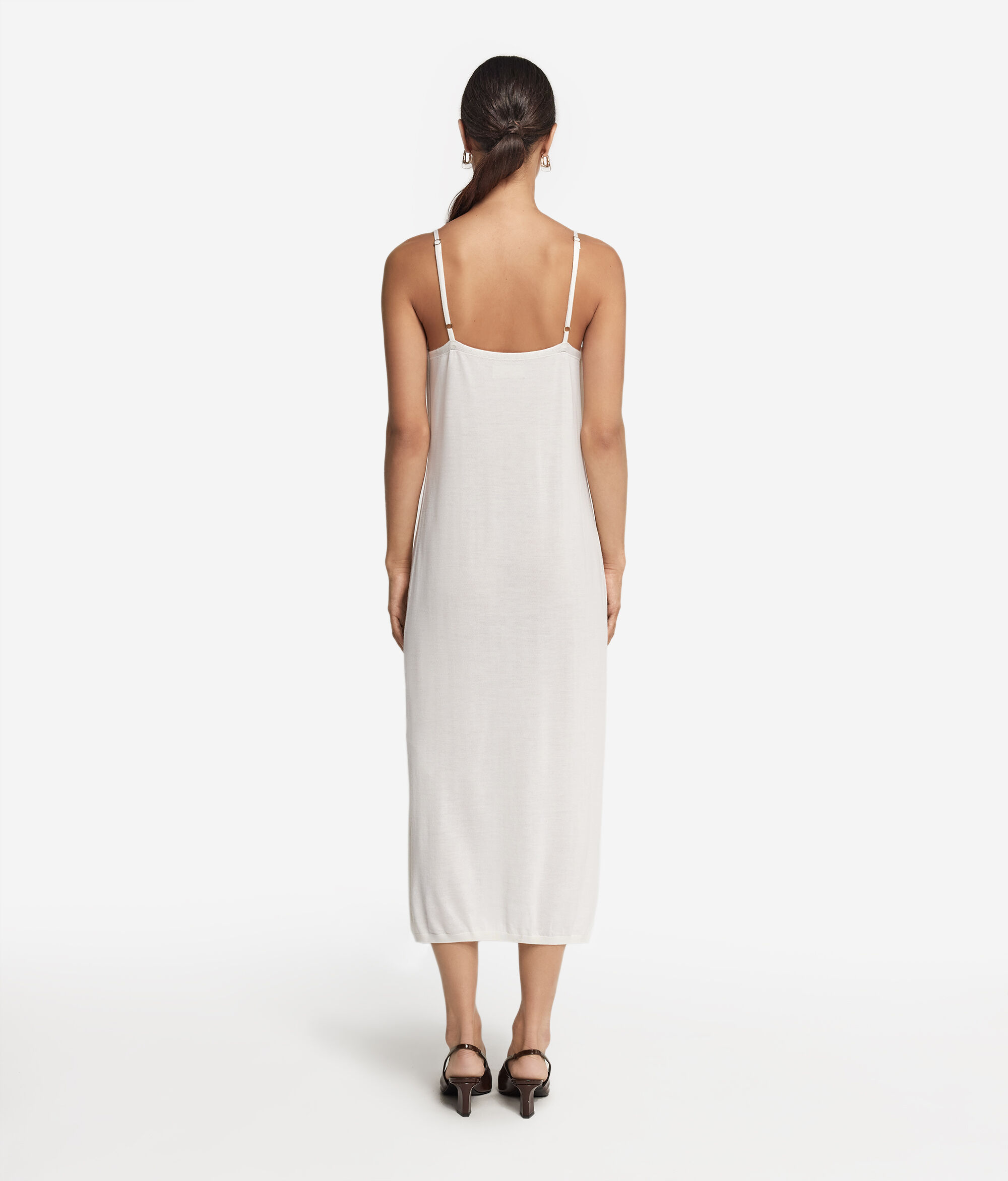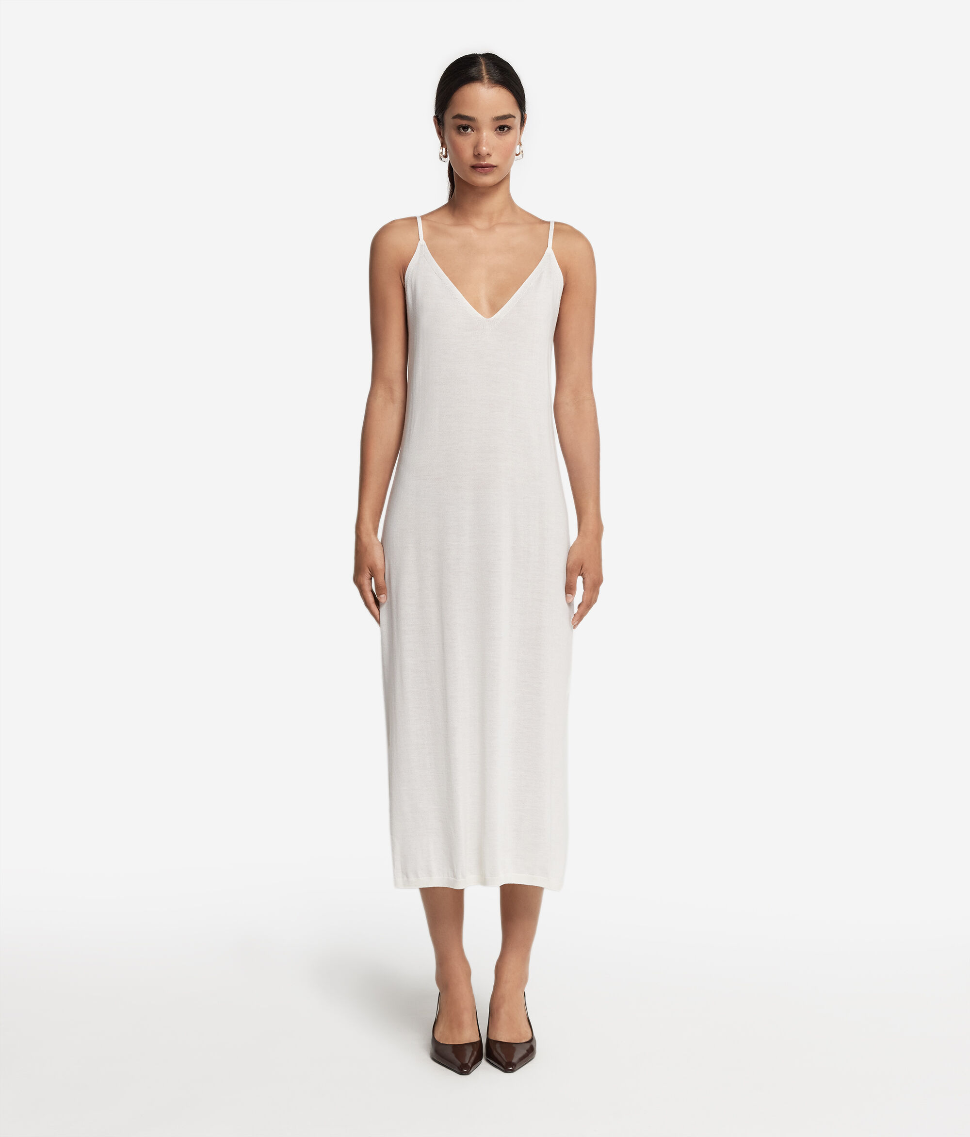 Questo raffinato abito sottoveste in Cashmere Ultrafine è caratterizzato da un elegante scollo a V e da una lunghezza che arriva fino sotto al ginocchio. Il modello dalle linee pulite e semplici esalta la silhouette, mentre gli spacchi laterali aggiungono movimento e femminilità alla figura. Le sottili spalline regolabili e i dettagli impreziositi da una finitura a costine donano un tocco di texture e definizione al design minimalista e contemporaneo.