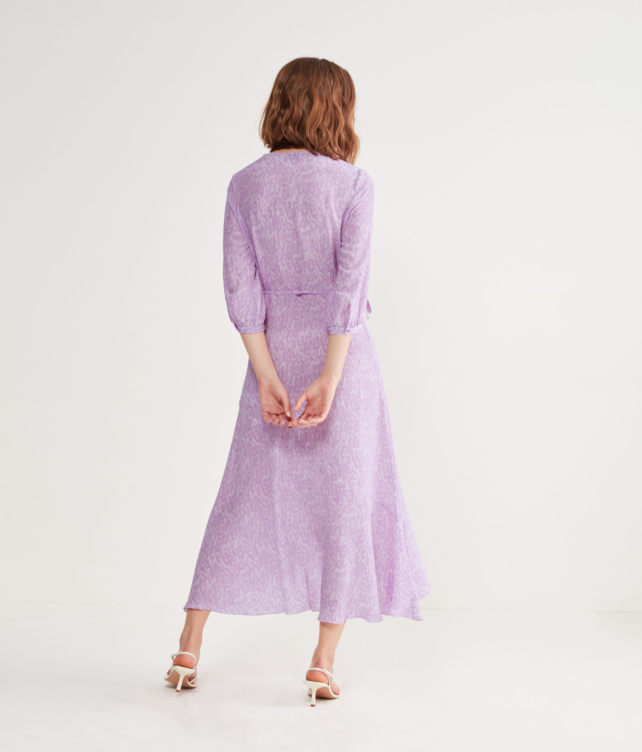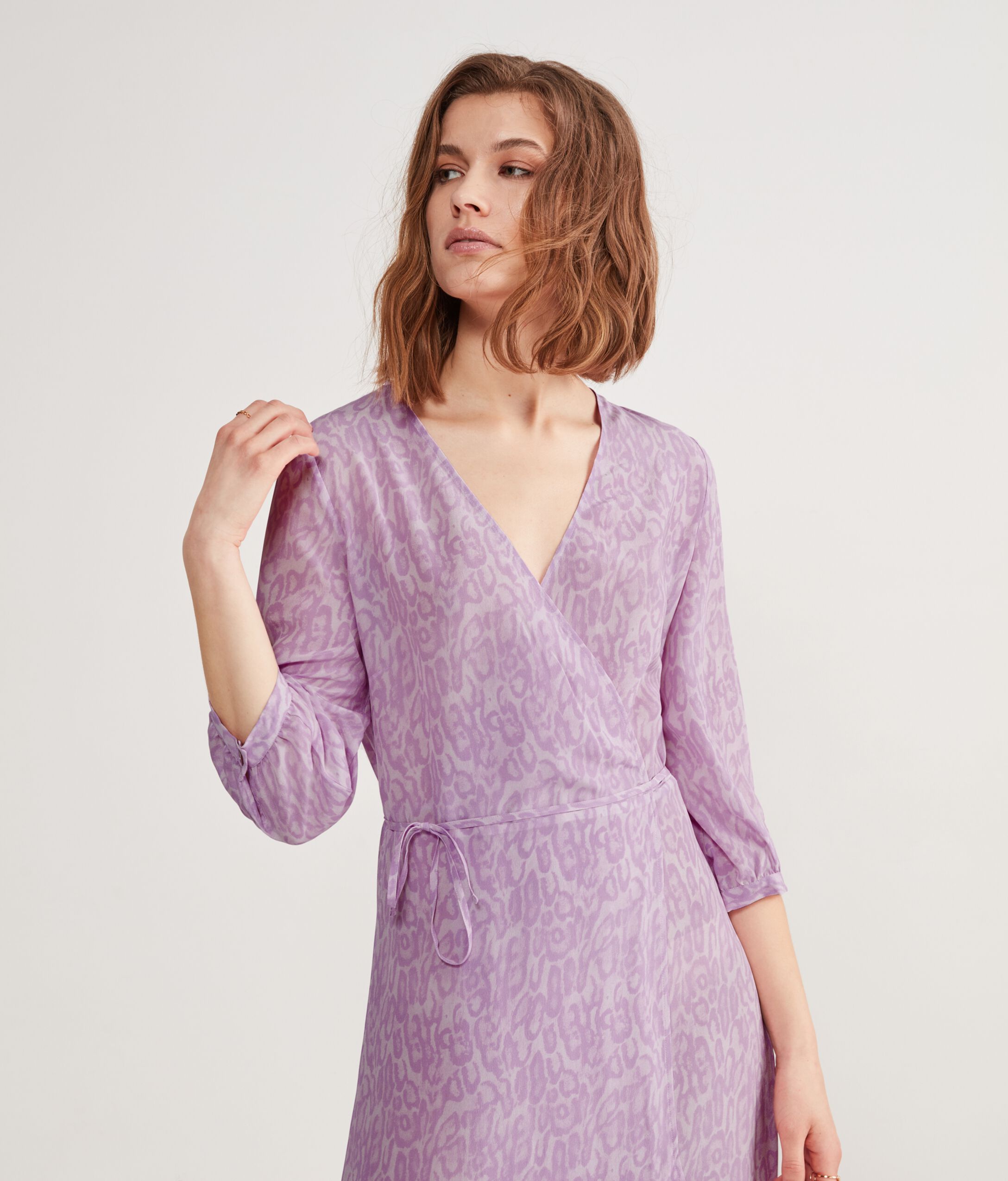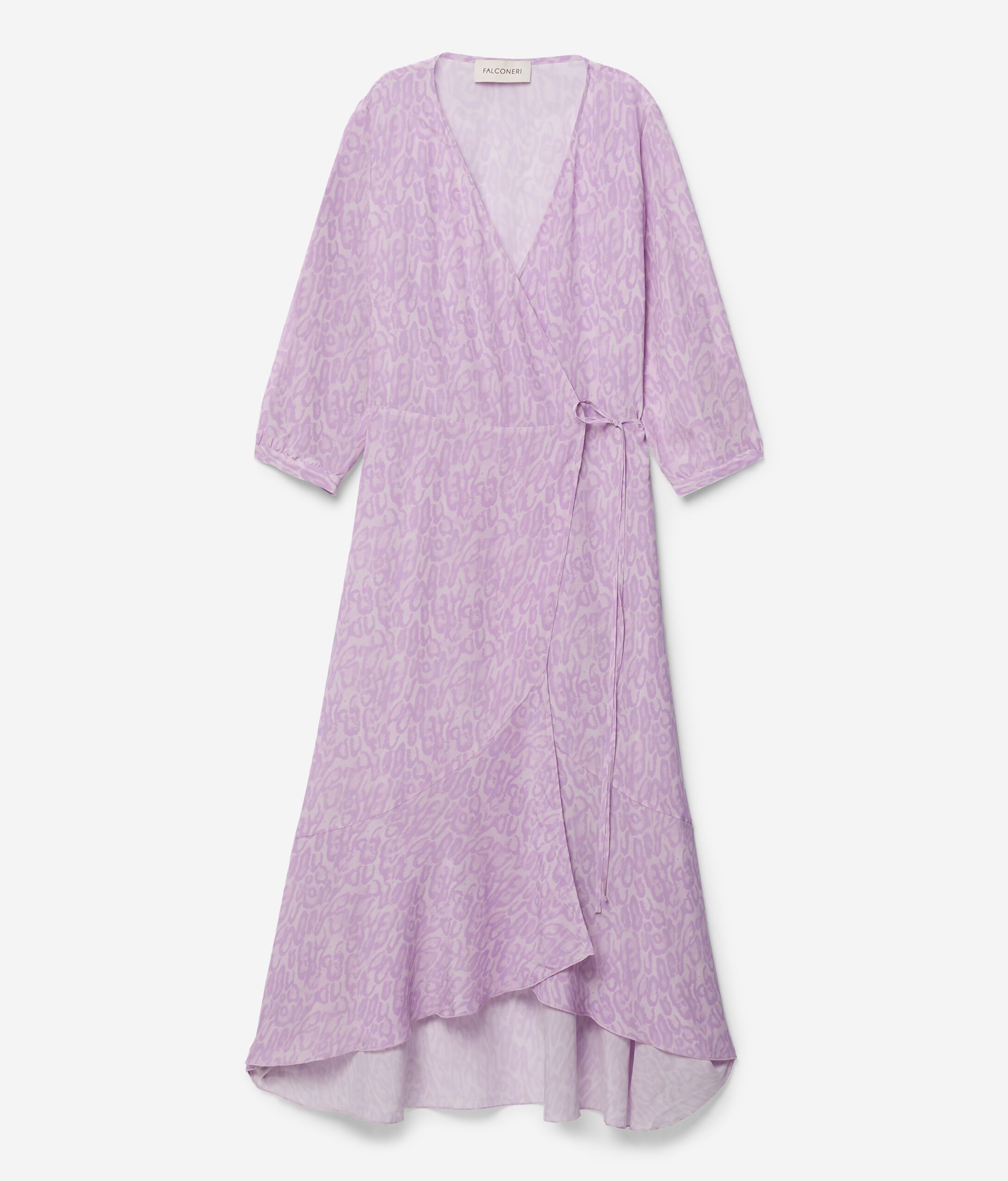 Abito in seta stampa animalier con scollo profondo e manica ampia. Presenta una chiusura a portafoglio che permette di regolare la vestibilità. La modella è alta 179 cm e veste una taglia M Petto: 88cm / Vita: 67cm / Fianchi: 94cm Petto: 88cm / Vita: 67cm / Fianchi: 94cm