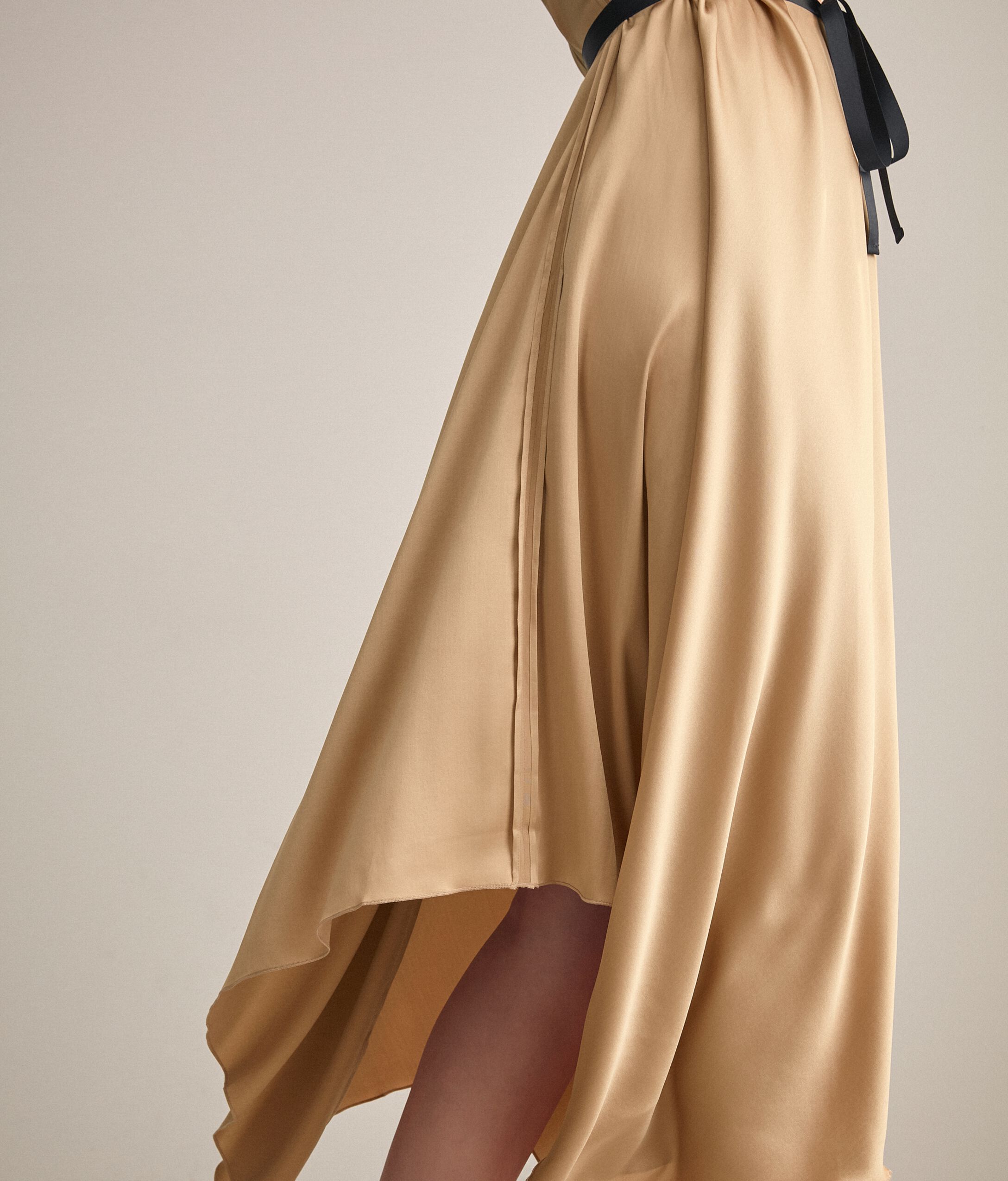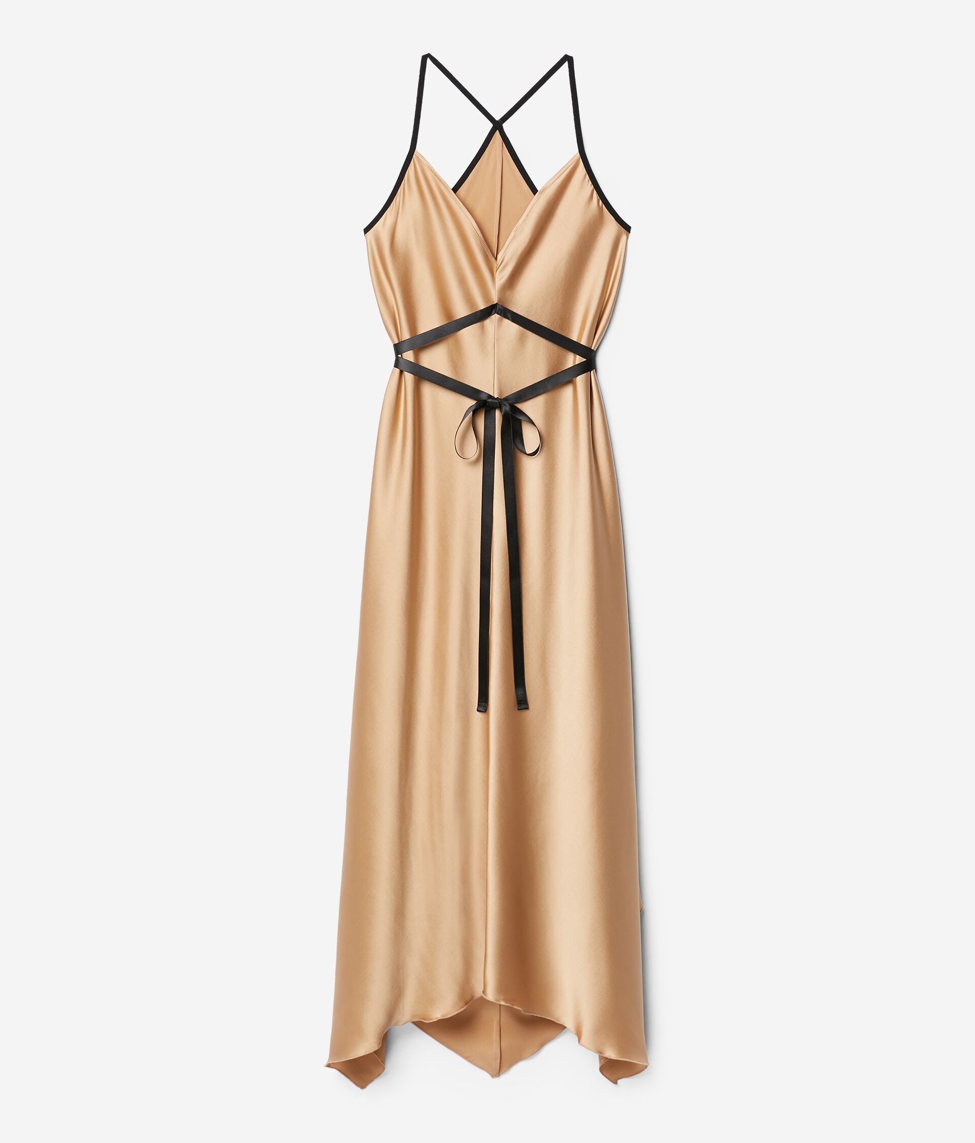 Atmosfere delicate e volumi fluttuanti armonizzano le linee spontanee di un'eleganza senza tempo, il raffinato abito di ispirazione retrò prende vita da una collezione scandita dall'amore per i materiali di pregio e dalla bellezza autentica. La texture morbida e lucente della pura seta percorre sinuosa le linee di questo abito femminile ed esclusivo. Il laccio sotto seno ne definisce le forme del corpino più aderente alla figura e permette di regolarne la vestibilità, la gonna prende slancio dal taglio svasato e si distingue per il fondo asimmetrico con punte laterali. La lunghezza è al polpaccio. La modella è alta 179 cm e veste una taglia MPetto: 88cm / Vita: 67cm / Fianchi: 94cm